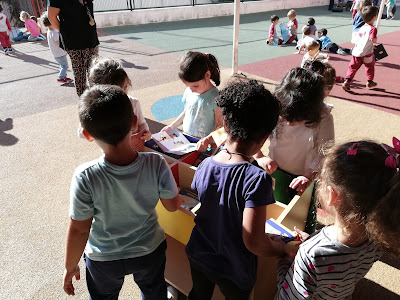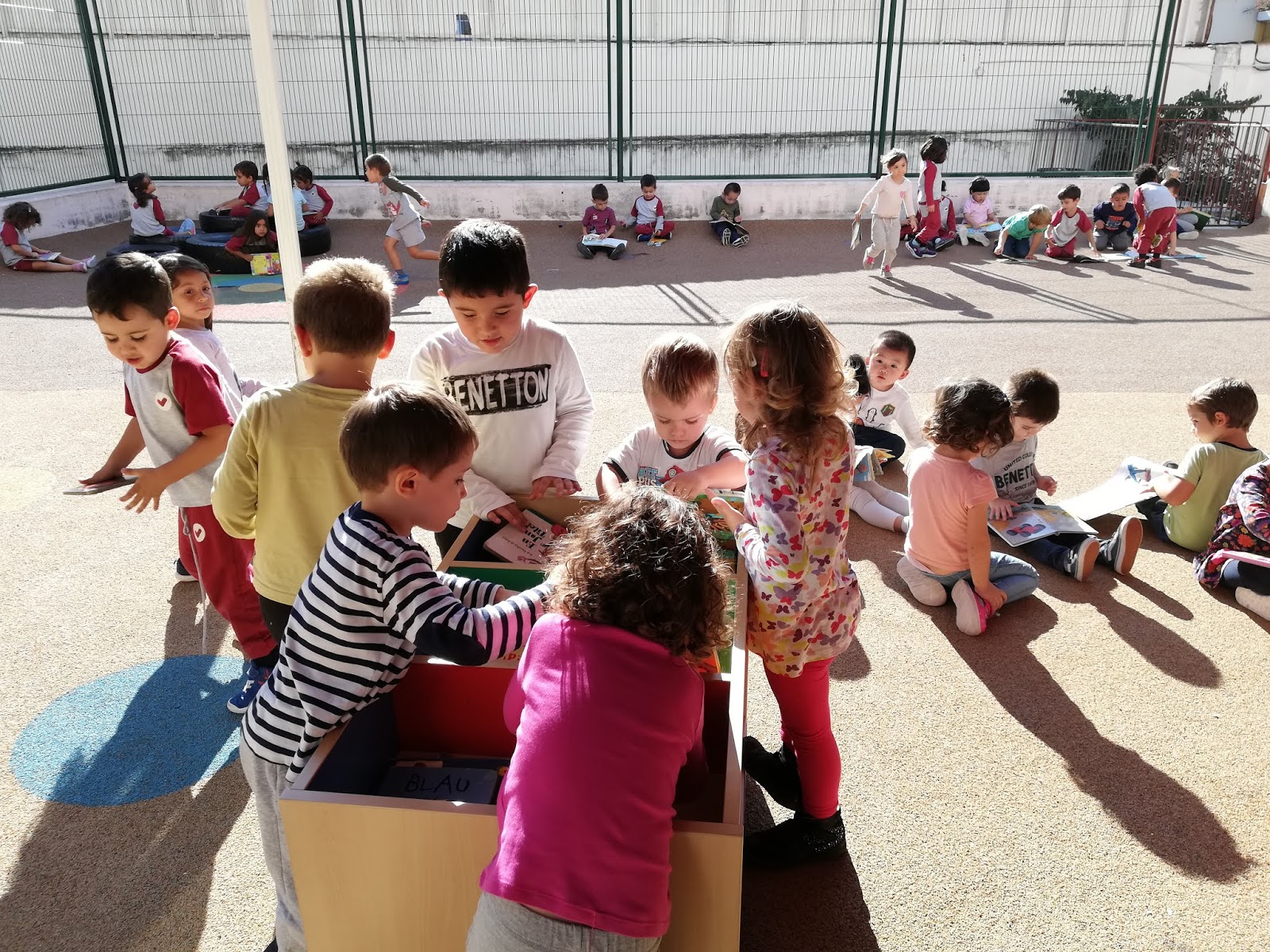 Ahir a la tarda vàrem treure les biblioteques d’aula al pati.