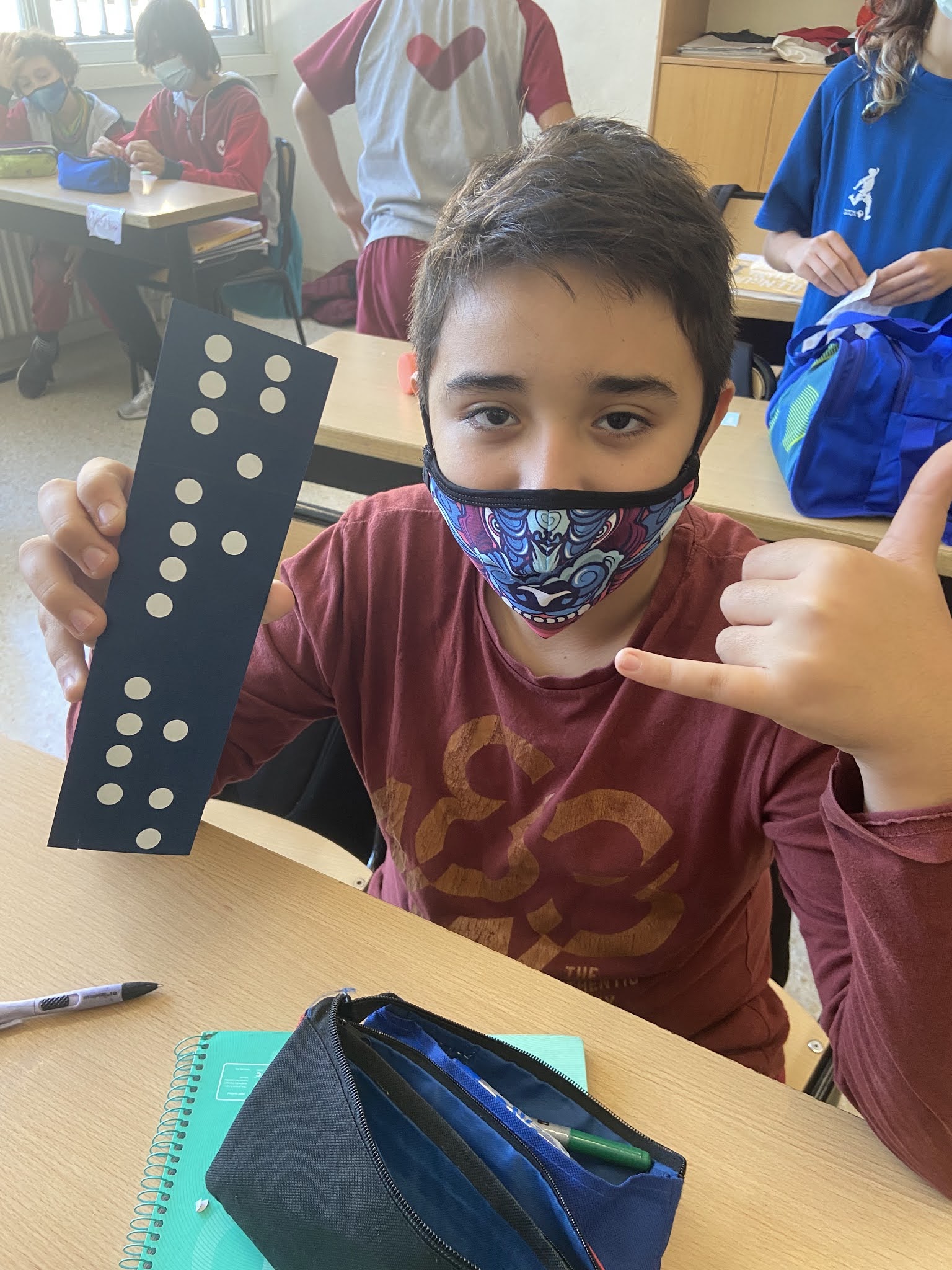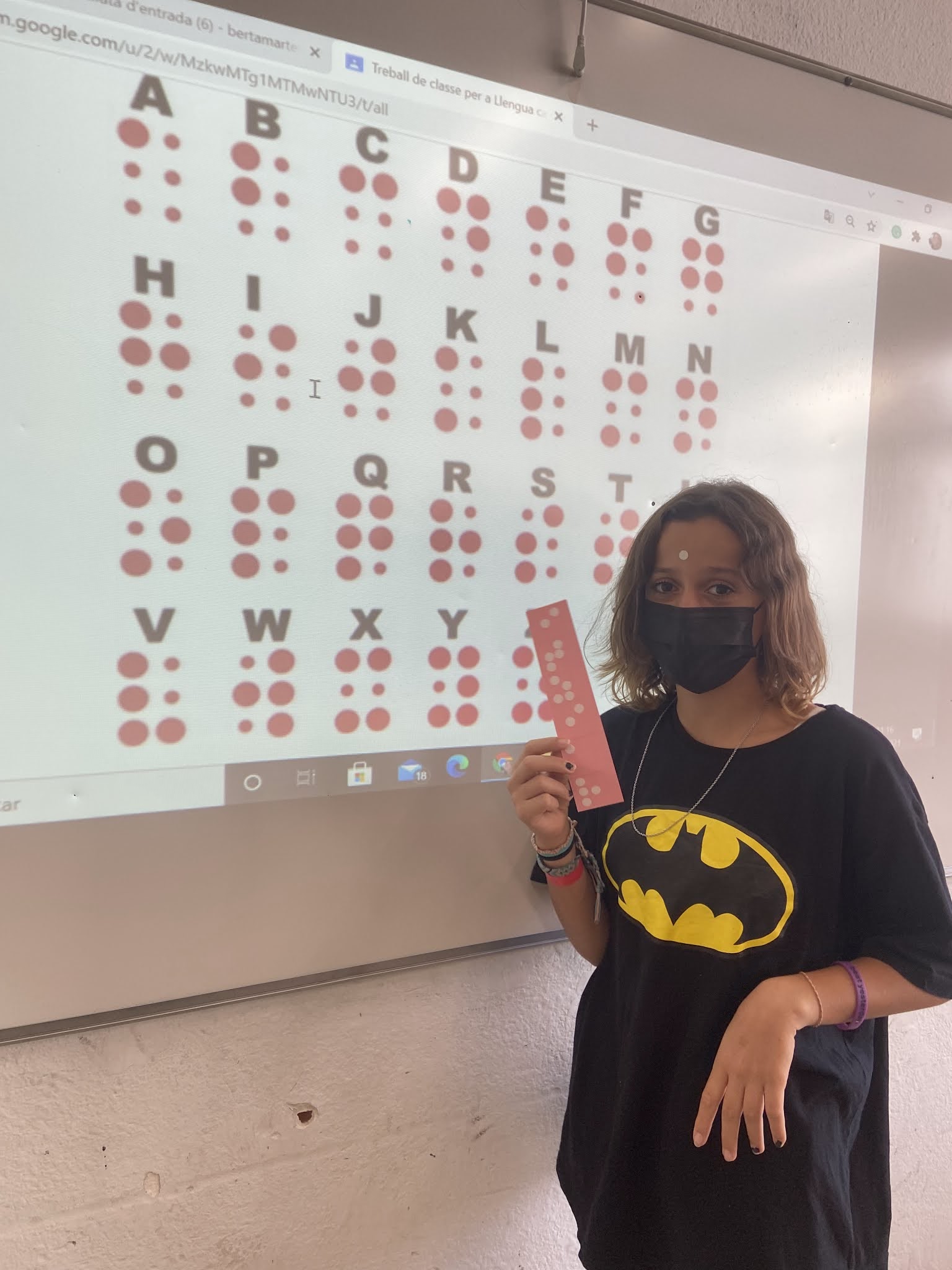 Els alumnes de 1r d’ESO, a la classe de català, han fet una activitat sobre el braille. Van llegir una lectura sobre el tema i després van fer uns punts de llibre. Els han fet de cartolina i gomets escrivint el seu nom seguint el sistema de lectura i escriptura braille. Us adjuntem els resultats finals!