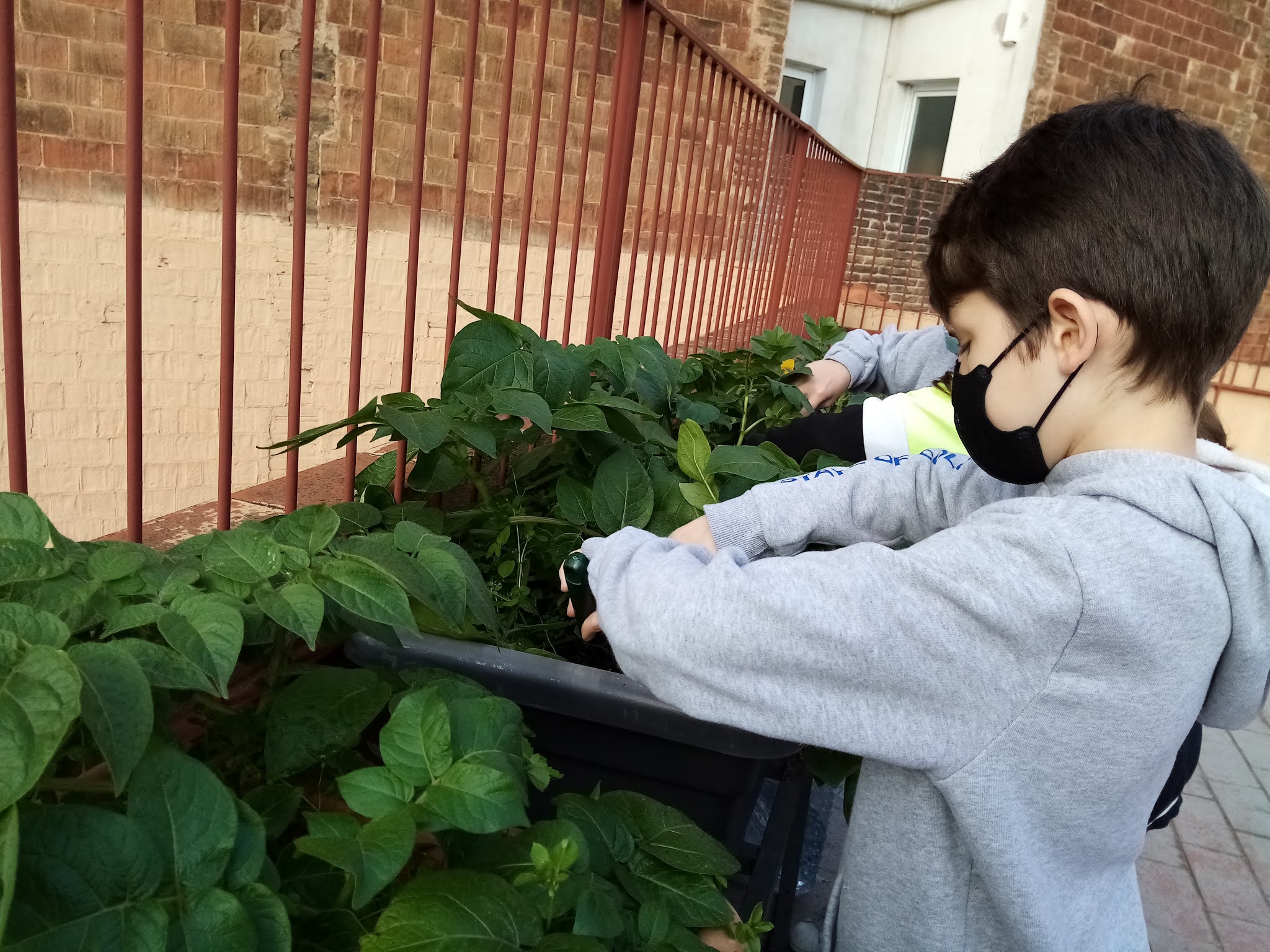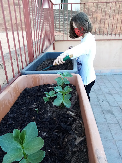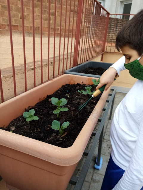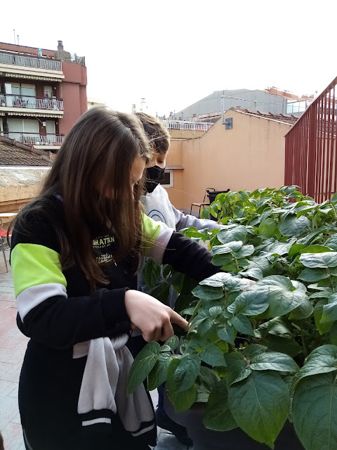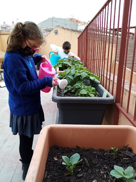 Les noies i nois de cinquè continuen tenint cura de l’hort. Hem vist com creixen les patates i les faves, i hem incorporat algunes novetats. Hem transplantat maduixeres, menta, curry, cibulet, romaní i lavanda.