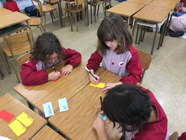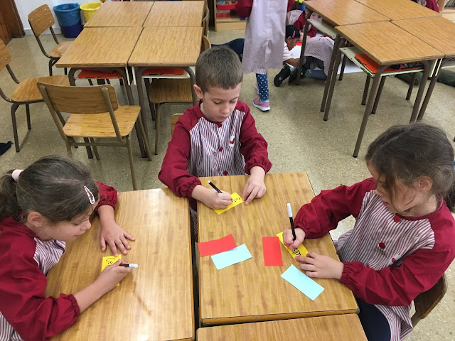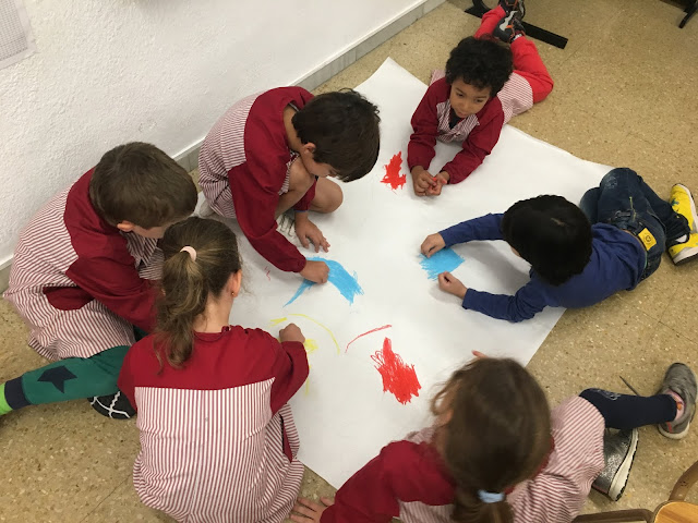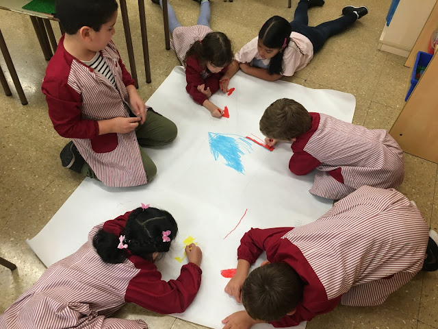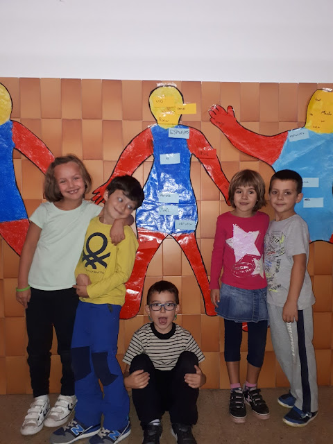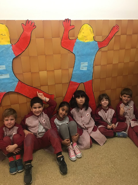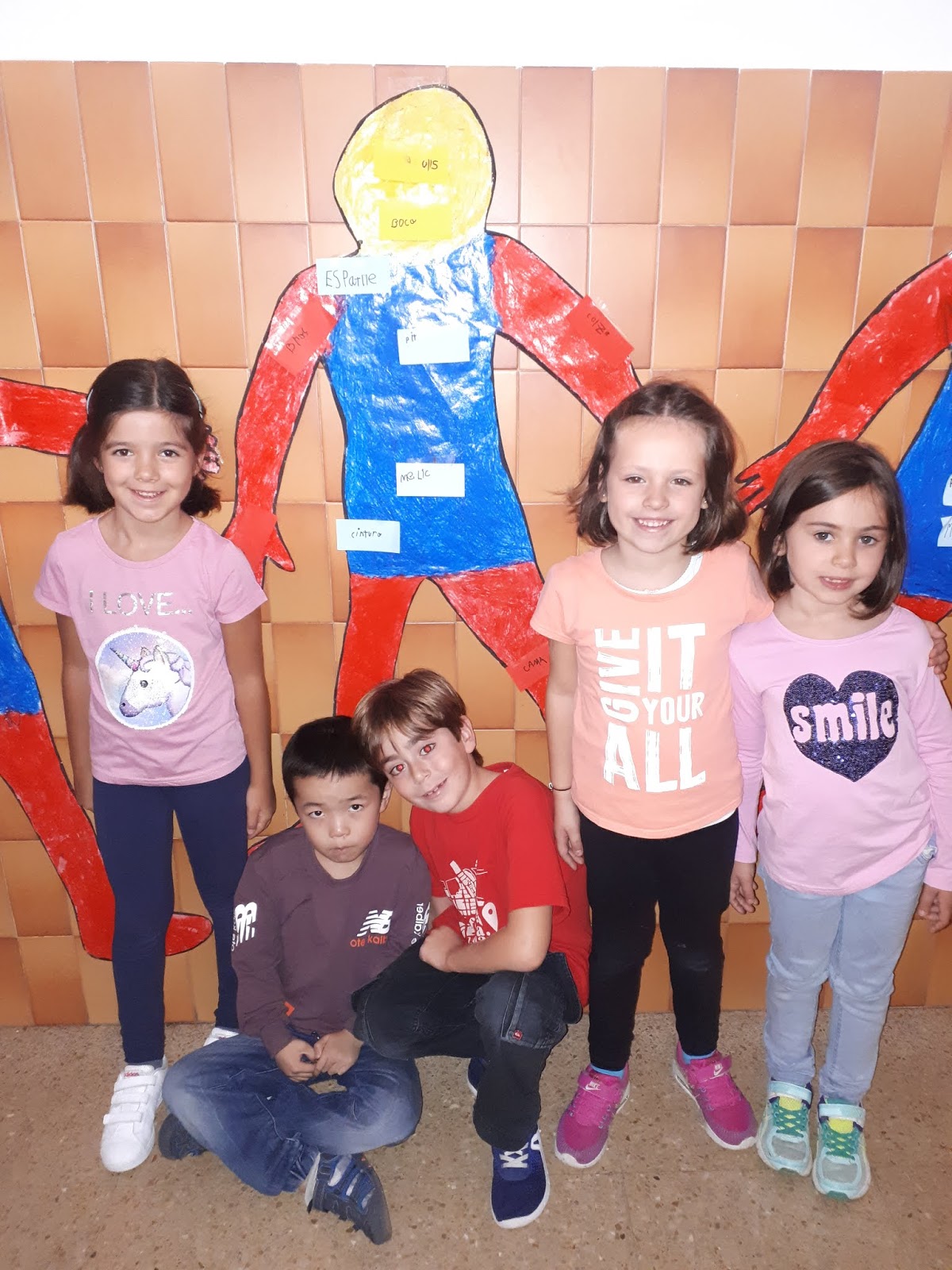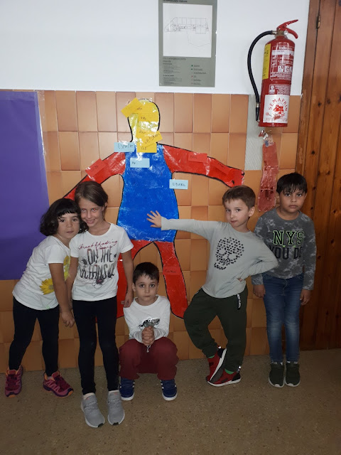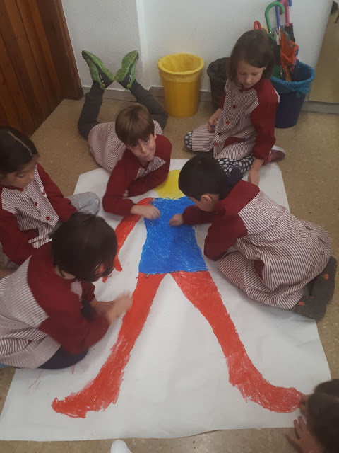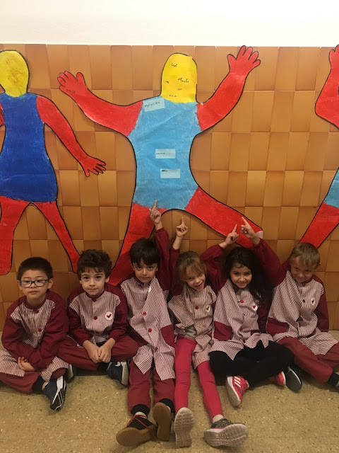 Com ja us vam dir fa uns dies, estem treballant l’Unitat Didàctica de “Com sóc jo”. Per tal d’interioritzar les diferents parts del cos i tenir clara la divisió en cap, tronc i extremitats, vam elaborar dibuixos de siluetes del cos en petits grups, per pintar les tres parts principals i escriure allò que hi trobem en elles.