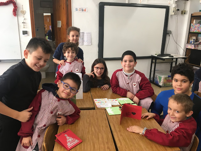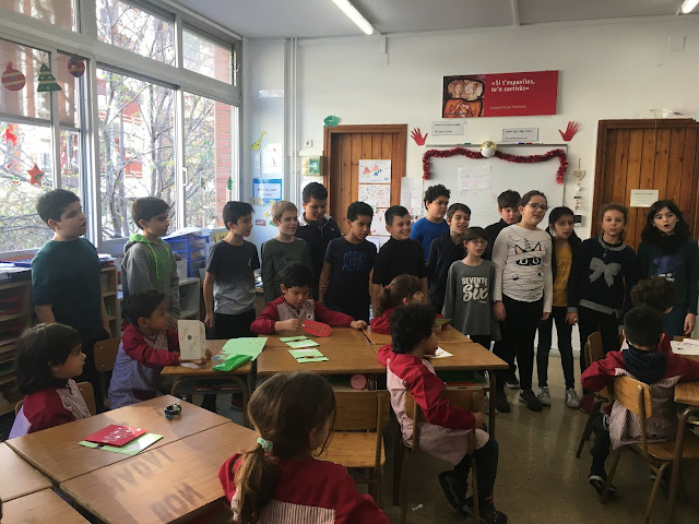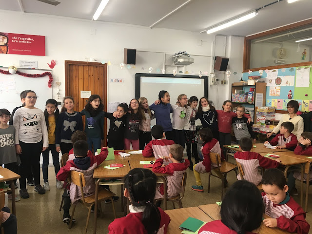 Ahir ens van venir a veure els nostres padrins! Quina emoció! Aquests dies havíem estat preparant una postal de Nadal per tots ells i elles, així que quan van arribar ens vam intercanviar dibuixos, felicitacions i postals. Vam compartir l’estona tot parlant i rient, no sabeu quin munt de coses tenen per explicar!!!