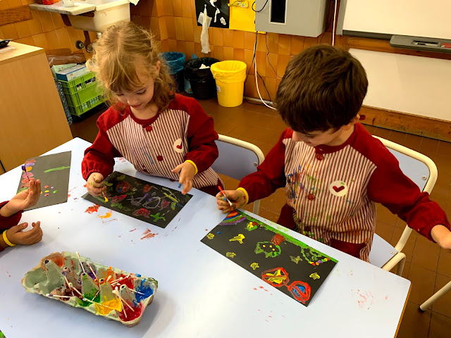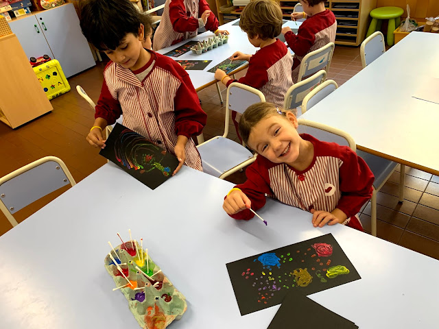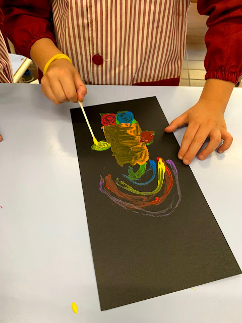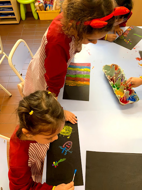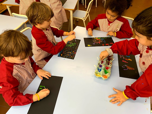 Pintem amb bastonets de cotó, d’aquesta manera treballem la psicomotricitat fina i aprenem que estris de la nostra vida quotidiana ens poden donar moltes possibilitats! Ho fem sobre una cartolina negre petita rectangular per ressaltar el color i treballar amb una mida diferent de la que estem acostumats.