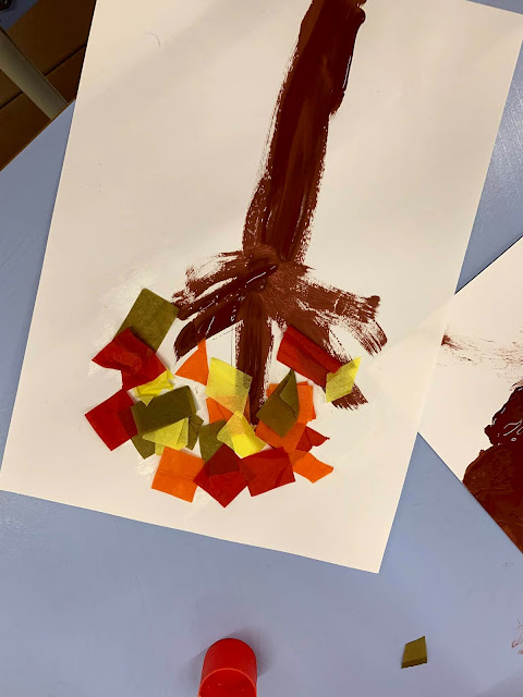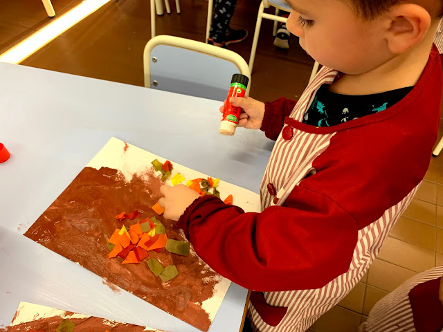 Amb els colors de la tardor, fem dibuixos de paisatges, arbres i enganxem petits retalls de coloraines…