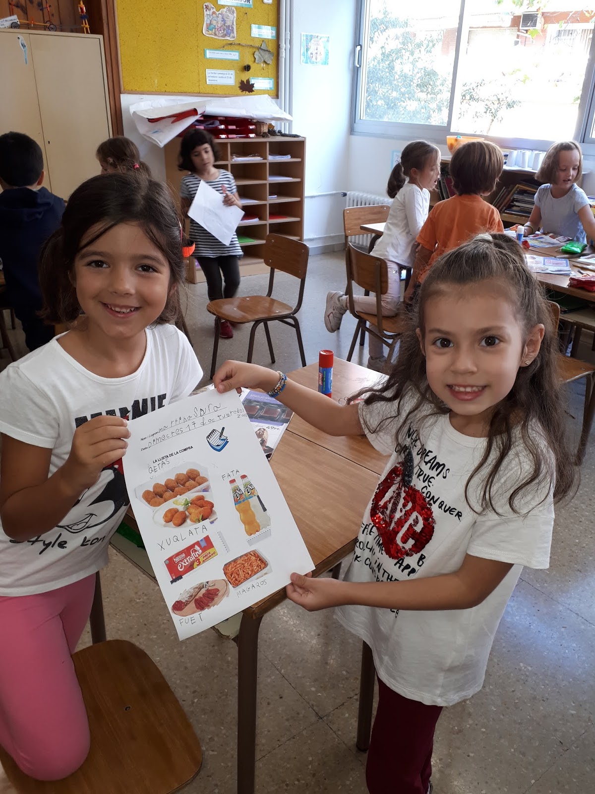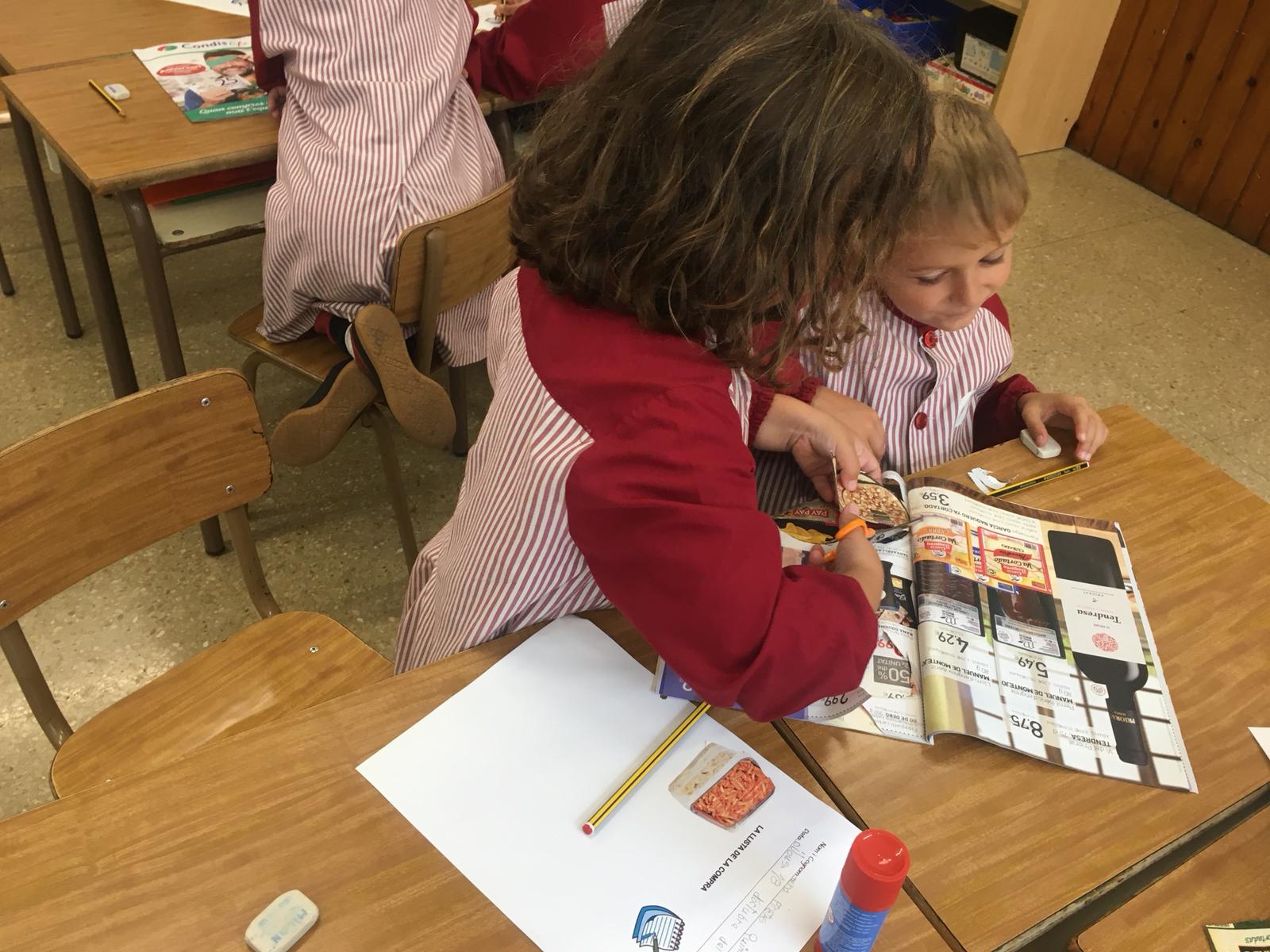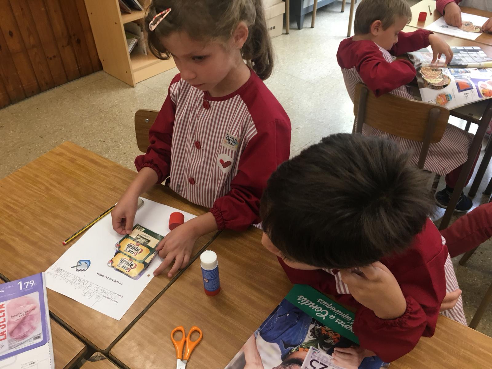 Ja fa uns dies, els nens i nenes de primer vam ajudar les nostres mestres a fer la llista de la compra. Per parelles vam agafar revistes de diferents supermercats i vam buscar aliments d’ús quotidià. Els vam retallar i els vam enganxar a un full. Després vam escriure el nom d’aquell aliment.