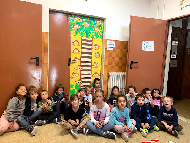 Després, hem fet micos i plàtans. Hem pintat les cares d’uns micos, les hem retallat i després envernissat. I per últim, hem fet uns plàtans enganxant gomets de color groc.