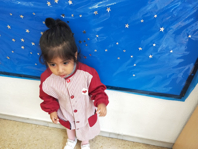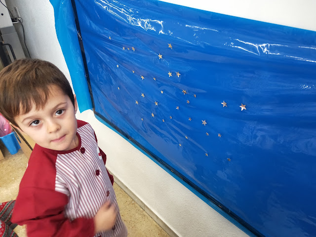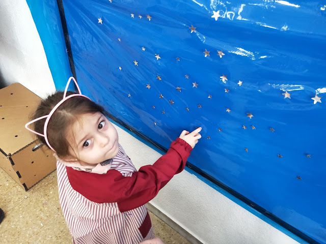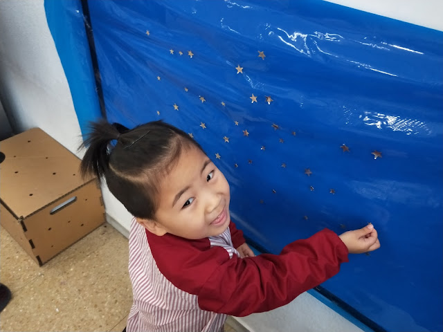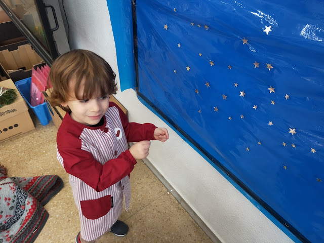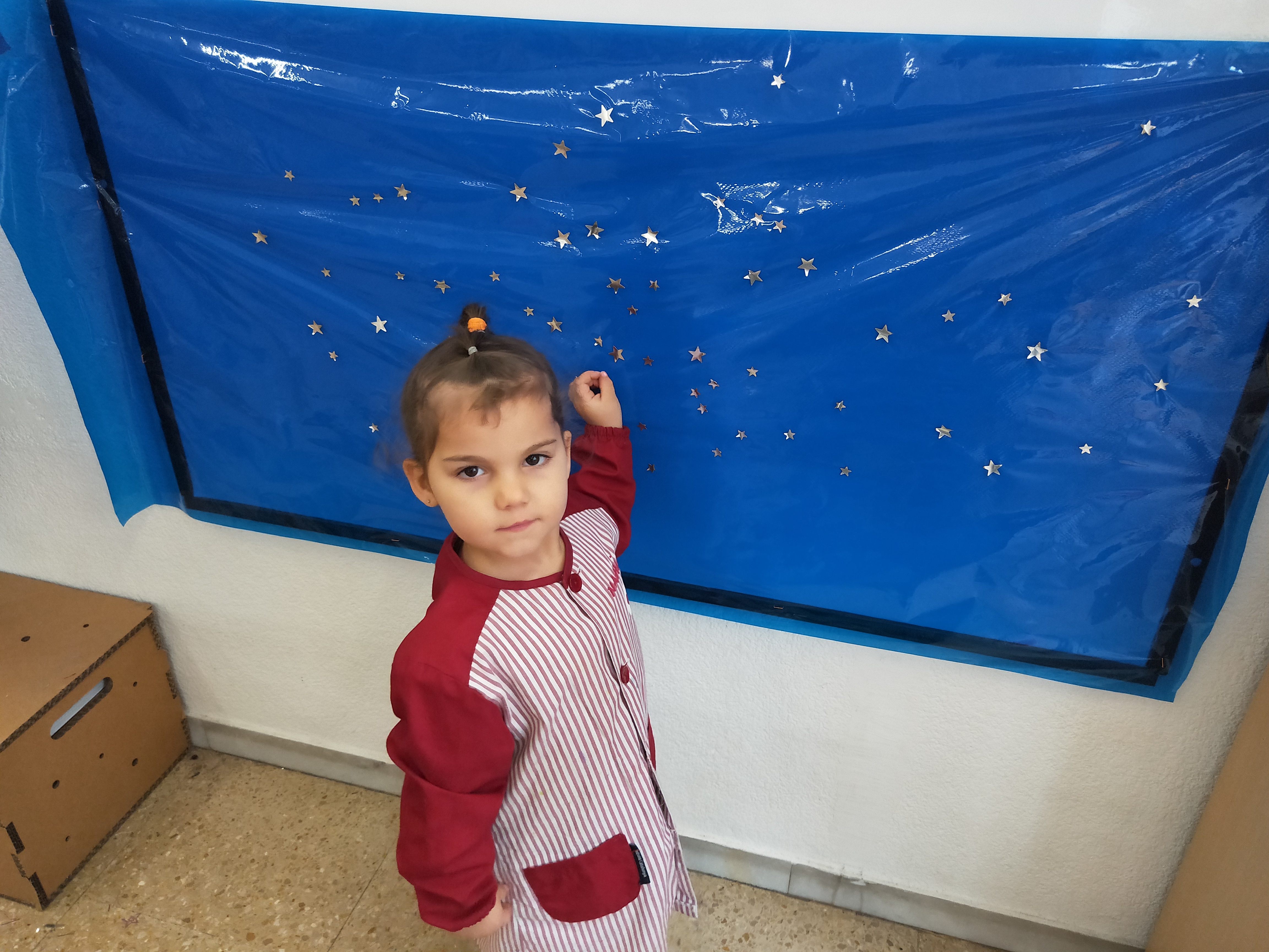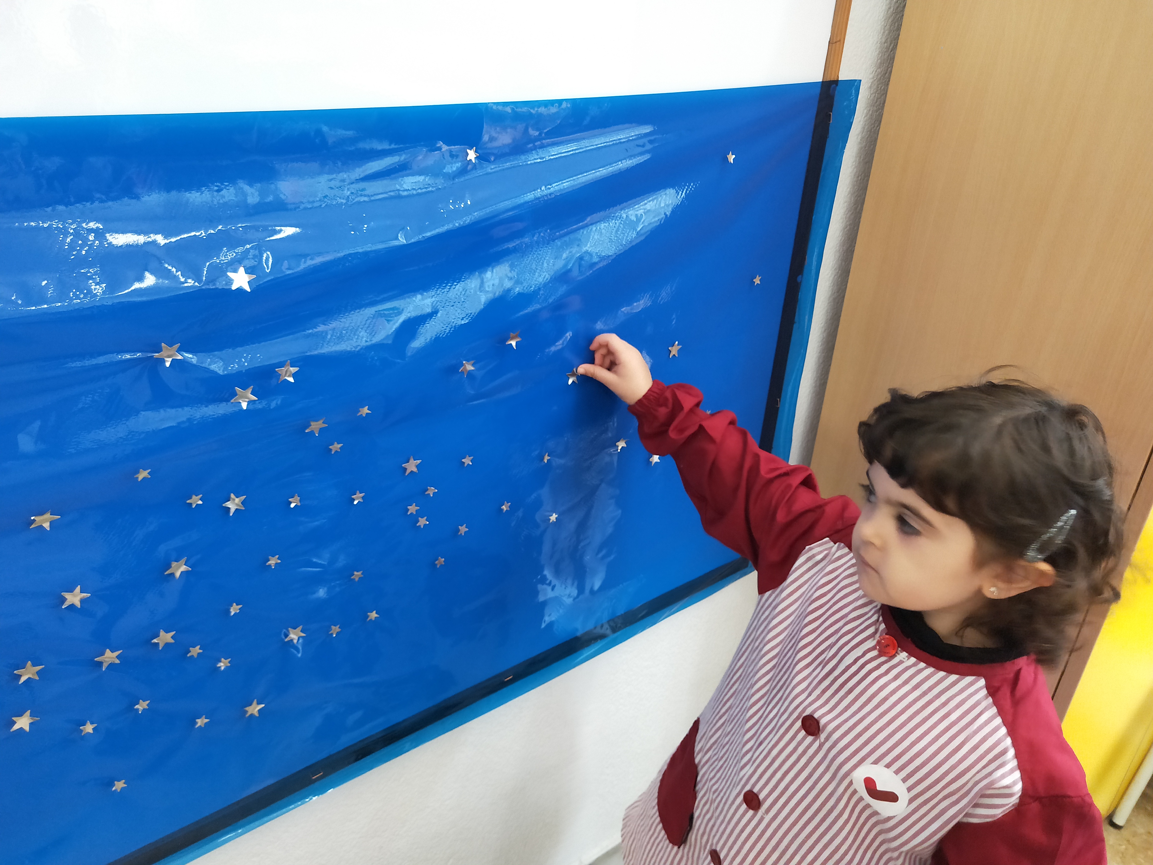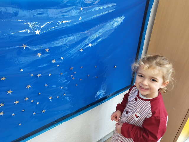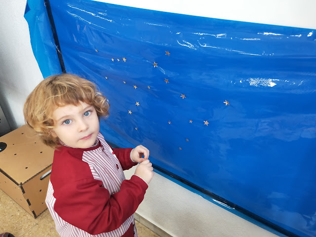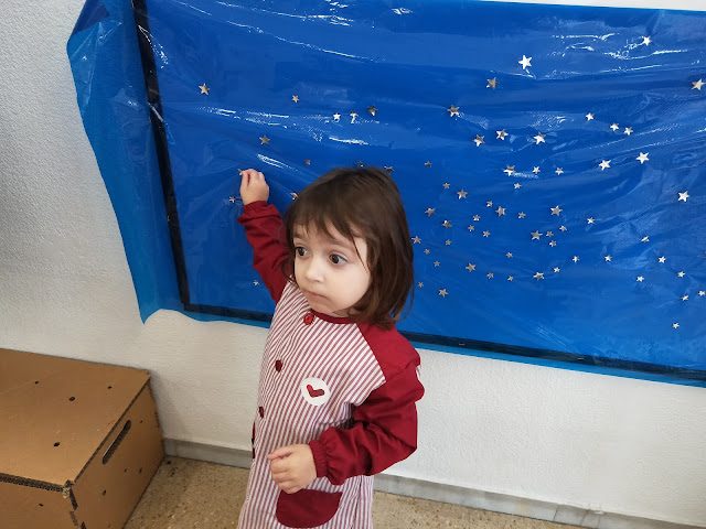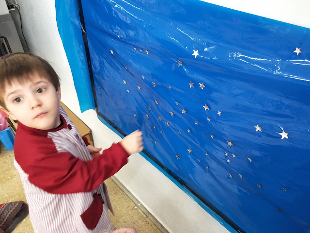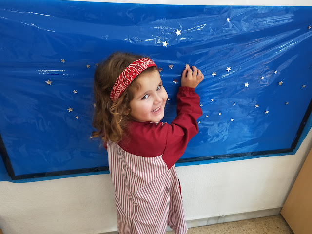 Hem començat preparant el cel del fons posant estrelles…