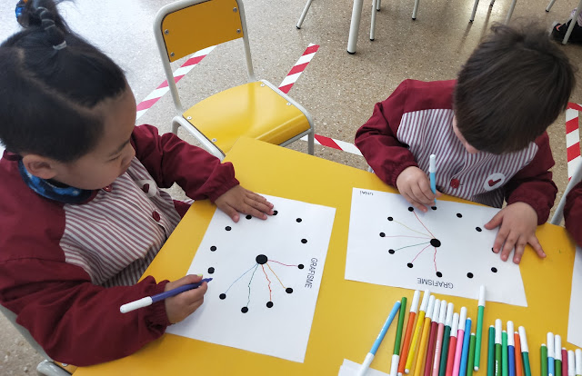 Estem treballant el traç i ho hem fet a la pissarra digital: sortien, triaven el color i feien la línia… Els ha agradat molt fer-ho així!!