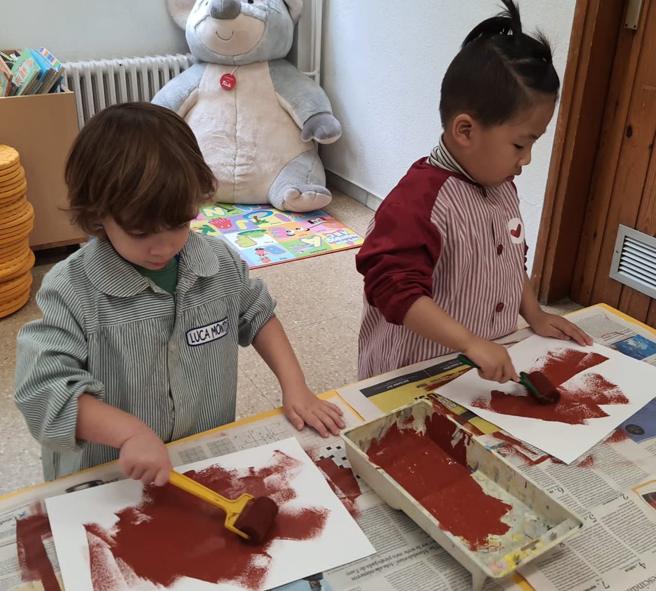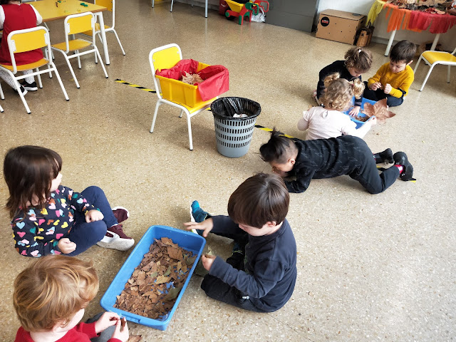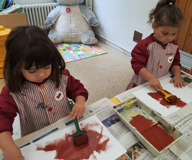 Primer de tot hem pintat un full de dibuix amb rodet i pintura marró. Serà el fons del nostre “Quadre de tardor”…