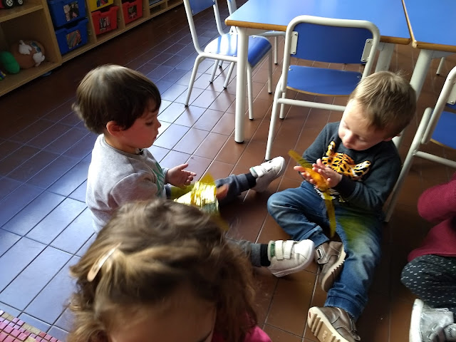 Un altre dia, per continuar treballant aquest color vam donar a cada nen i nena un tros de paper cel·lofana per veure-ho tot de color groc.
