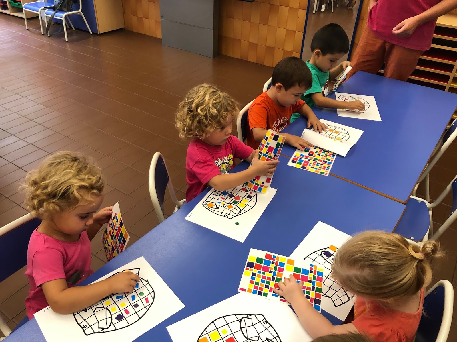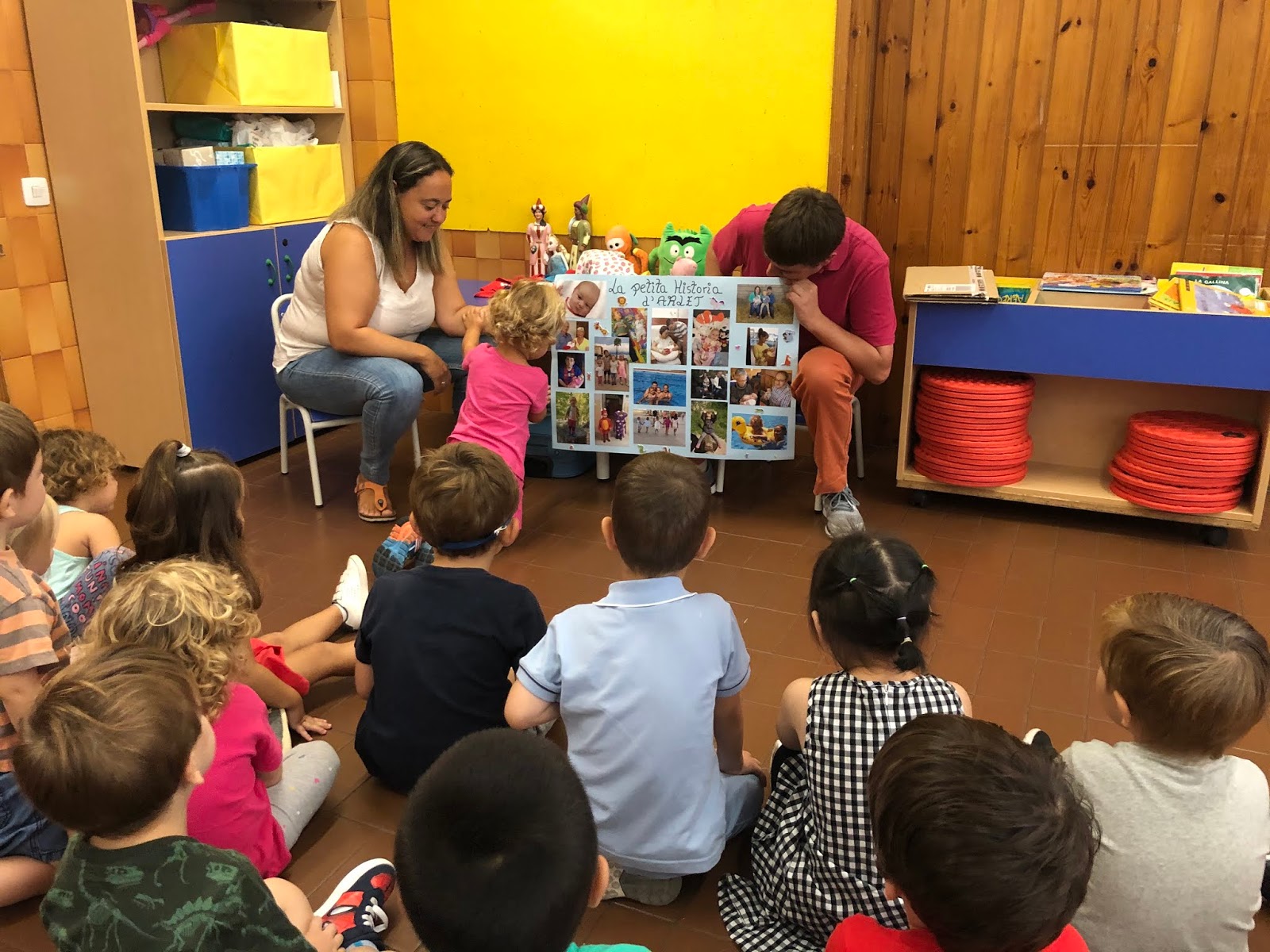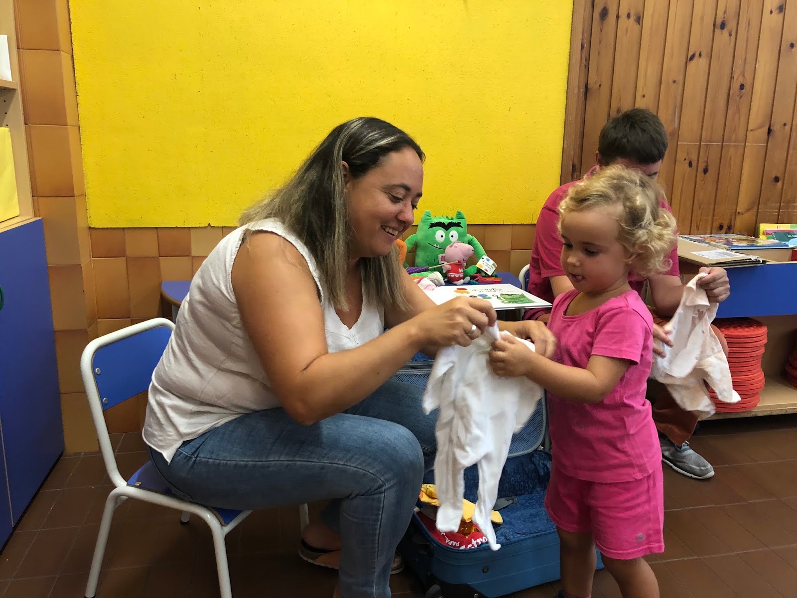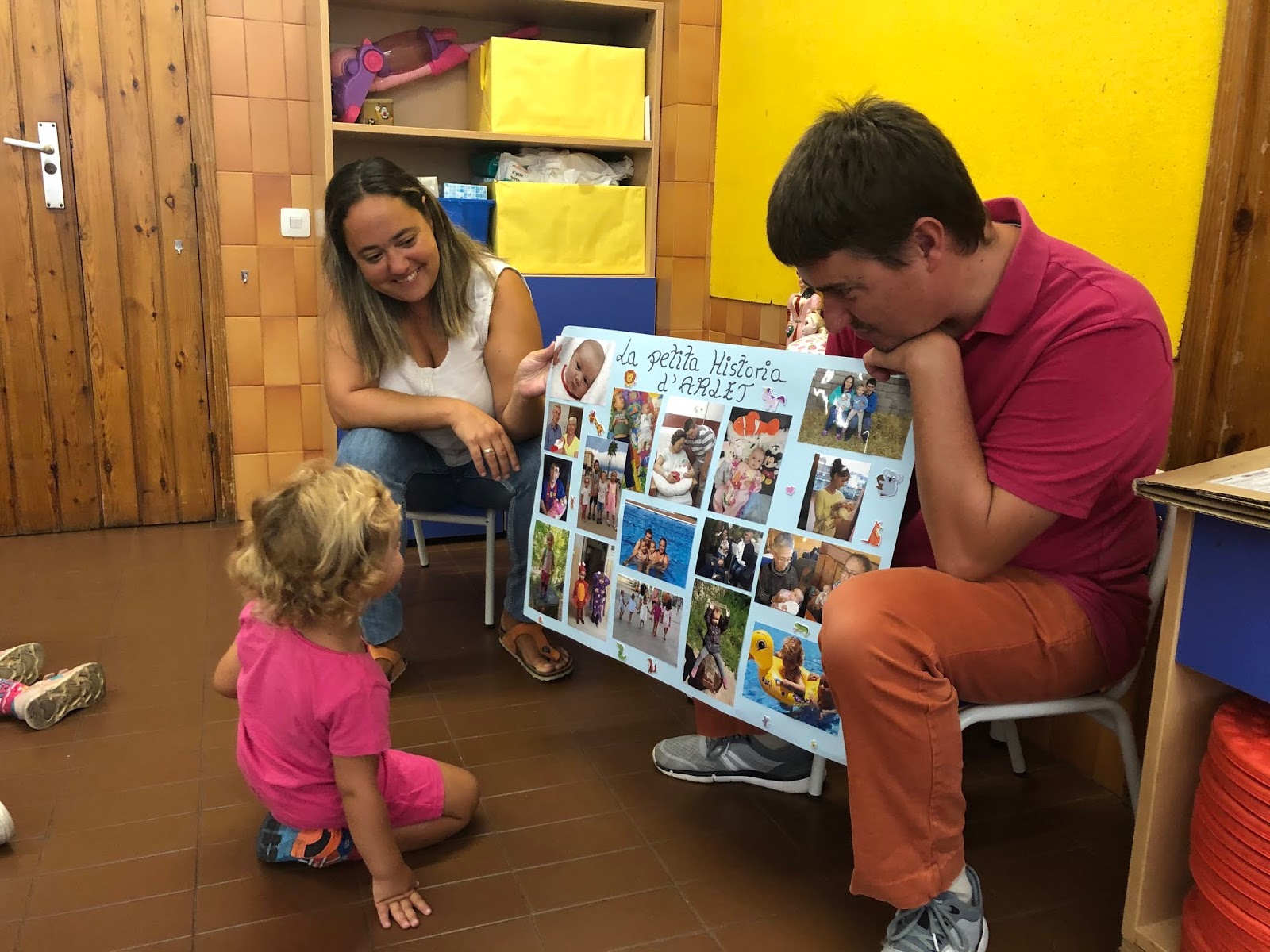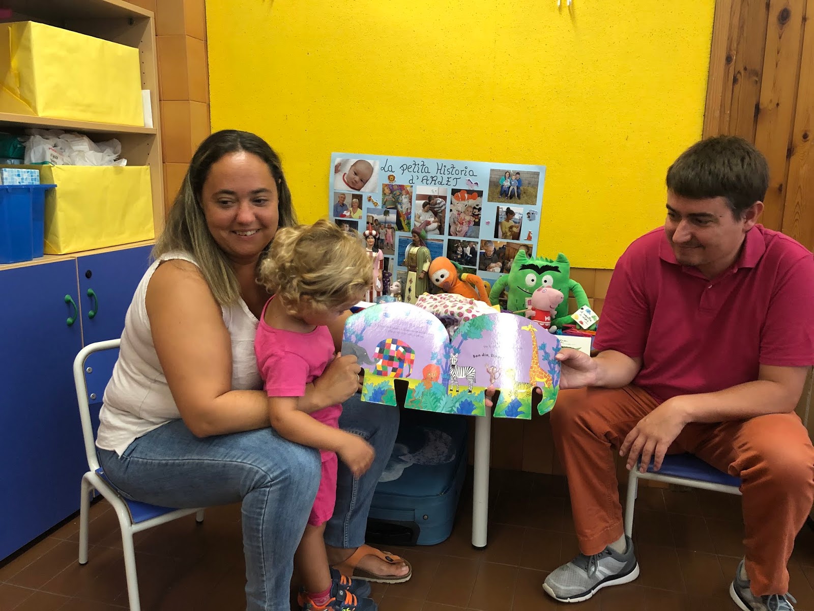 Dilluns va arribar a l’aula ben carregada i acompanyada dels seus pares. Primer de tot ens va mostrar totes les joguines que havien posat dins la maleta per jugar amb els seus companys. Després ens va ensenyar robeta de quan era més petita i un mural amb fotos de la família i amics. Per últim, ens van explicar el conte de l’Elmer, l’elefant dels colors, i ens van proposar decorar amb gomets de colors els Elmers que havien portat per cadascun dels nens i nenes. Quina activitat més bonica!