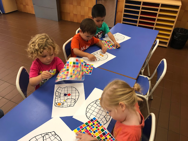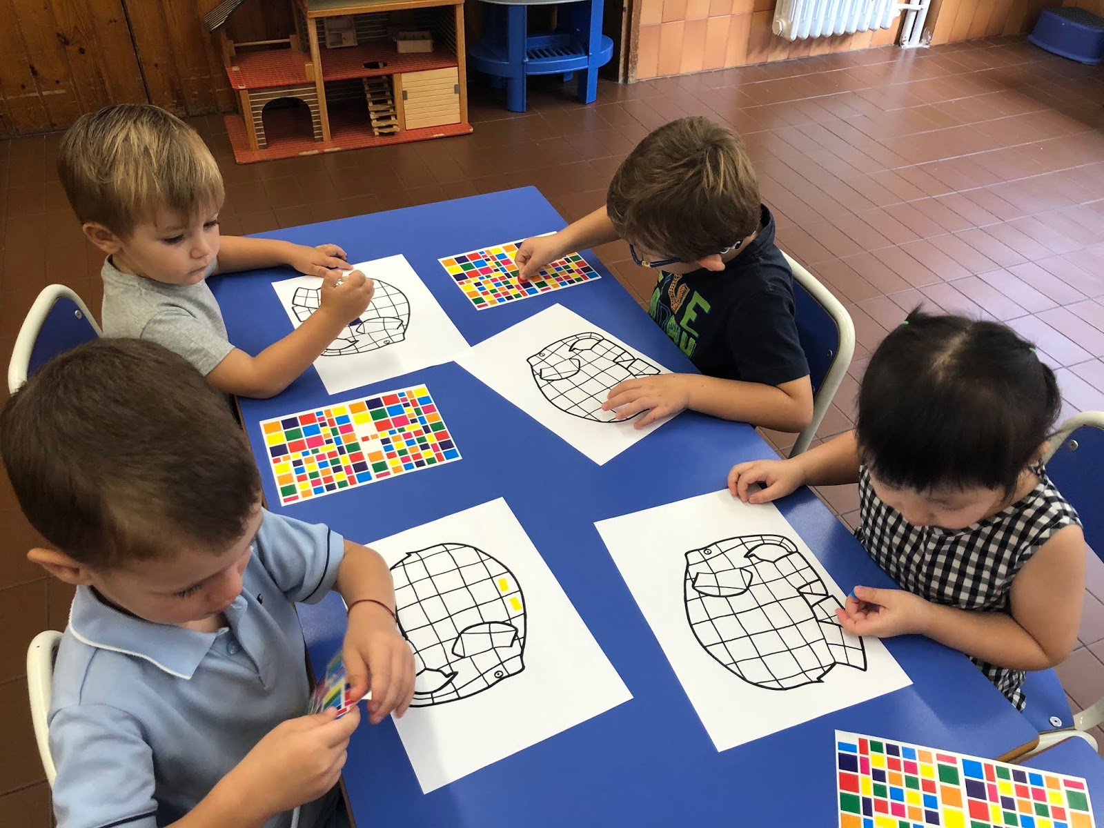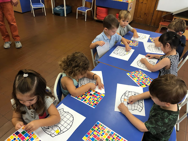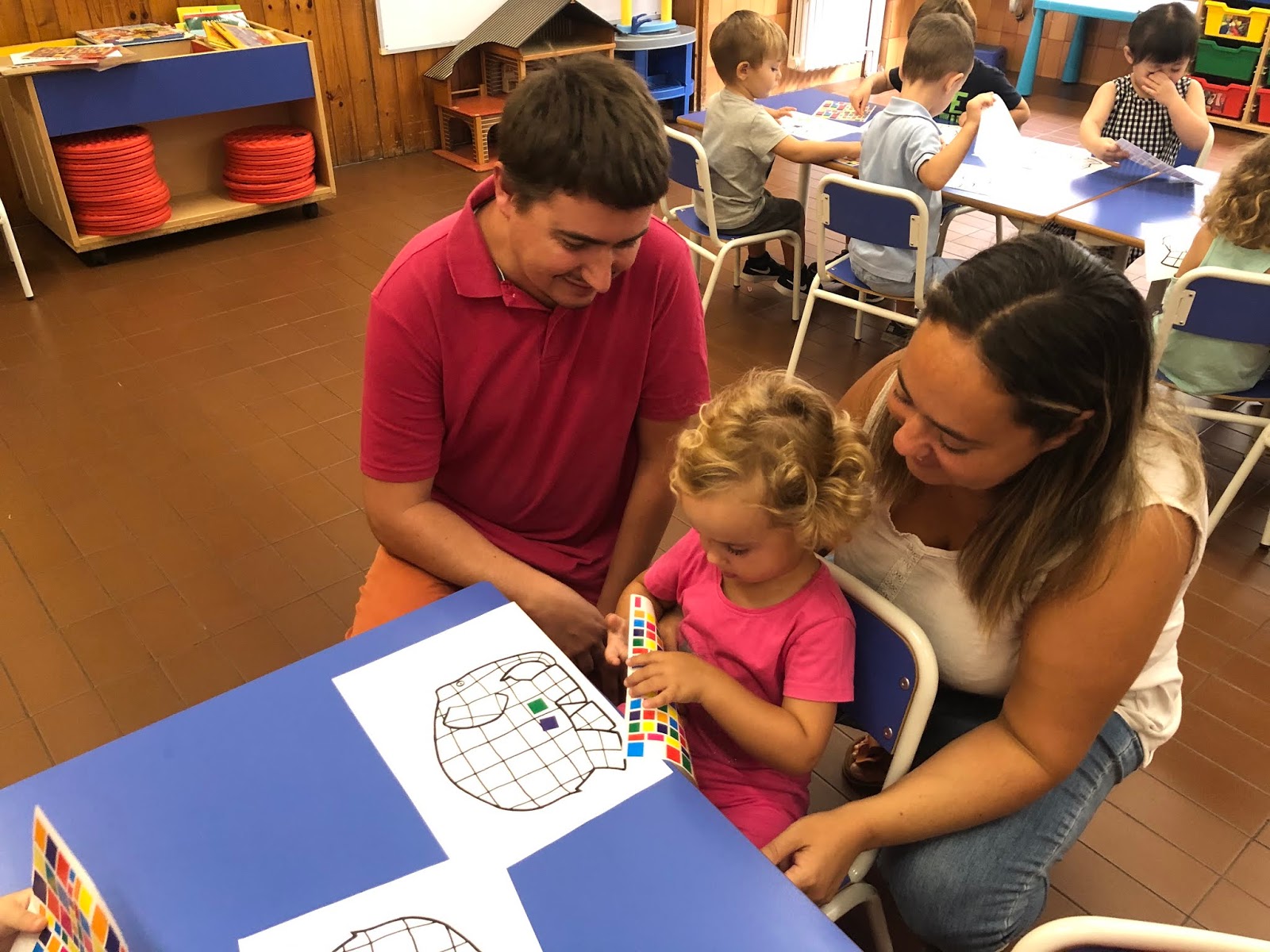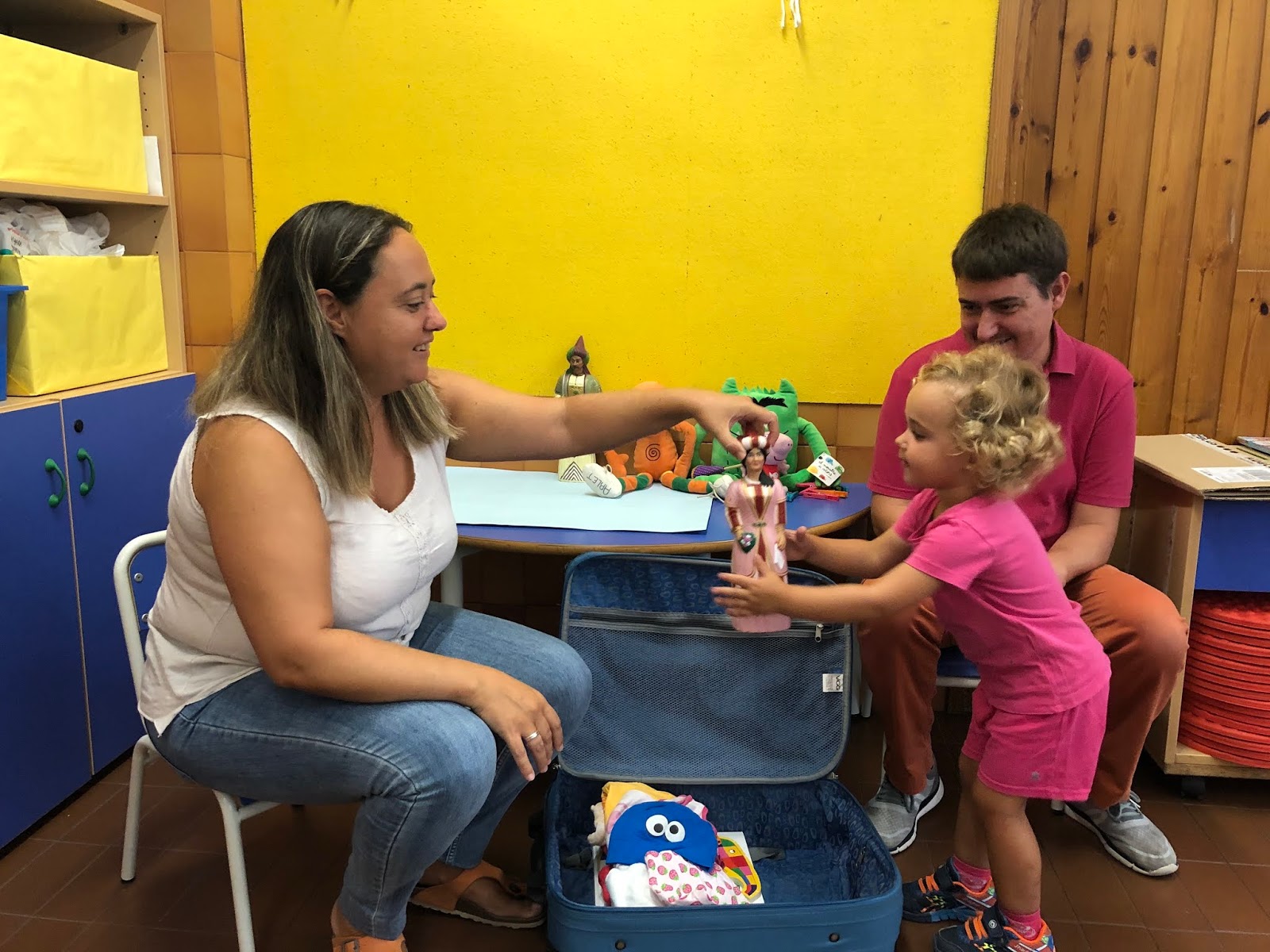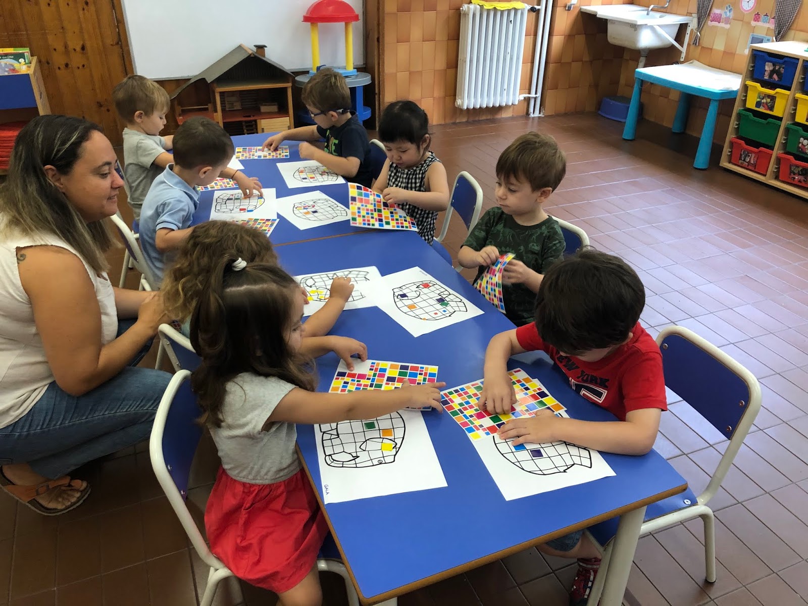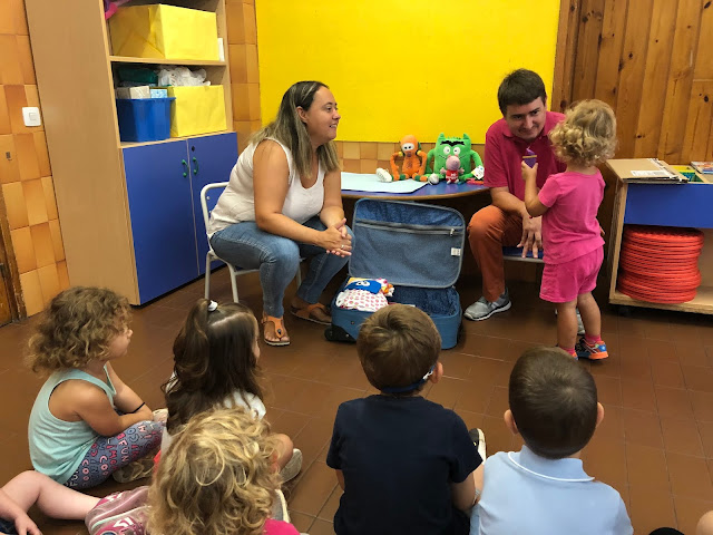 Dilluns va arribar a l’aula ben carregada i acompanyada dels seus pares. Primer de tot ens va mostrar totes les joguines que havien posat dins la maleta per jugar amb els seus companys. Després ens va ensenyar robeta de quan era més petita i un mural amb fotos de la família i amics. Per últim, ens van explicar el conte de l’Elmer, l’elefant dels colors, i ens van proposar decorar amb gomets de colors els Elmers que havien portat per cadascun dels nens i nenes. Quina activitat més bonica!