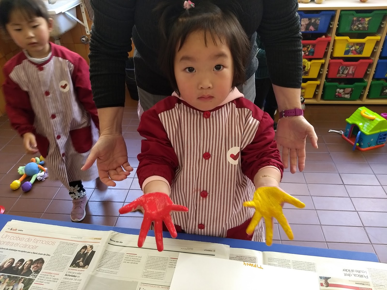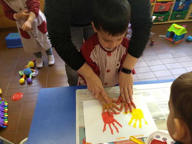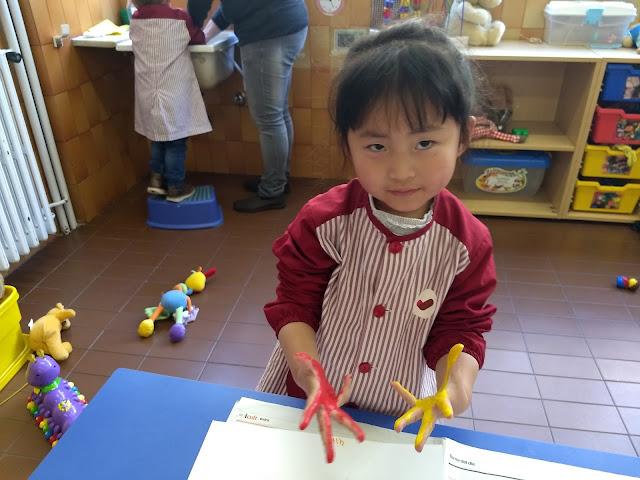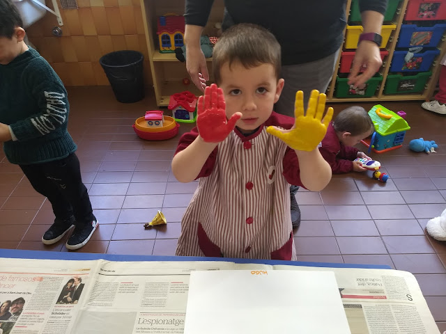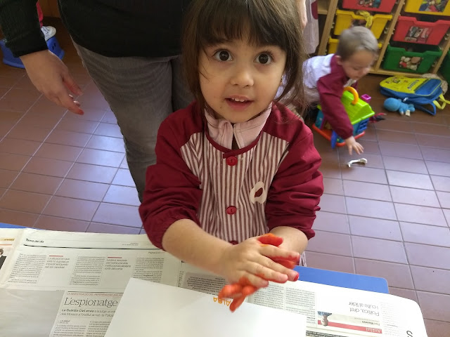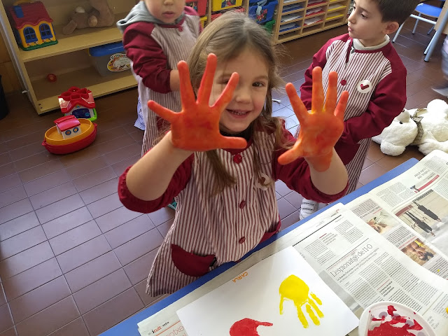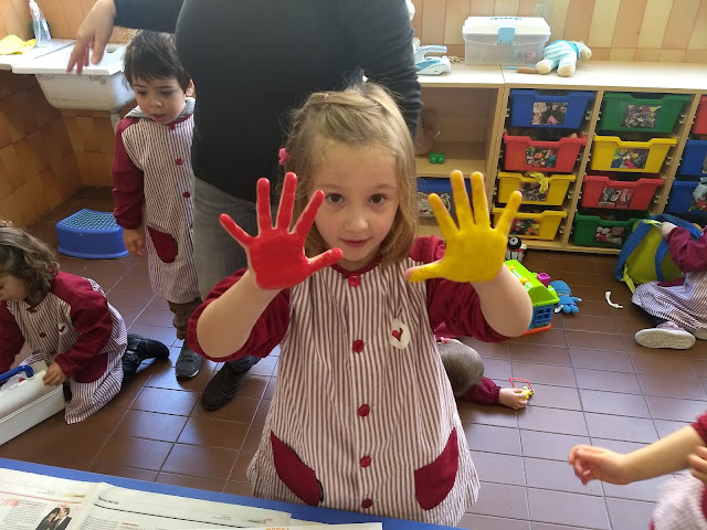 Avui, però, hem anat una mica més enllà i hem fet un petit descobriment a la classe dels Peixets… si barregem una mica de pintura groga i una mica de pintura vermella…….