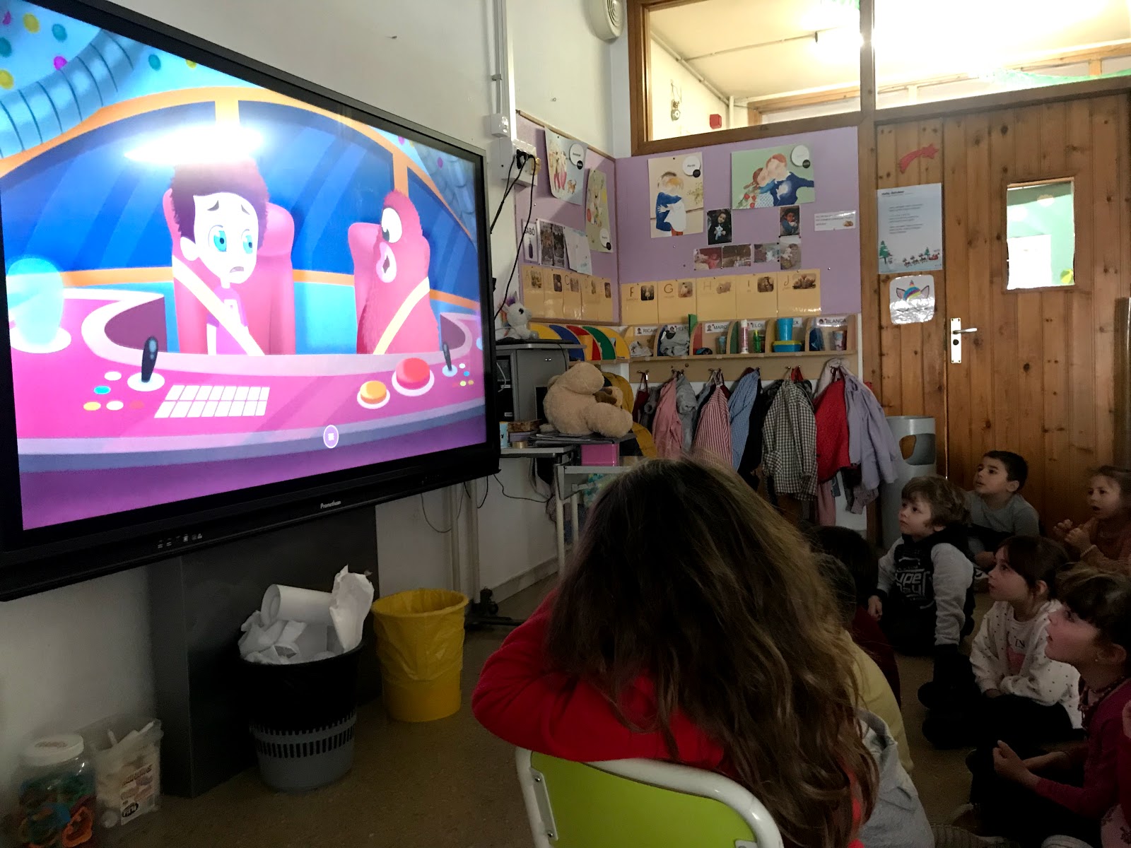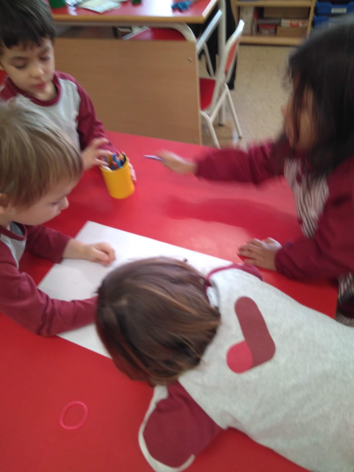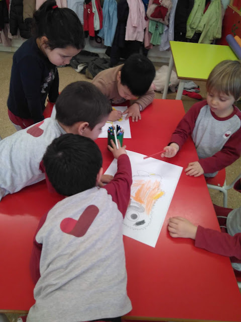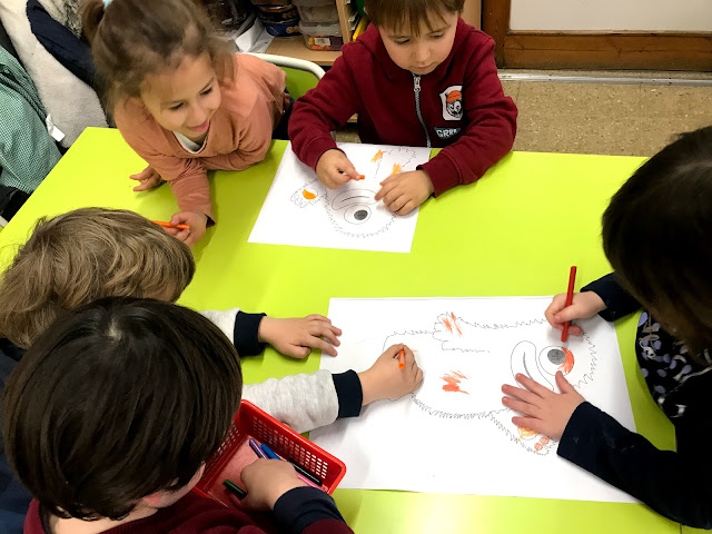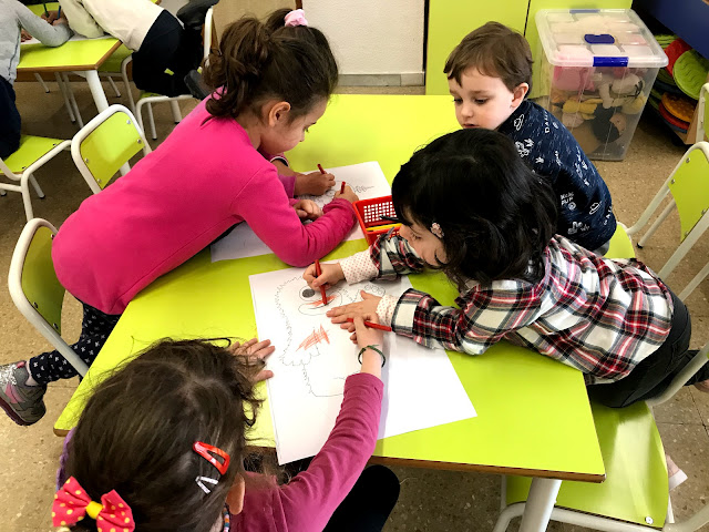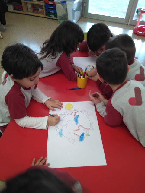 Després, vam pintar cooperativament el coet Apilo XII, el Planeta Reciclatge i el monstre Pilós i ens van donar les caixetes per reciclar les piles.