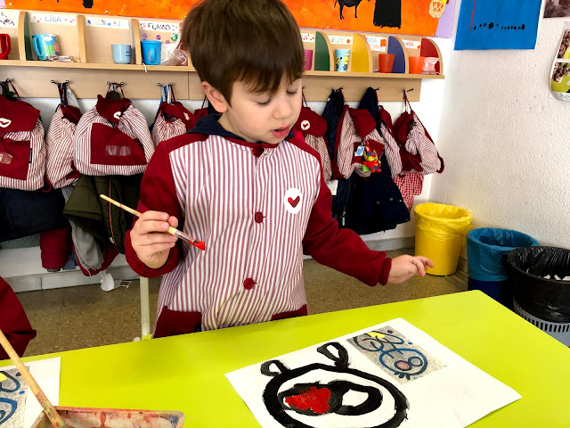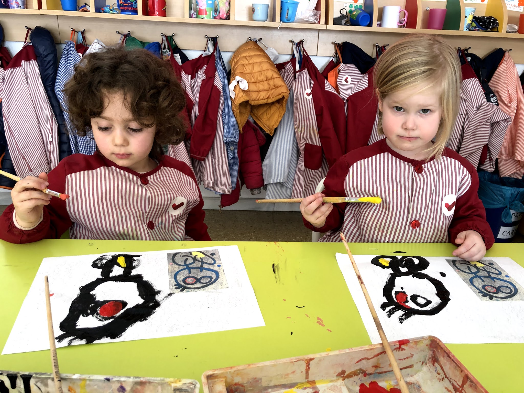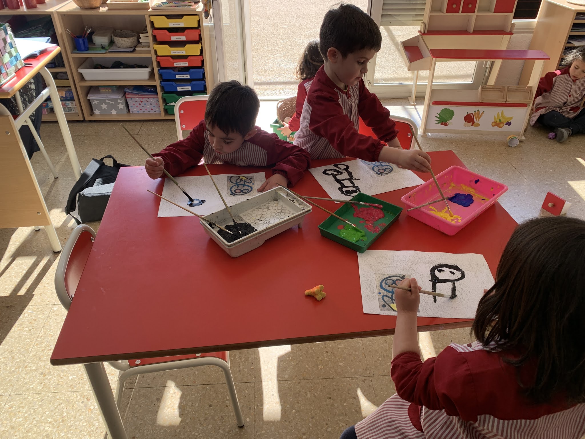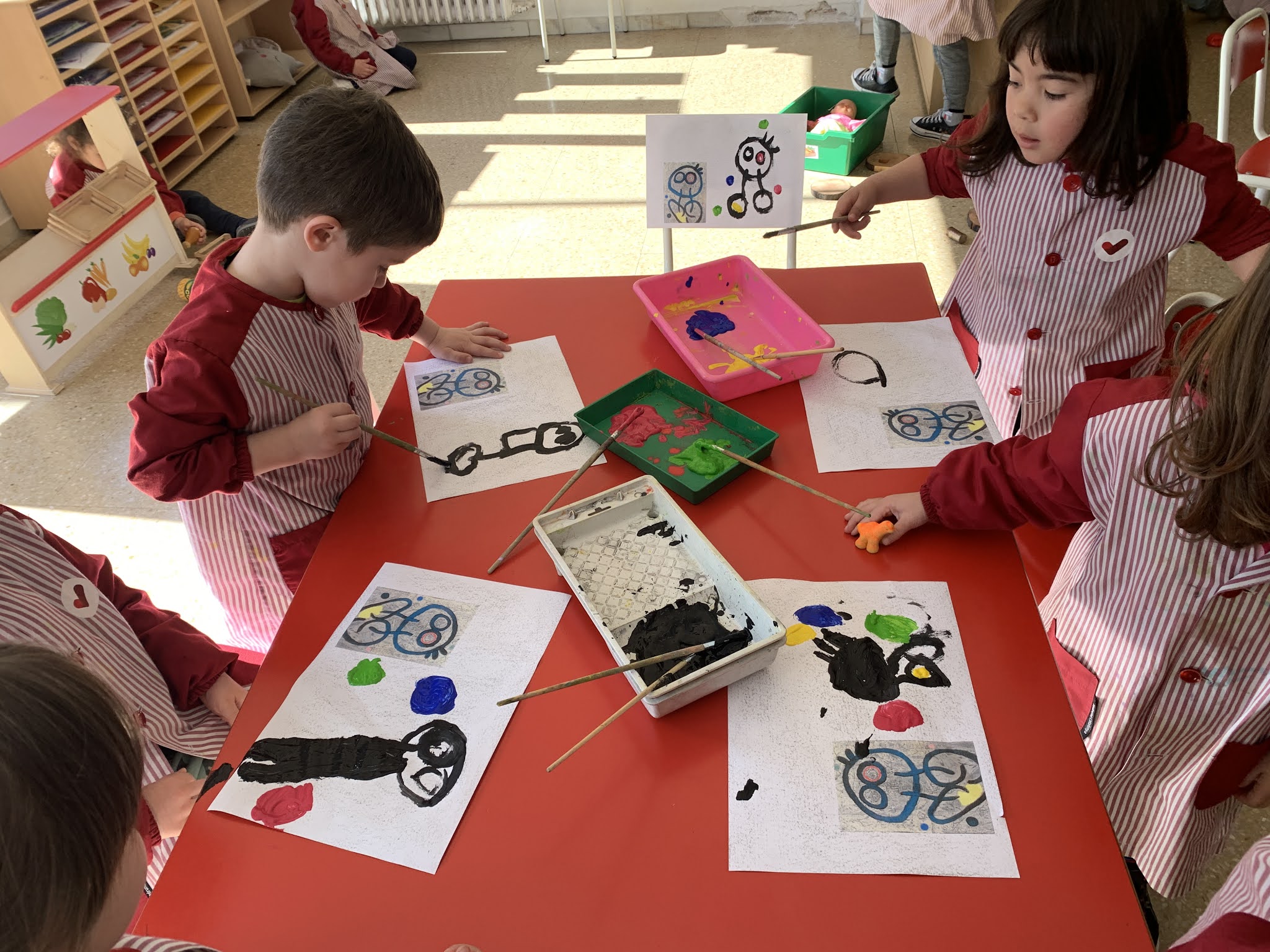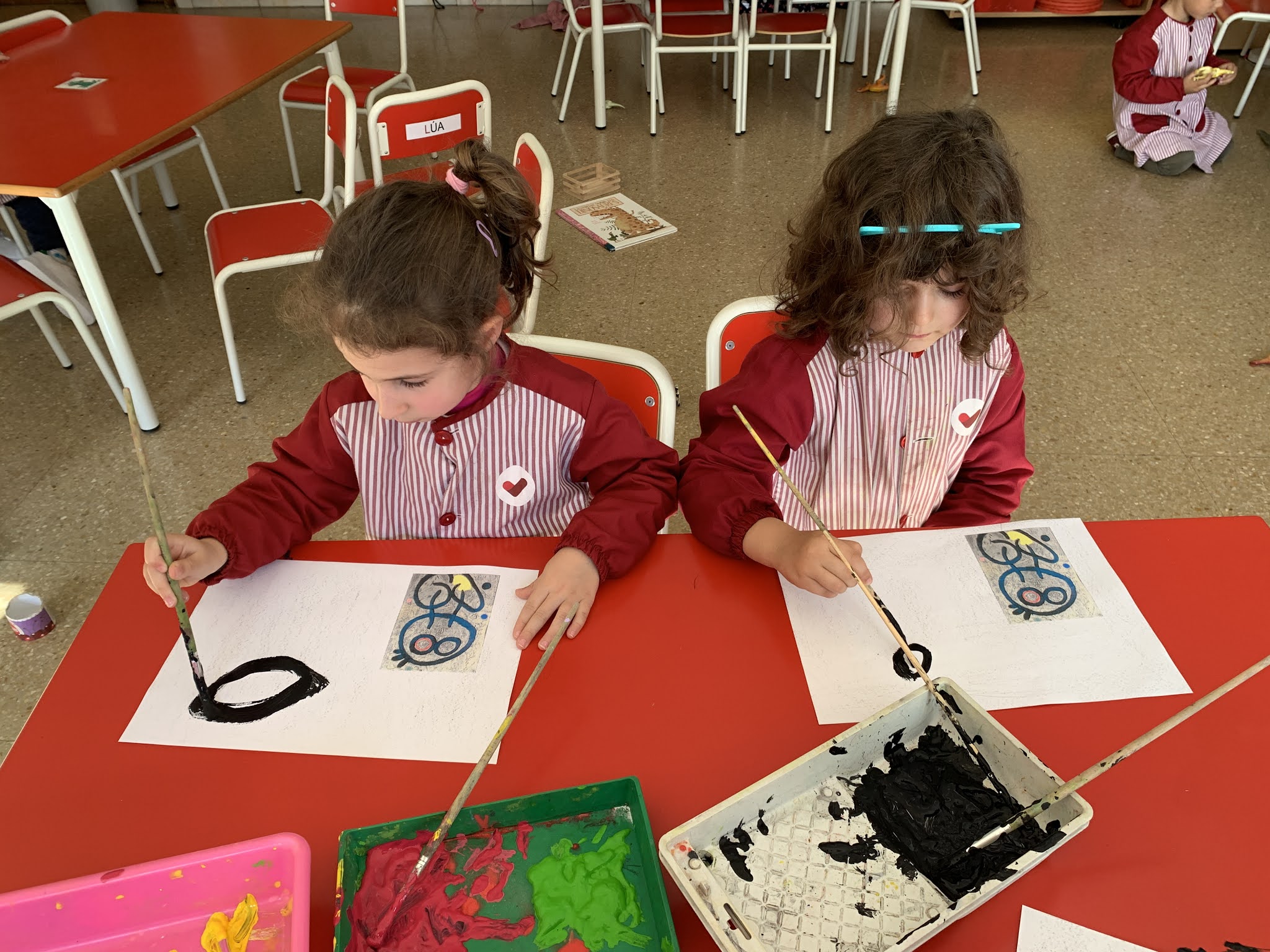 Ens fixem en l’obra de Joan Miró anomenada “Autoretrat” per fer el nostre propi dibuix. Primer hem pintat un fons gris amb plastidecor i després hem fet el cos amb pintura.