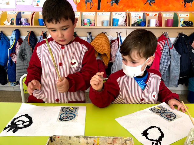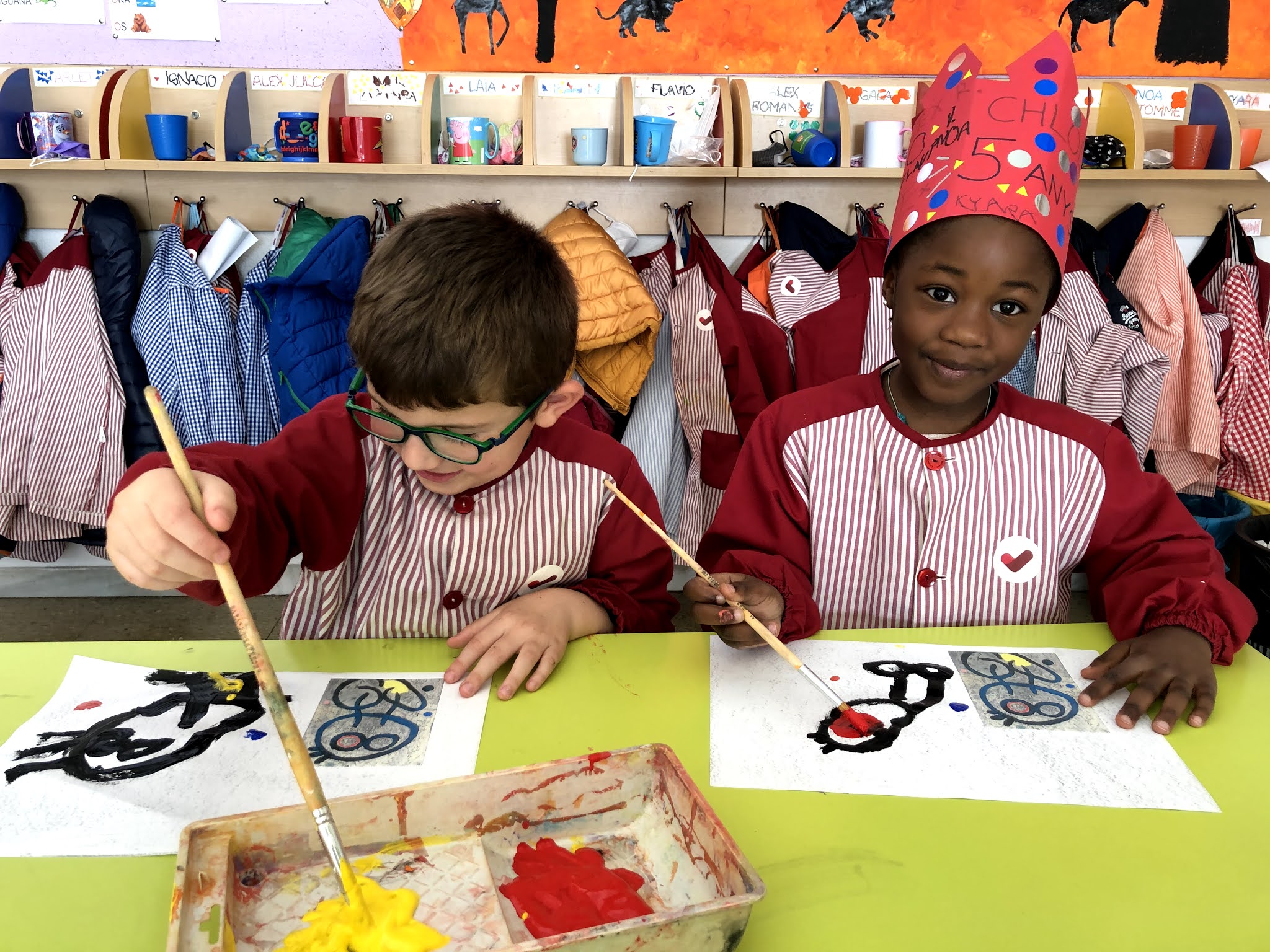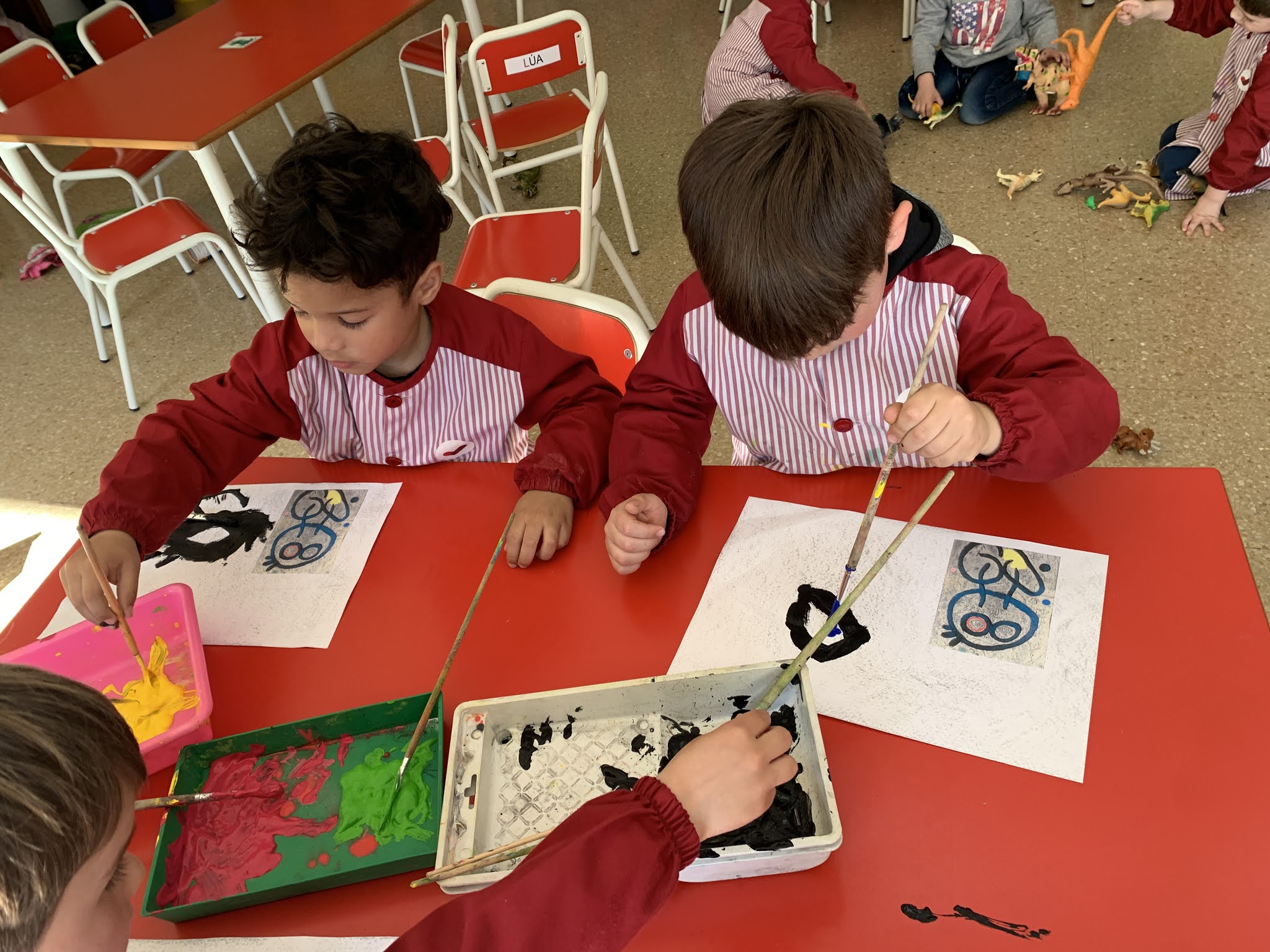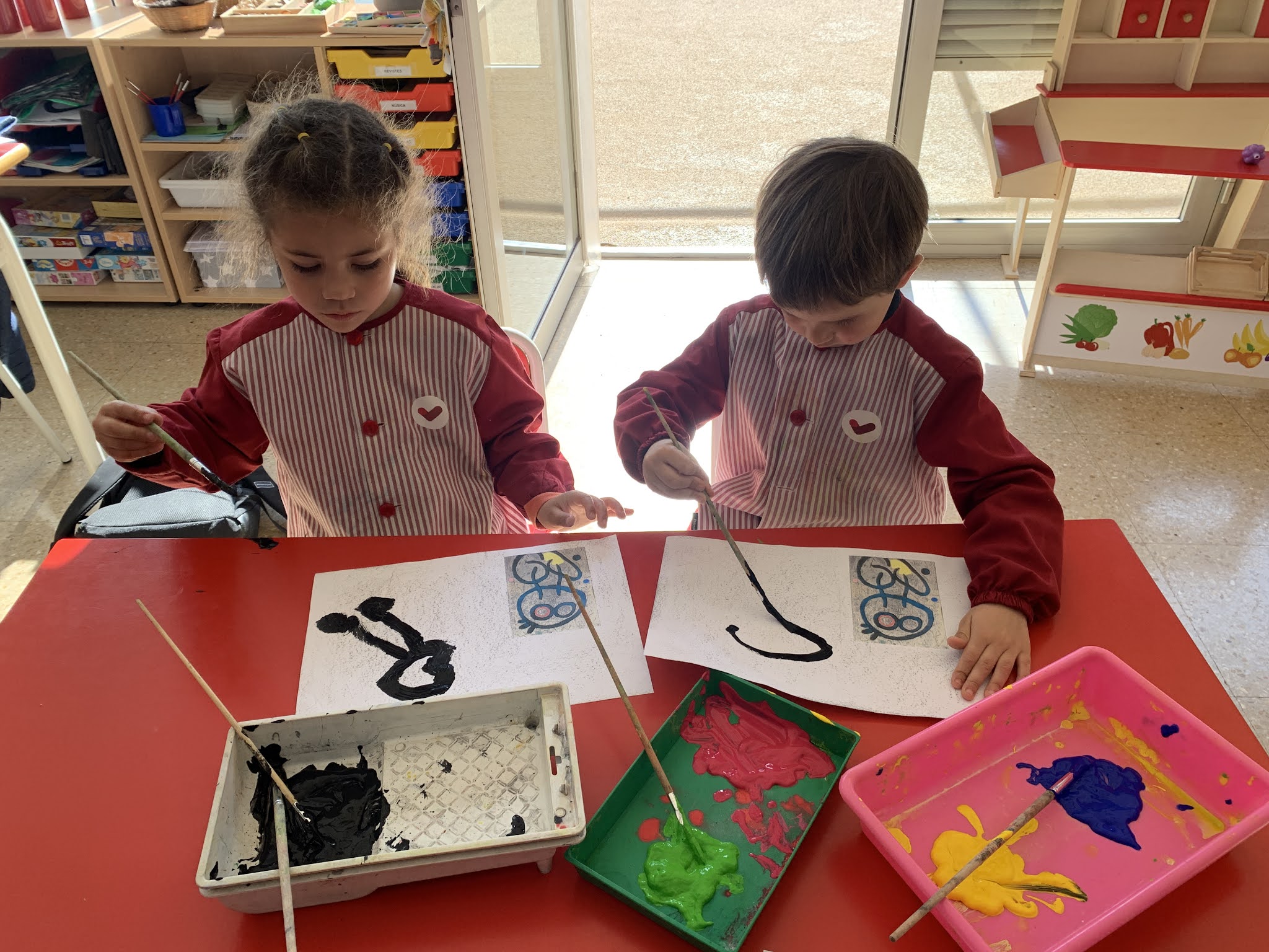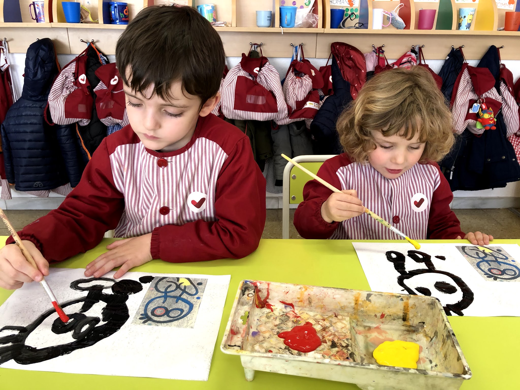 Ens fixem en l’obra de Joan Miró anomenada “Autoretrat” per fer el nostre propi dibuix. Primer hem pintat un fons gris amb plastidecor i després hem fet el cos amb pintura.