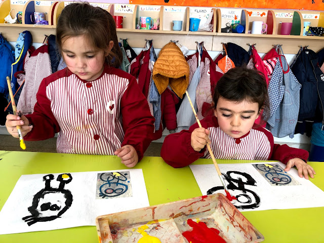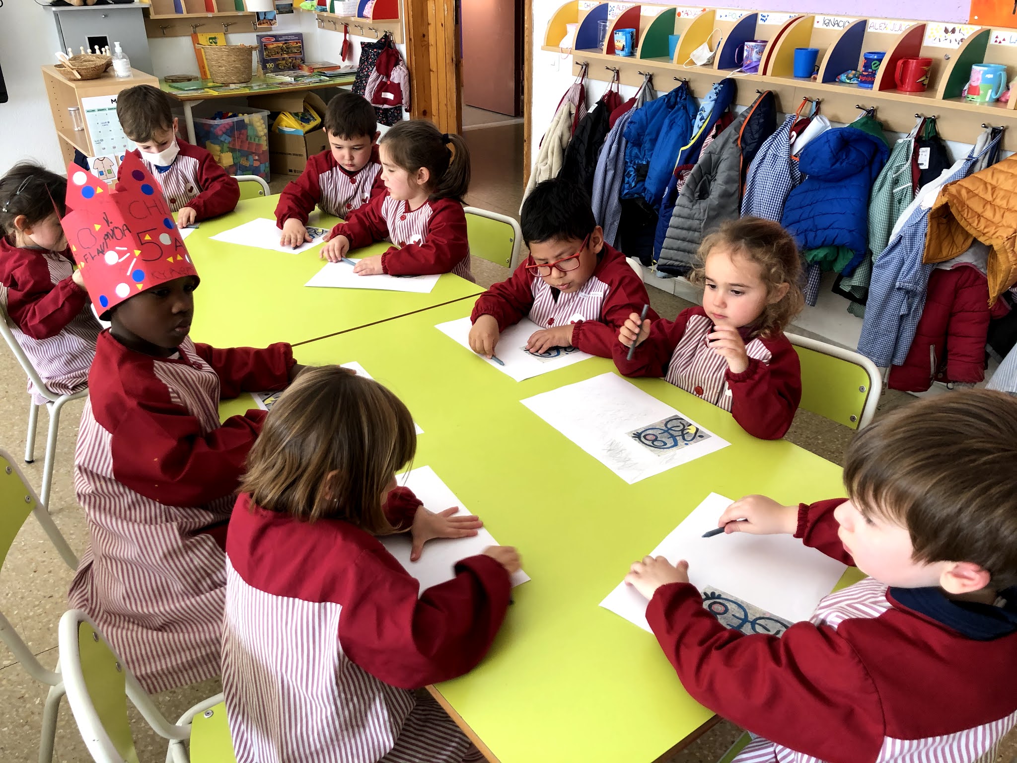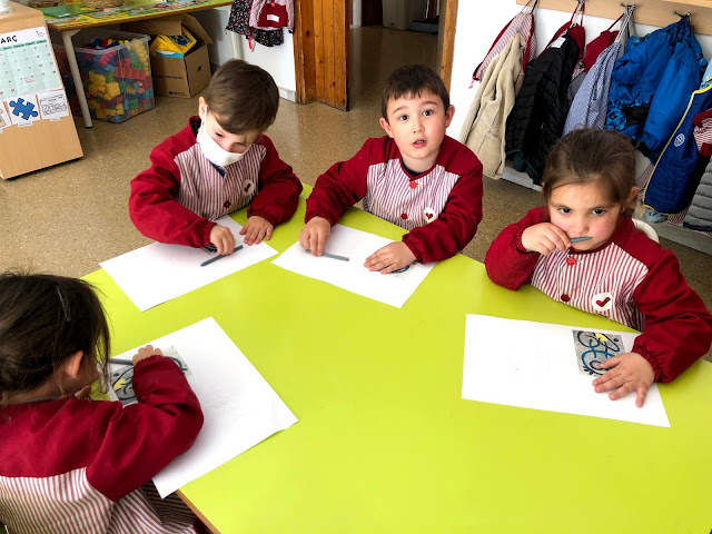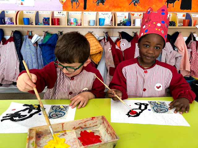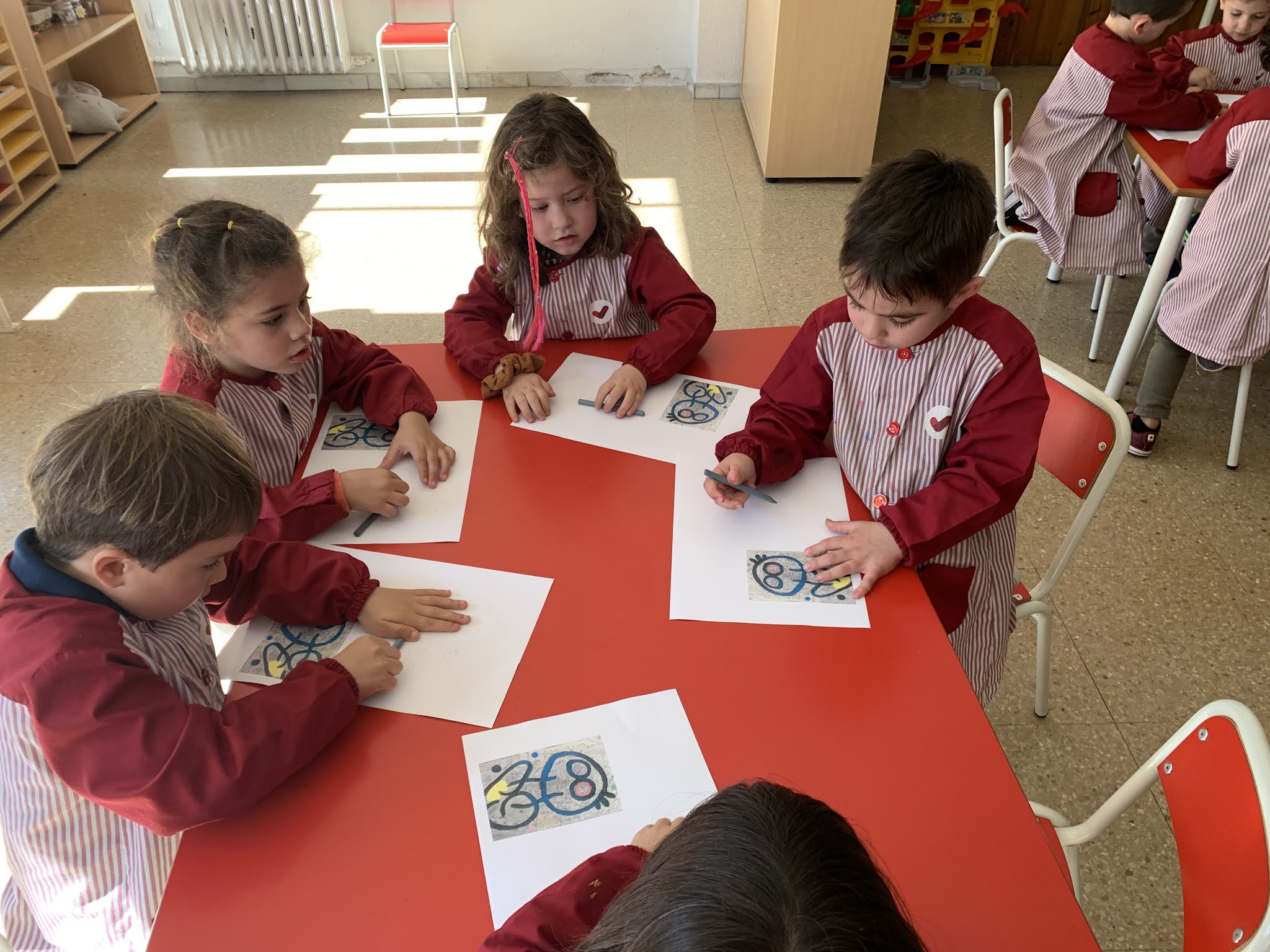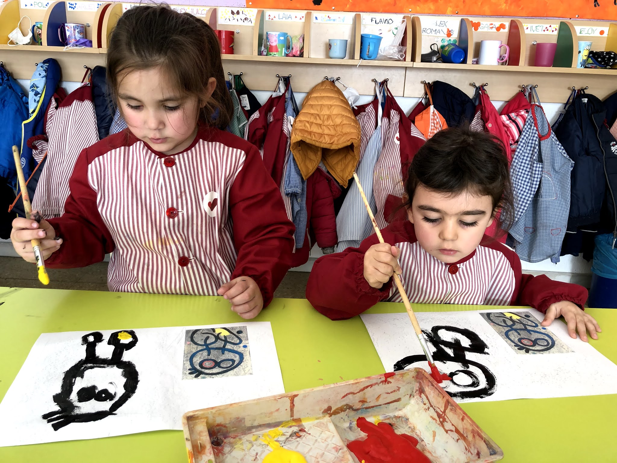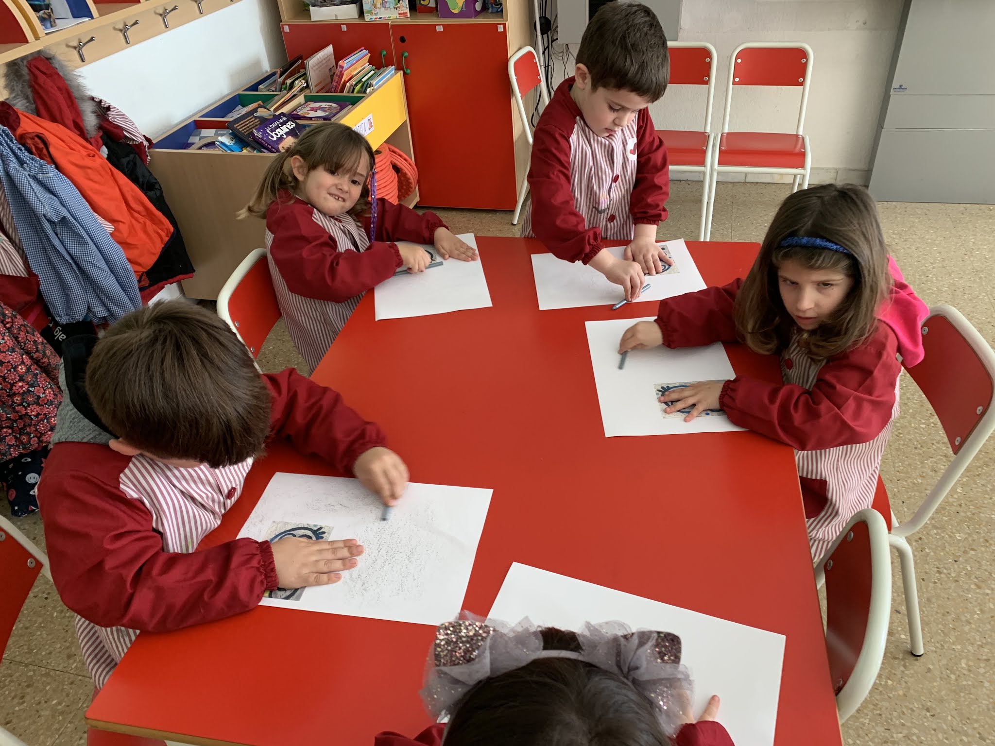 Ens fixem en l’obra de Joan Miró anomenada “Autoretrat” per fer el nostre propi dibuix. Primer hem pintat un fons gris amb plastidecor i després hem fet el cos amb pintura.
