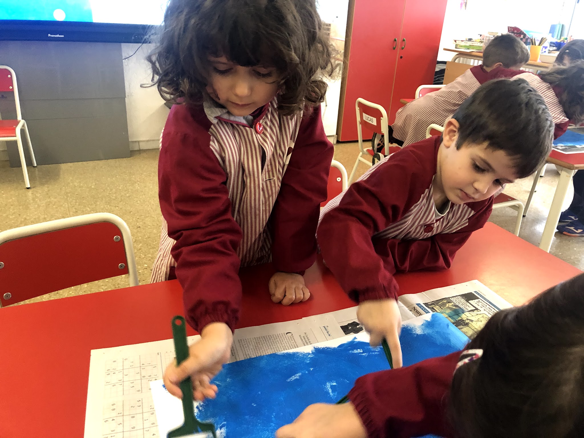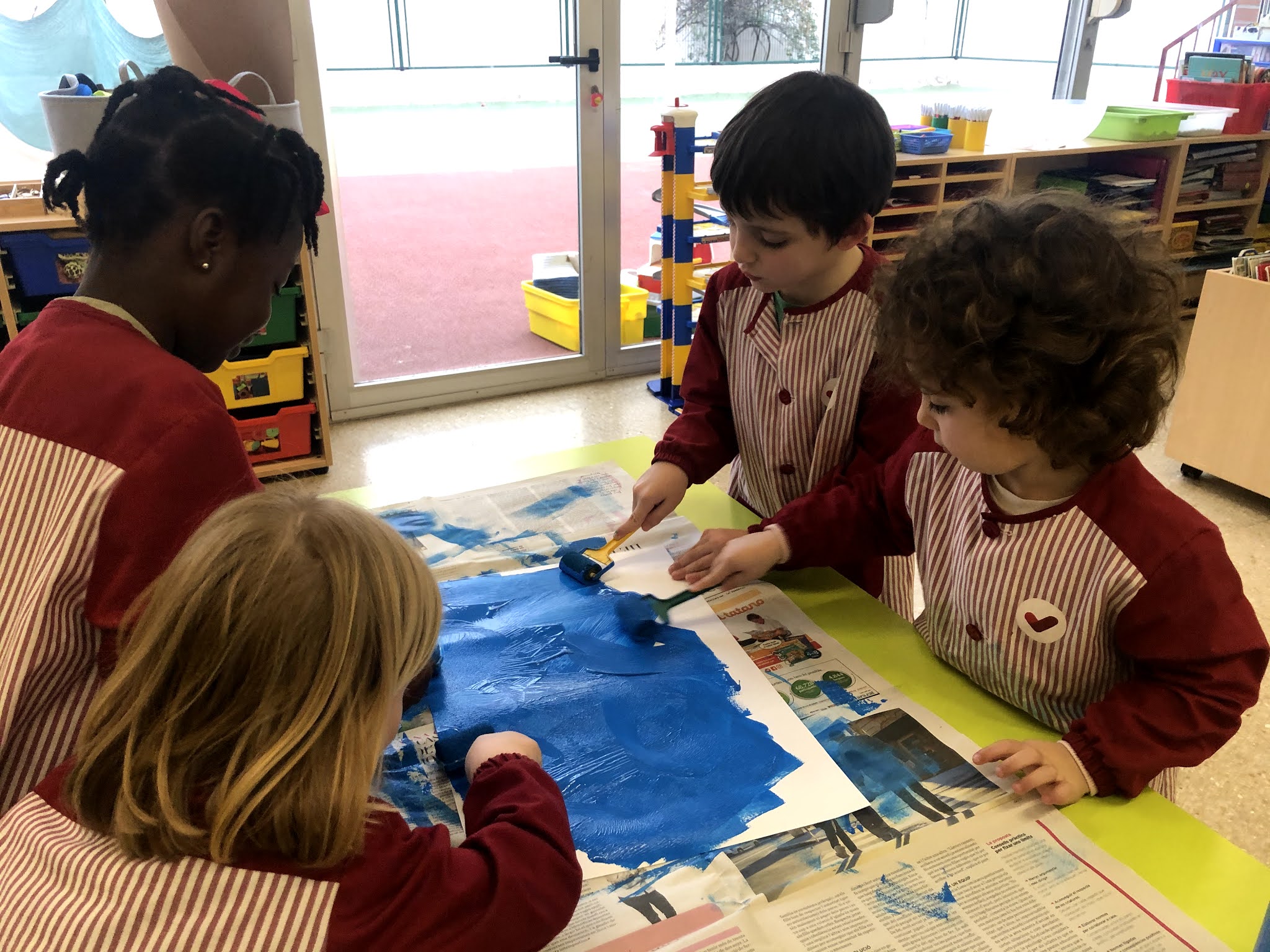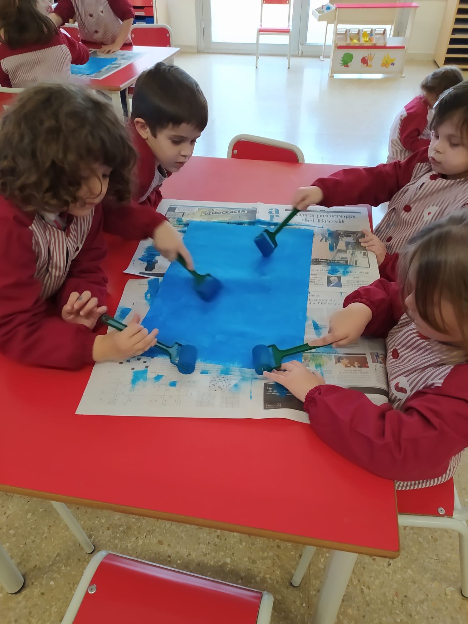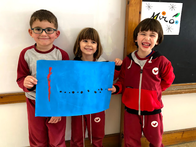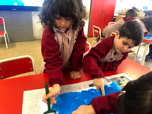 Aquesta setmana hem continuat amb el treball de Miró, tot inspirant-nos amb la seva obra d’art anomenada “Blau”. Per fer-ho, ens vam agrupar en petits grups. La primera sessió la vam dedicar a pintar el fons de color blau, amb pintura i rodets. En una altra sessió hem fet les línies i puntets, tot posant-nos d’acord entre nosaltres de qui feia cadascuna de les formes.