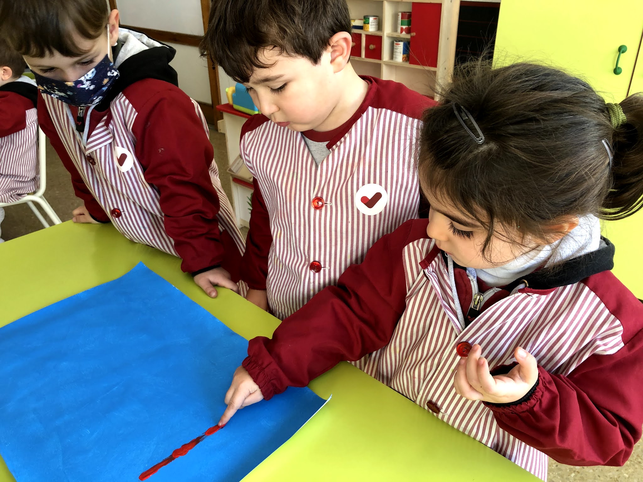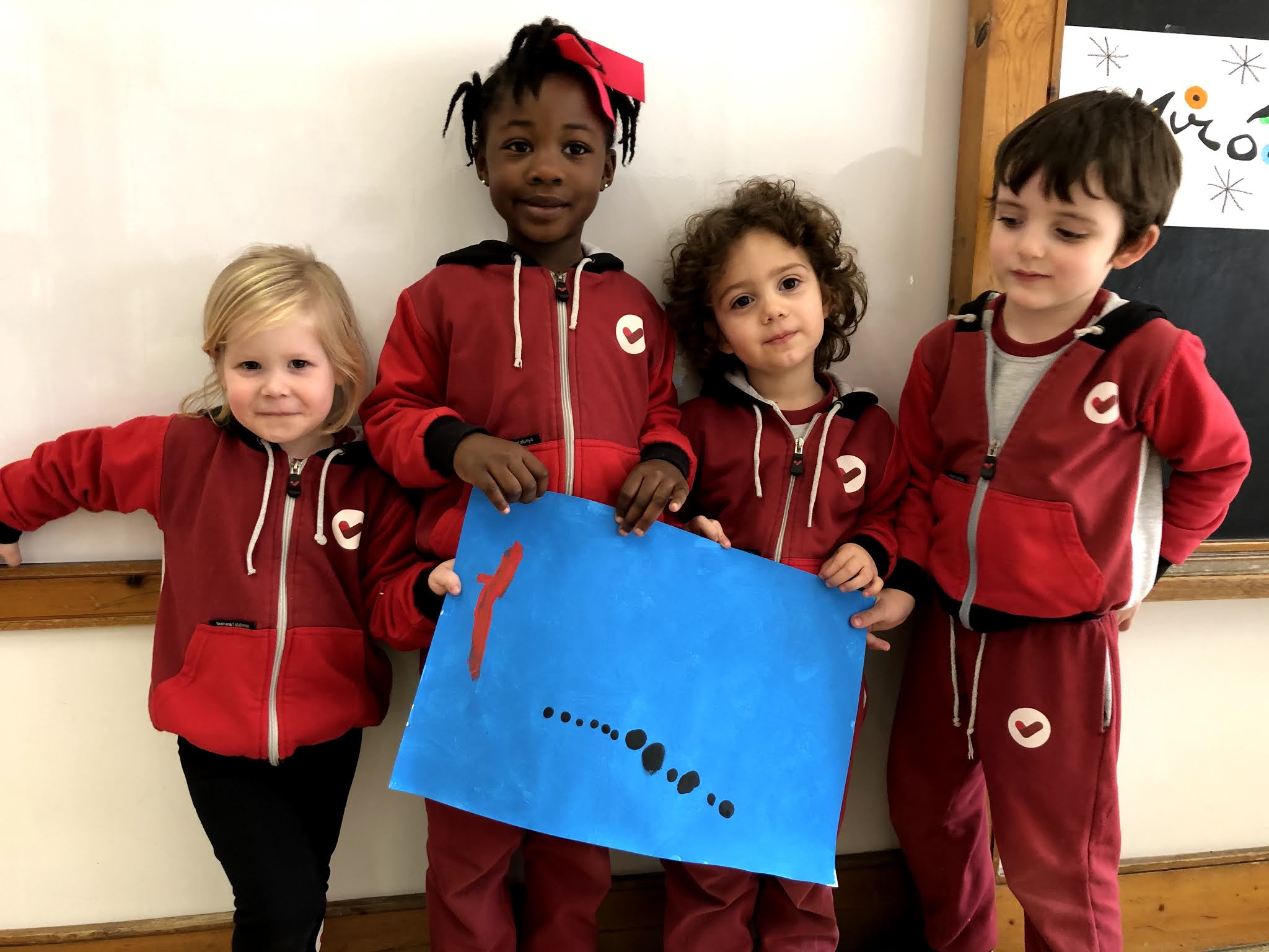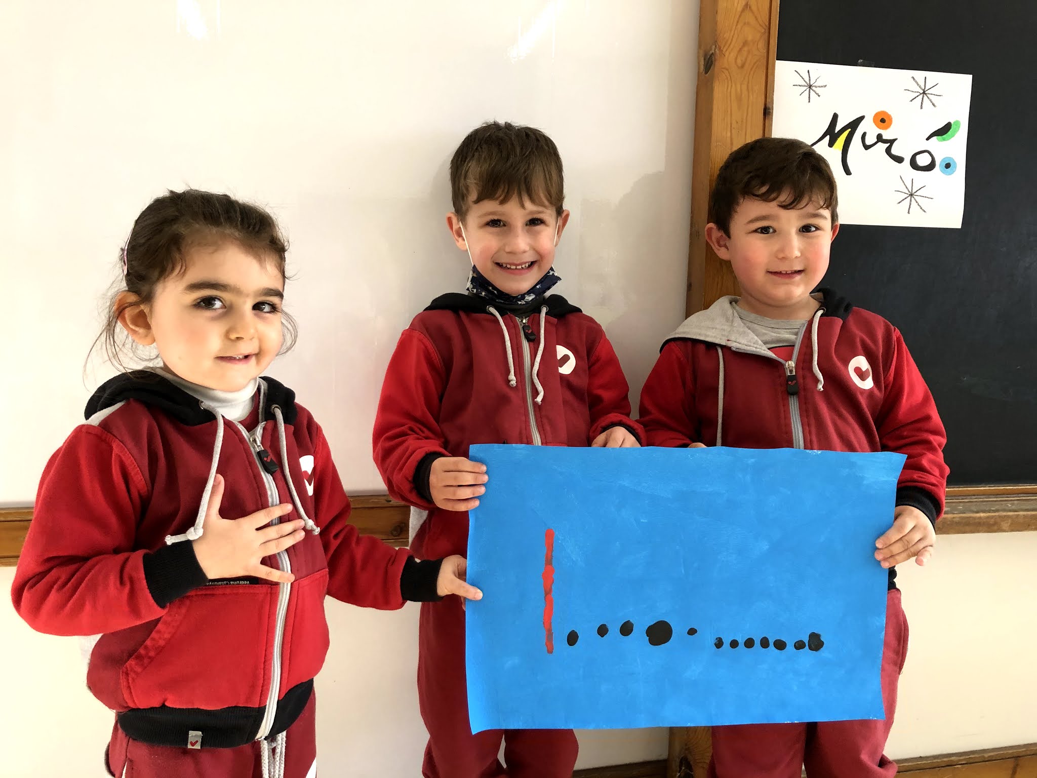 Aquesta setmana hem continuat amb el treball de Miró, tot inspirant-nos amb la seva obra d’art anomenada “Blau”. Per fer-ho, ens vam agrupar en petits grups. La primera sessió la vam dedicar a pintar el fons de color blau, amb pintura i rodets. En una altra sessió hem fet les línies i puntets, tot posant-nos d’acord entre nosaltres de qui feia cadascuna de les formes.