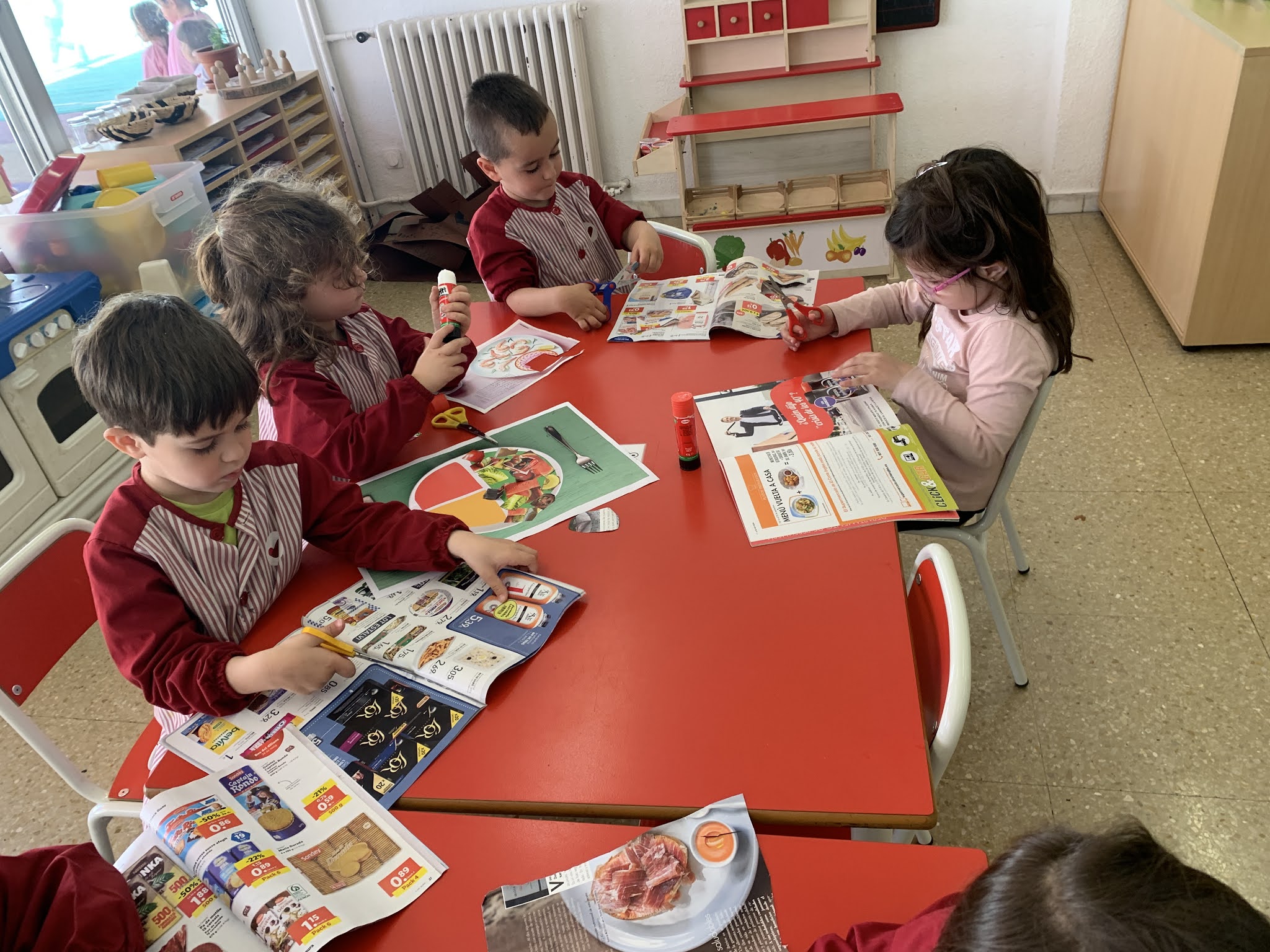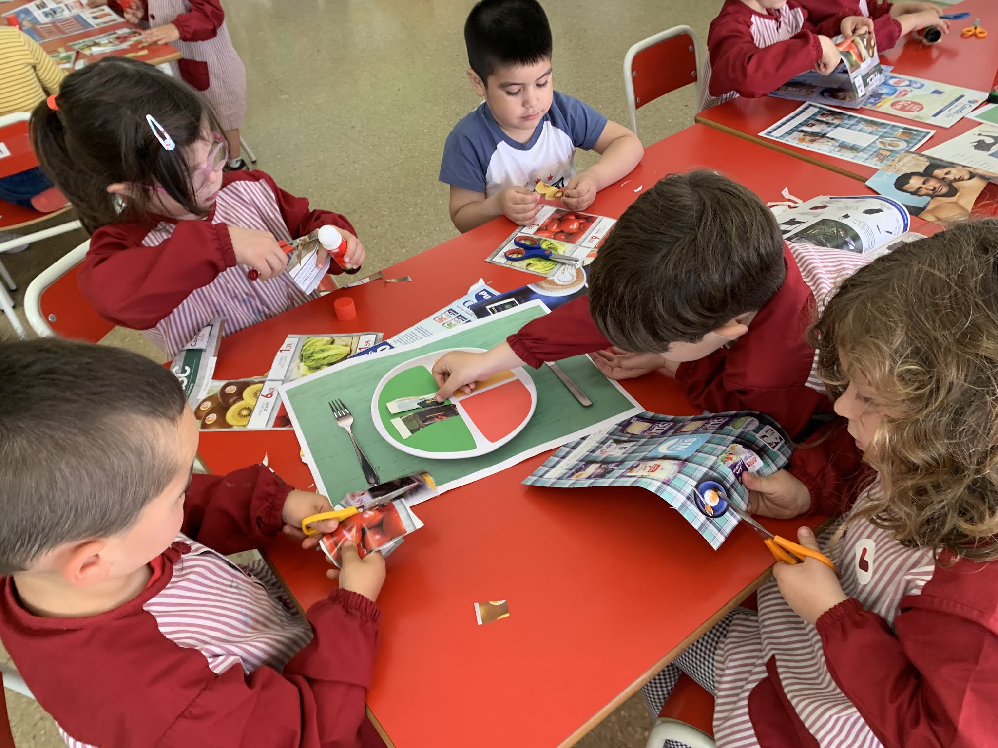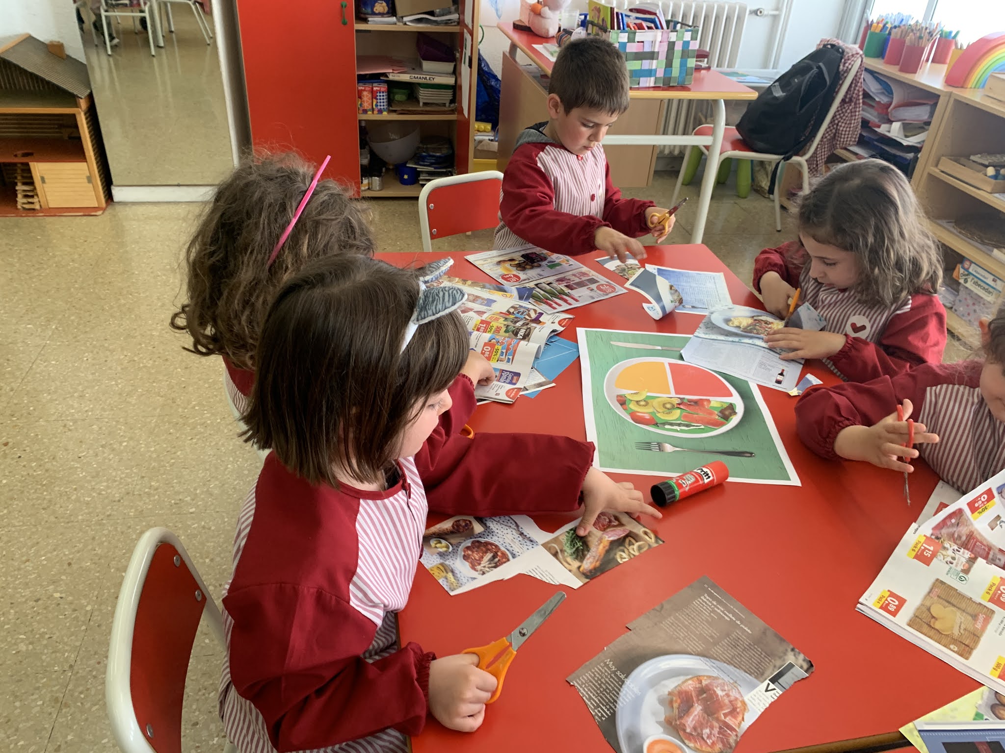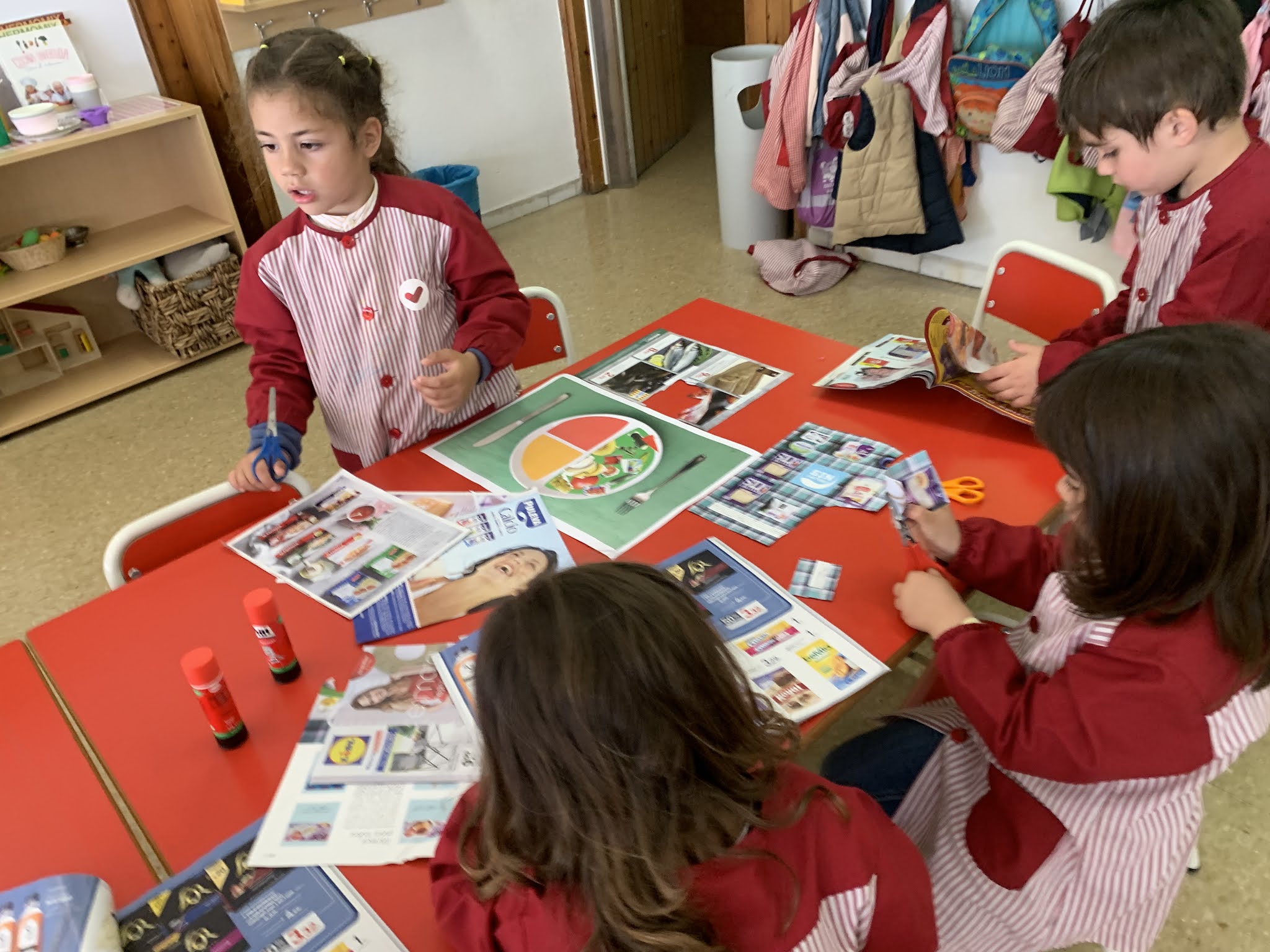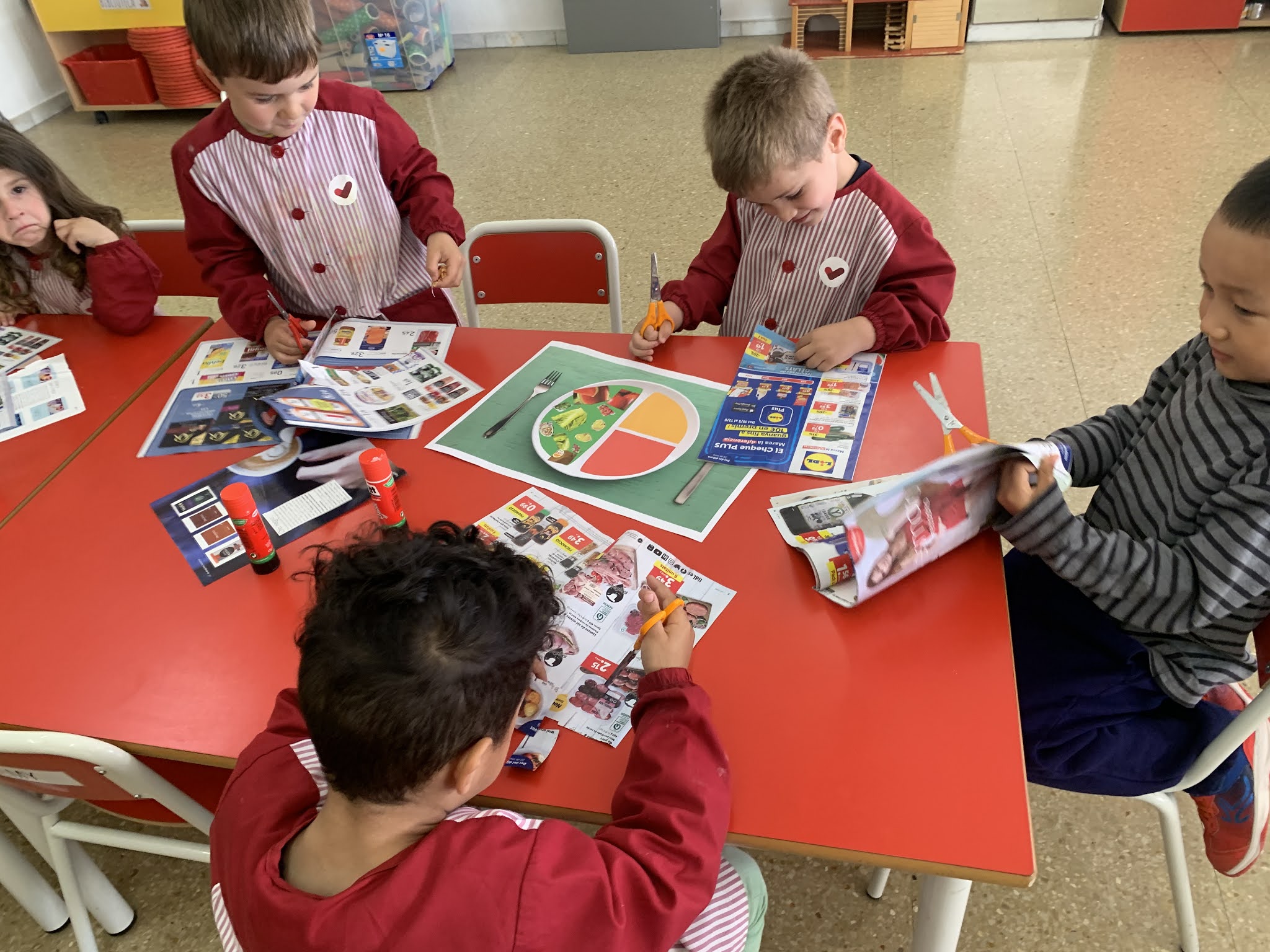 Per tal de treballar-ho, hem fet una activitat per grups. Després d’una conversa sobre els hàbits alimentaris i de jugar a la PDI a jocs sobre alimentació, cada grup tenia un plat dividit en els tres espais i hem portat revistes dels súpers i hem buscat menjar per a cada espai. L’hem retallat i enganxat on tocava. Ho voleu veure?