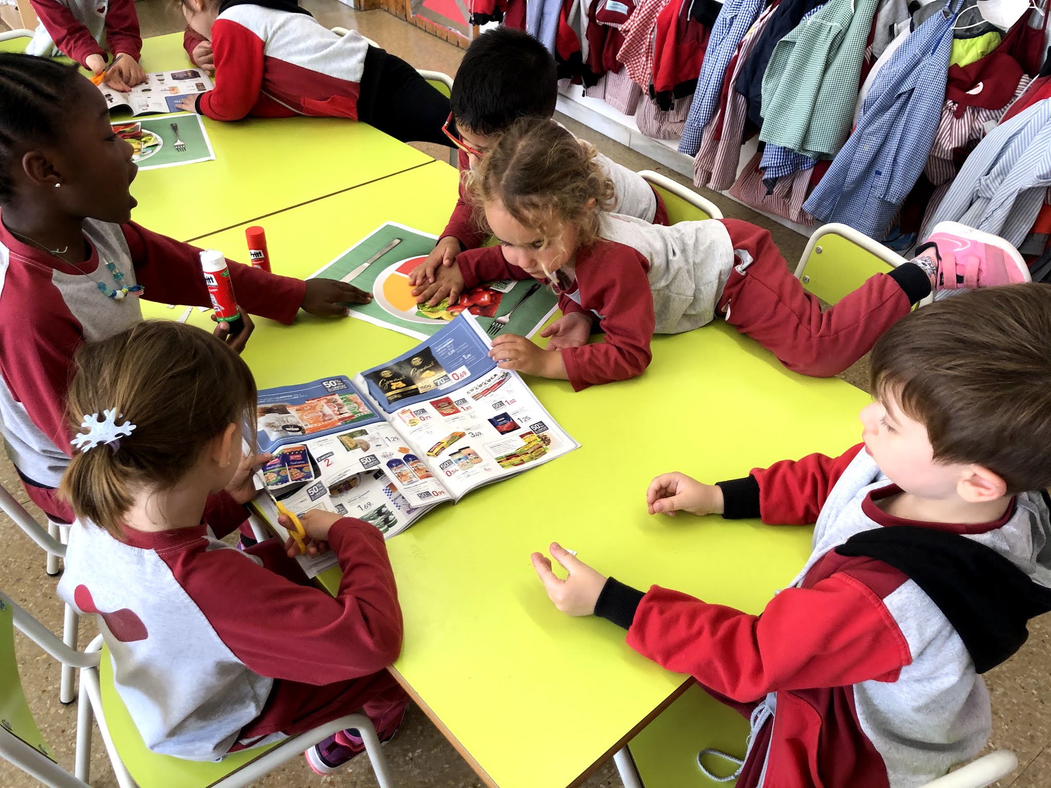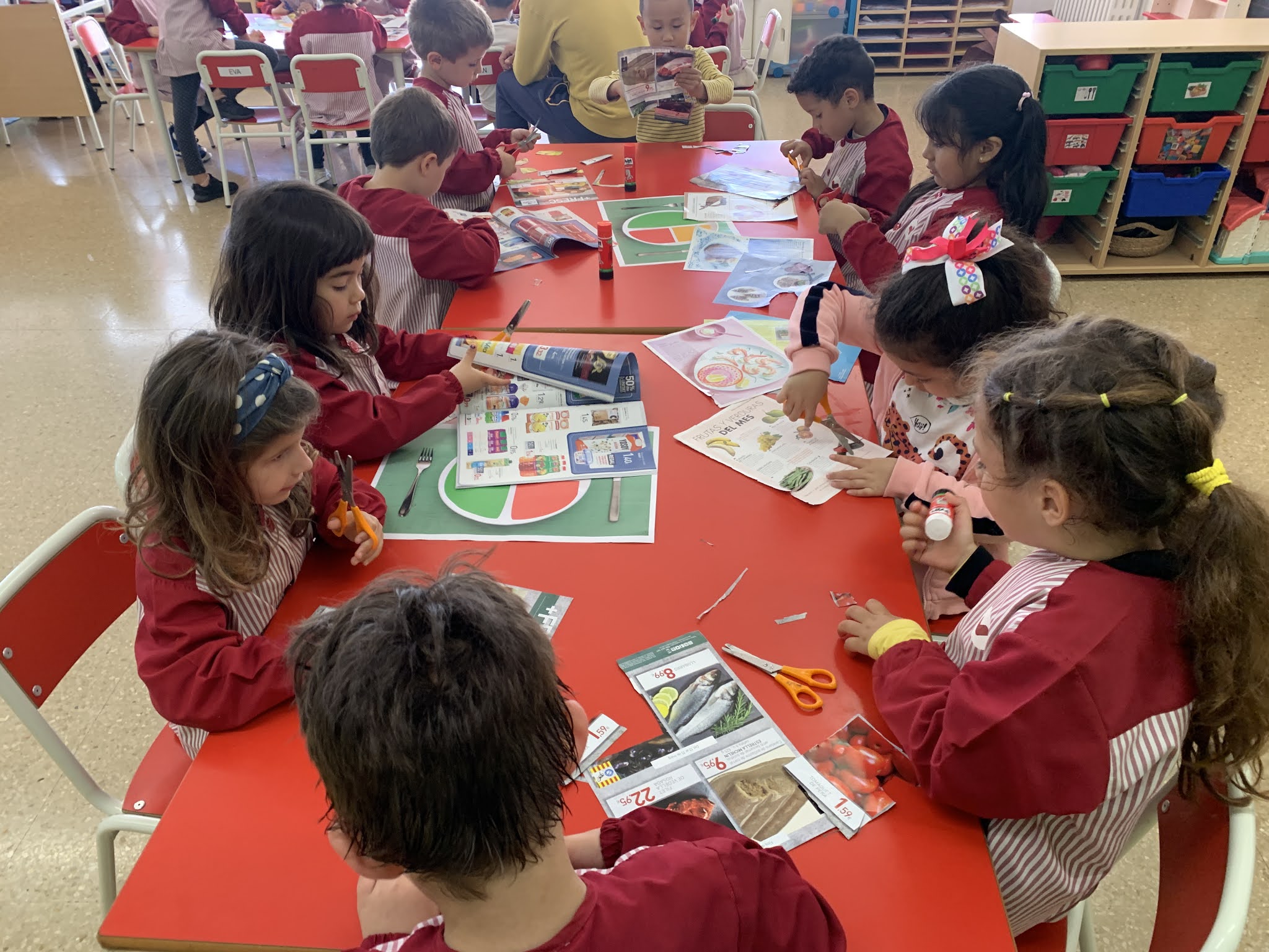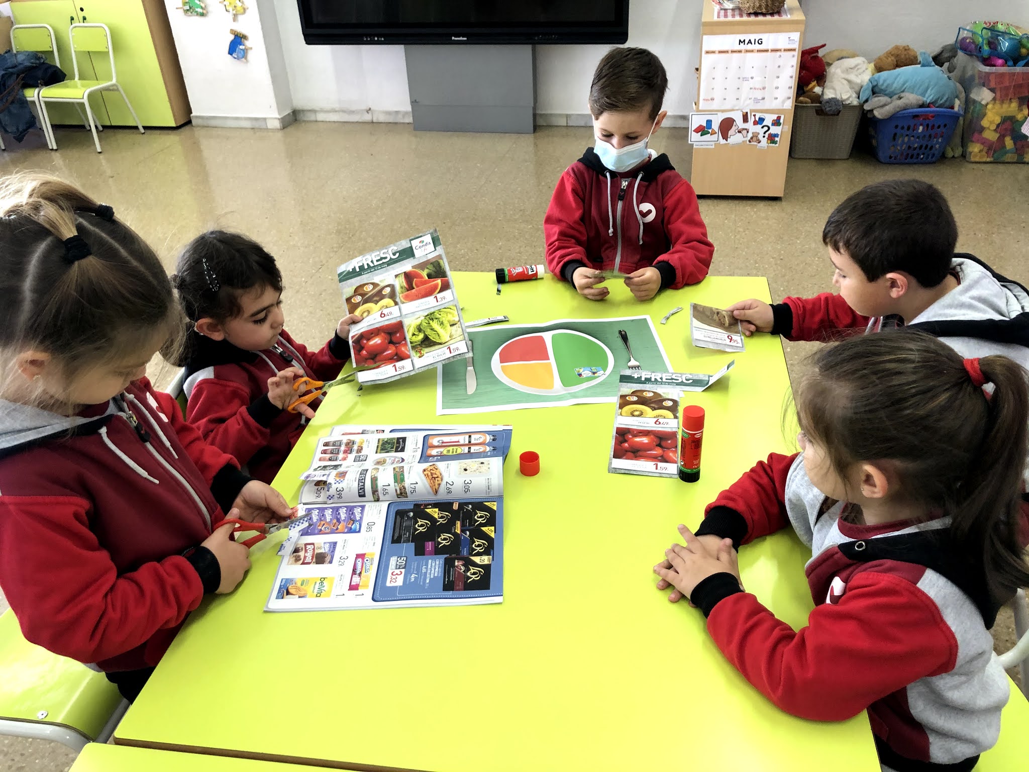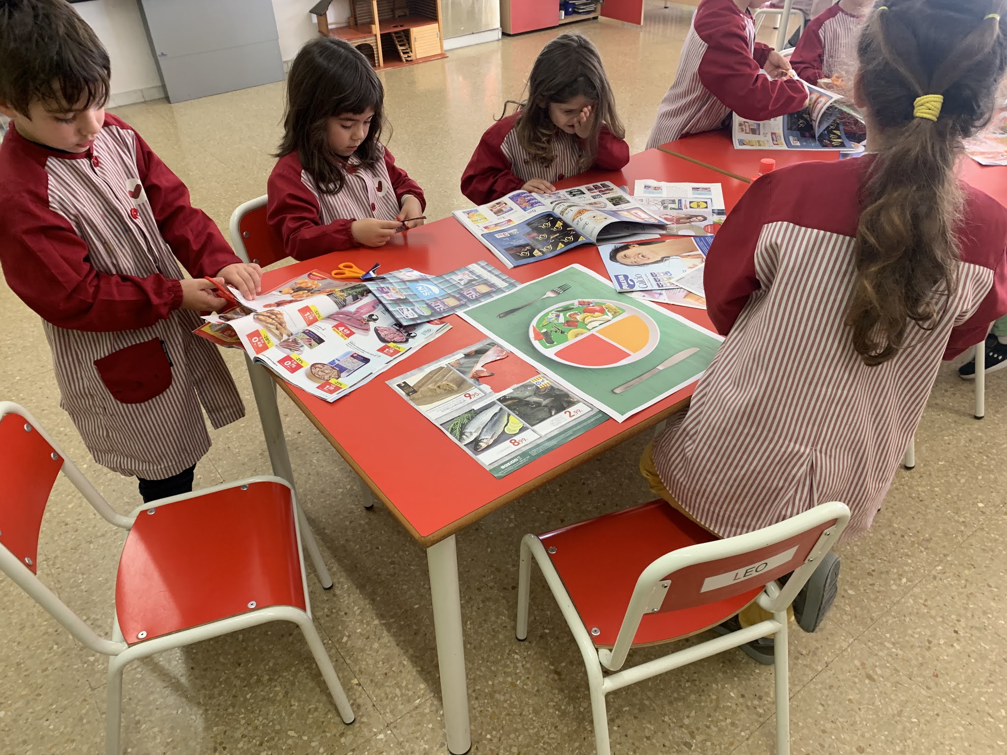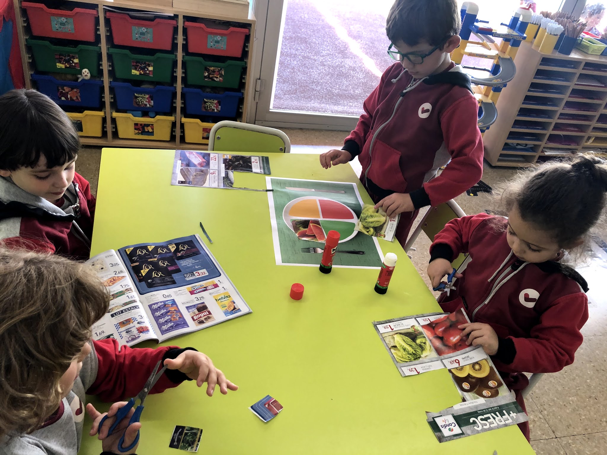 Per tal de treballar-ho, hem fet una activitat per grups. Després d’una conversa sobre els hàbits alimentaris i de jugar a la PDI a jocs sobre alimentació, cada grup tenia un plat dividit en els tres espais i hem portat revistes dels súpers i hem buscat menjar per a cada espai. L’hem retallat i enganxat on tocava. Ho voleu veure?