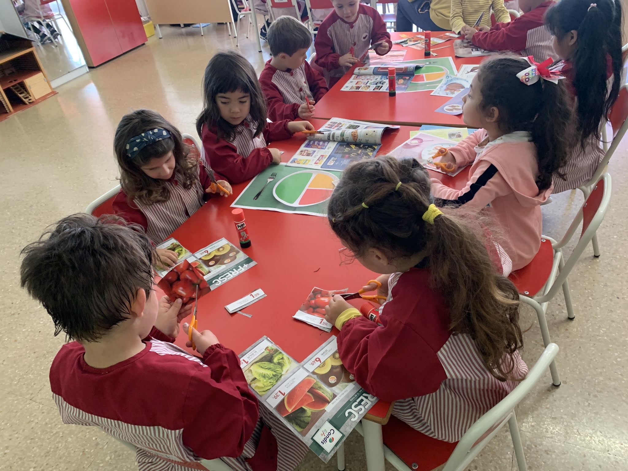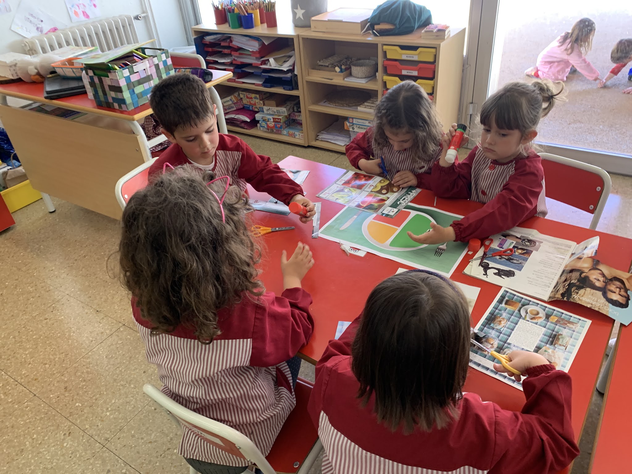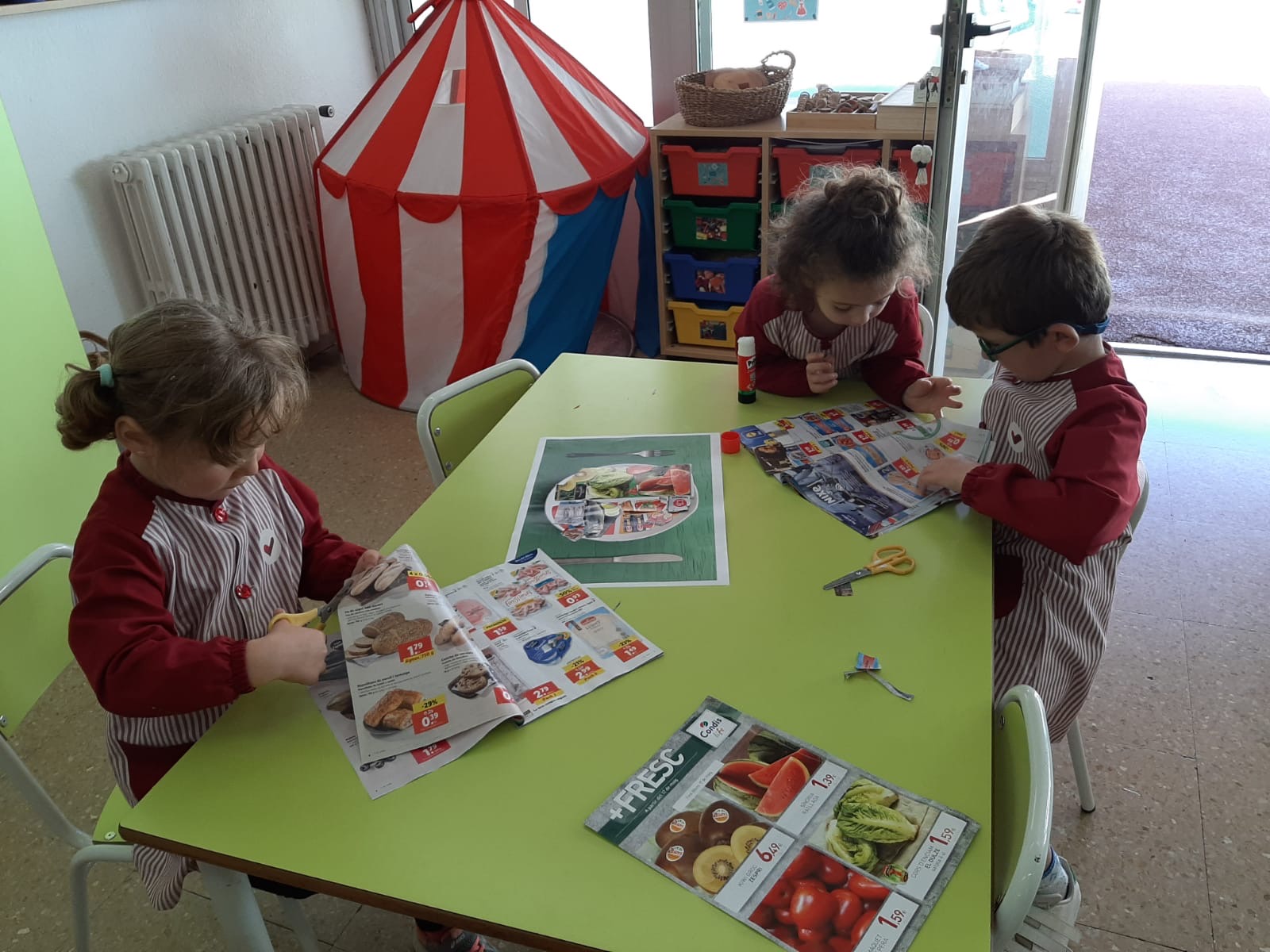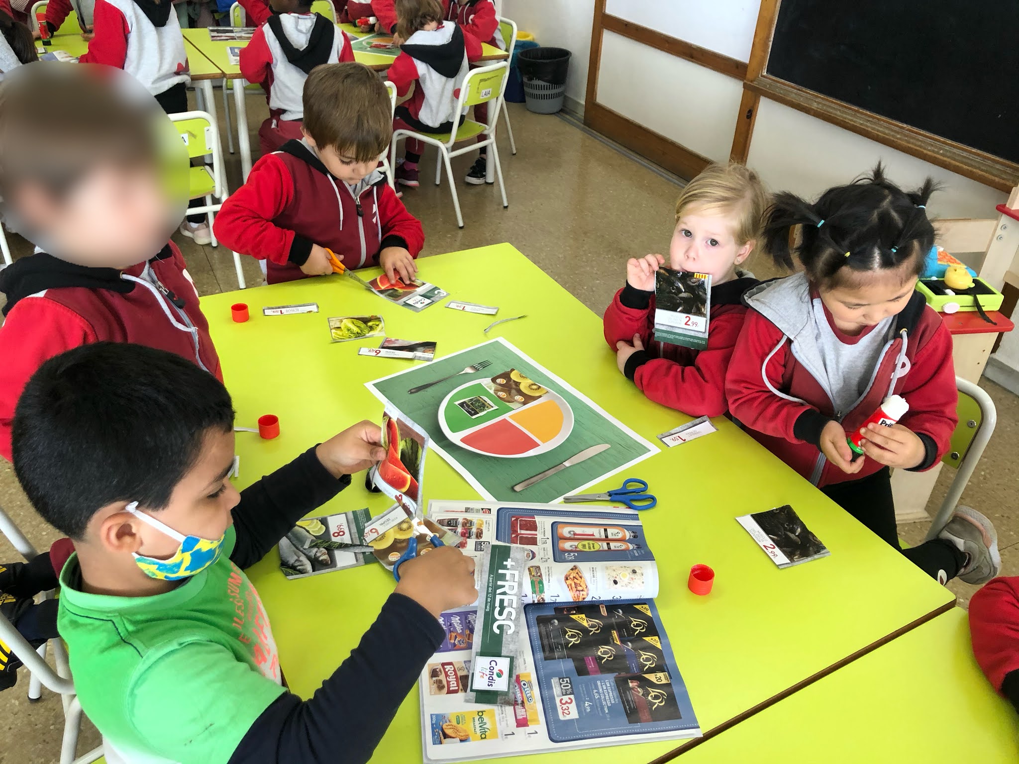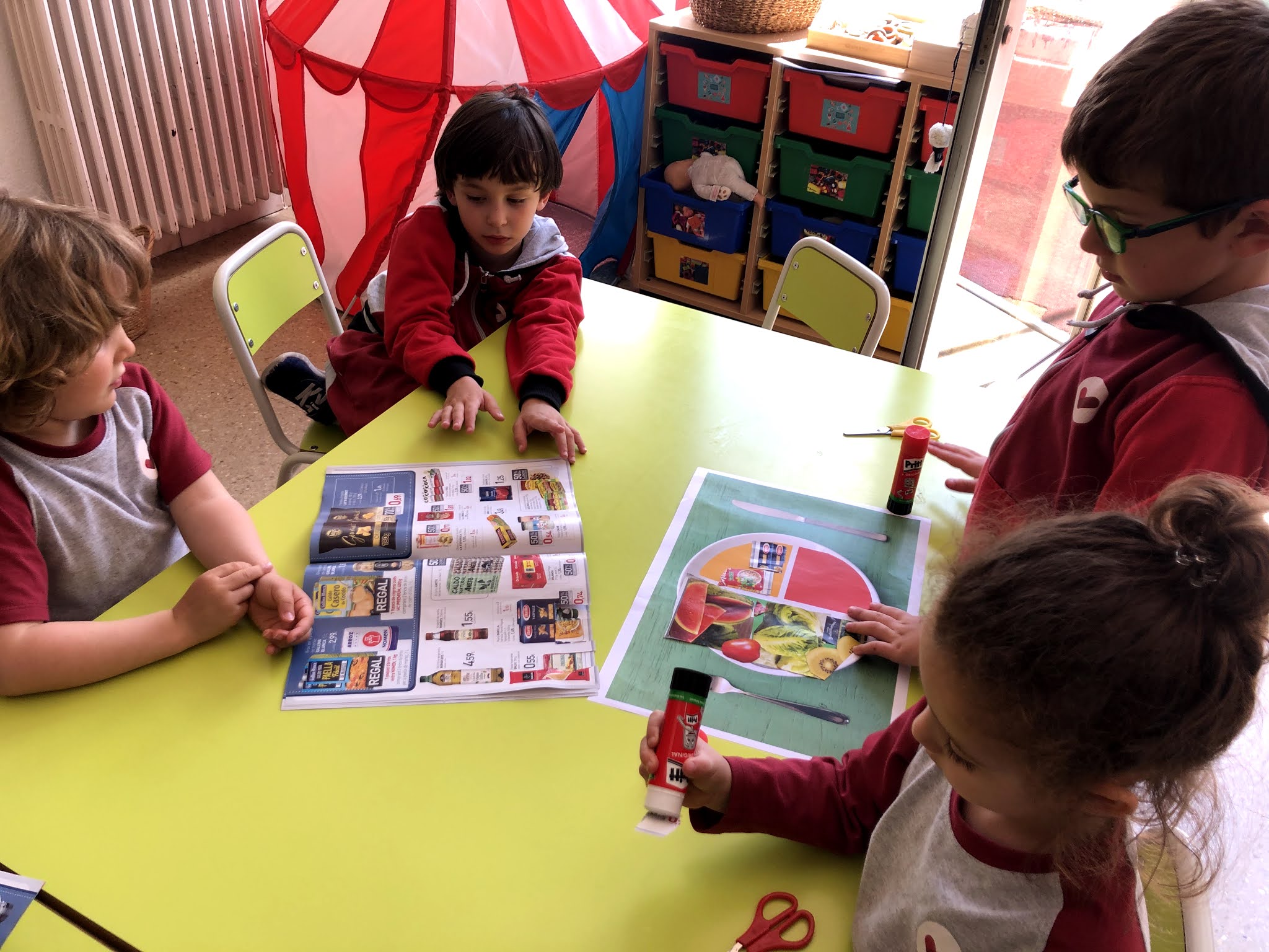 Per tal de treballar-ho, hem fet una activitat per grups. Després d’una conversa sobre els hàbits alimentaris i de jugar a la PDI a jocs sobre alimentació, cada grup tenia un plat dividit en els tres espais i hem portat revistes dels súpers i hem buscat menjar per a cada espai. L’hem retallat i enganxat on tocava. Ho voleu veure?
