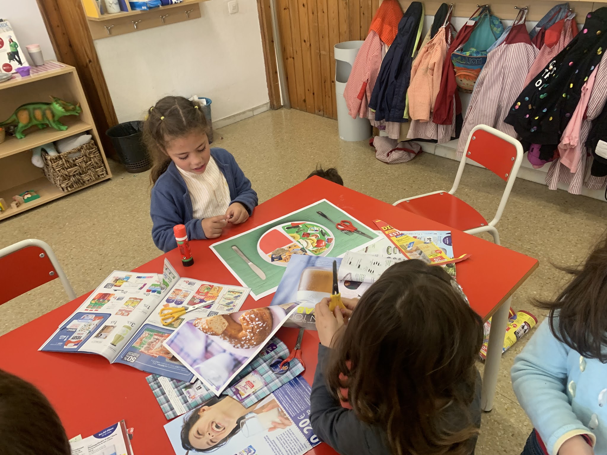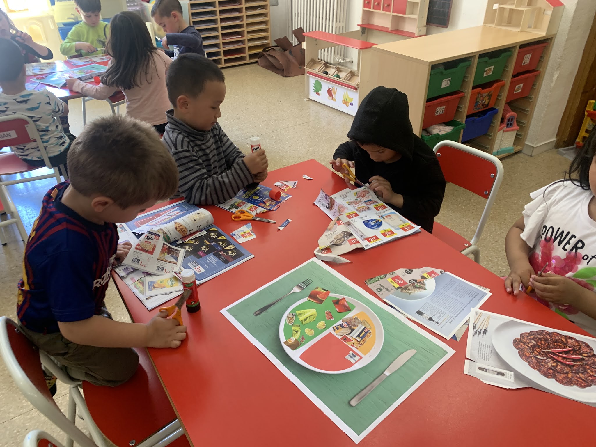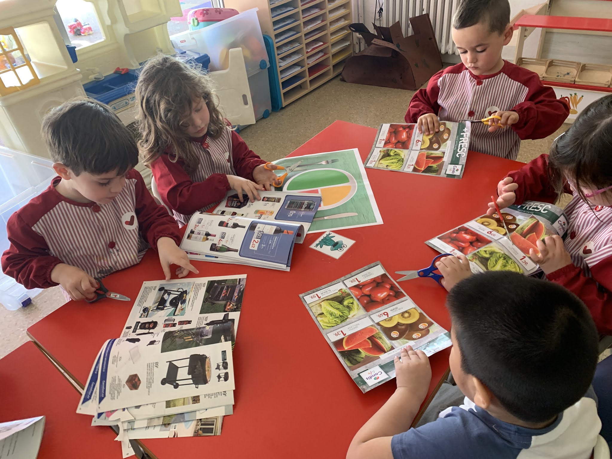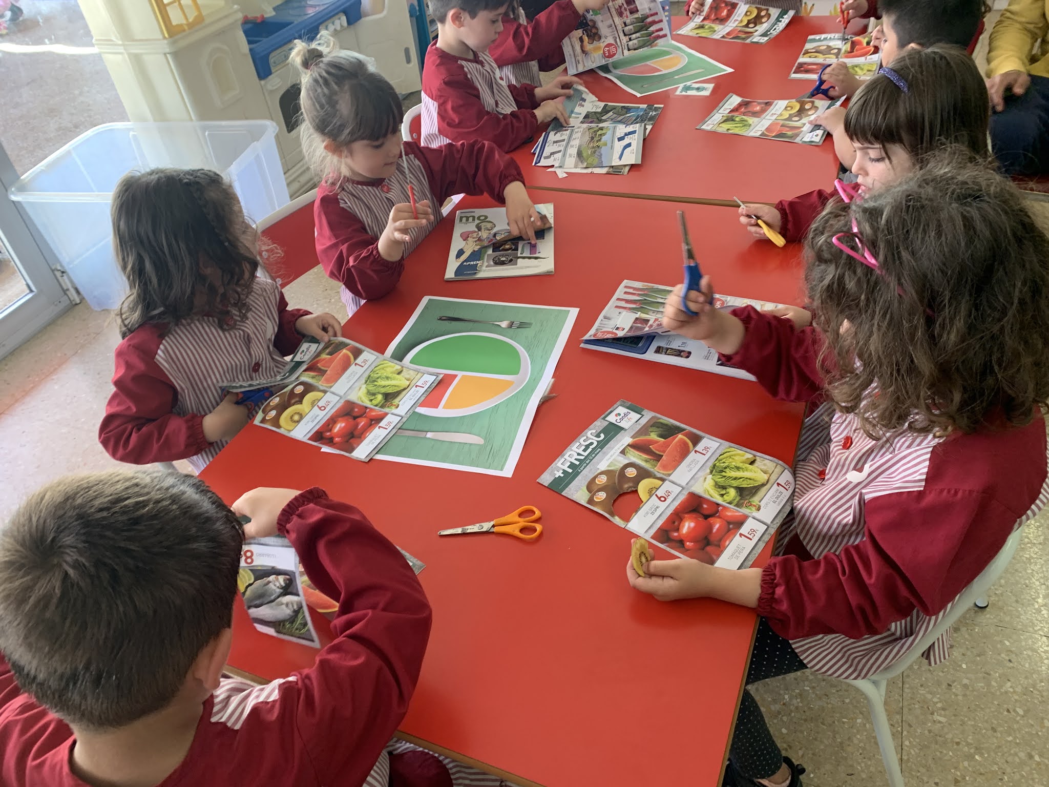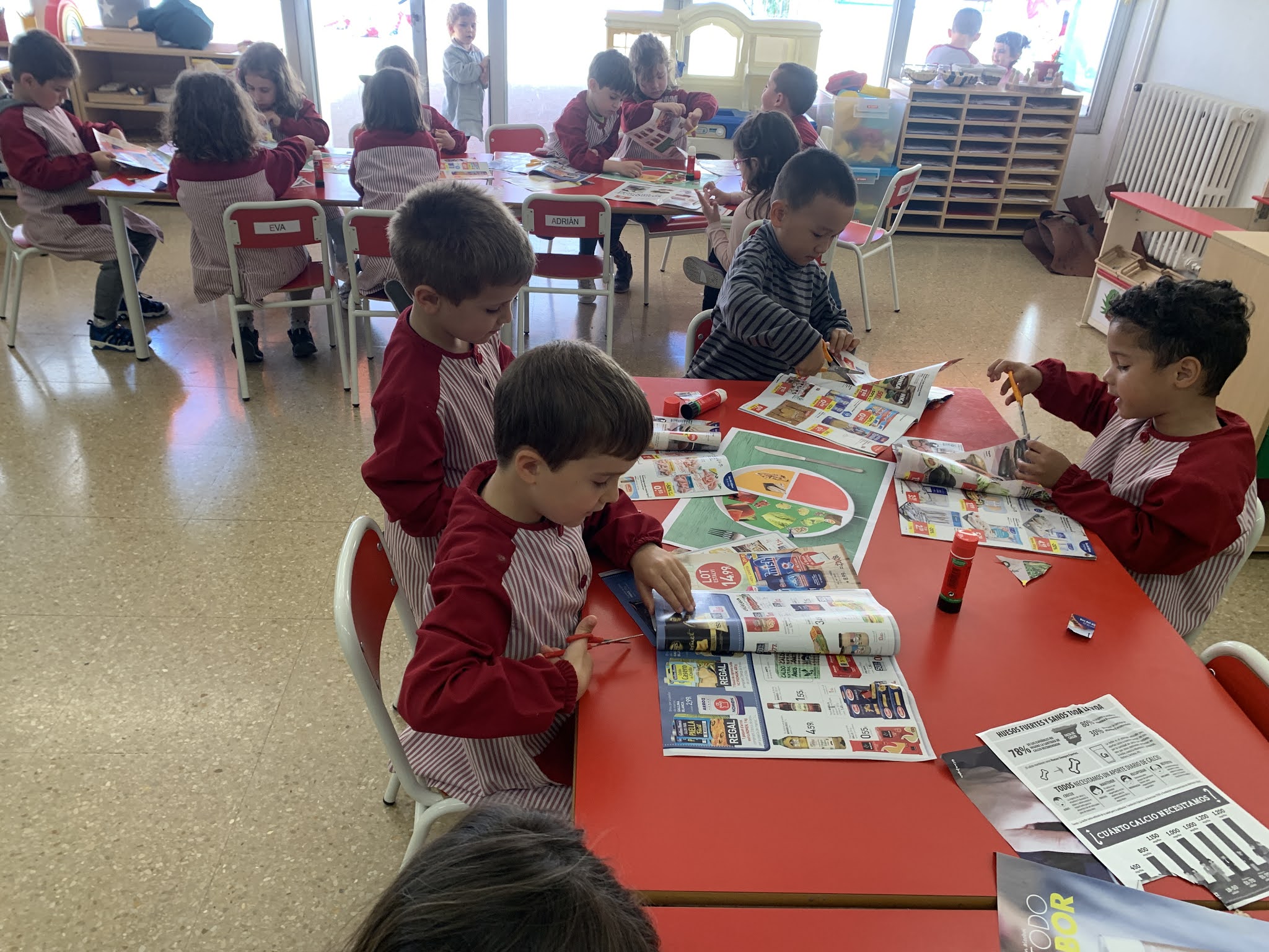 Per tal de treballar-ho, hem fet una activitat per grups. Després d’una conversa sobre els hàbits alimentaris i de jugar a la PDI a jocs sobre alimentació, cada grup tenia un plat dividit en els tres espais i hem portat revistes dels súpers i hem buscat menjar per a cada espai. L’hem retallat i enganxat on tocava. Ho voleu veure?