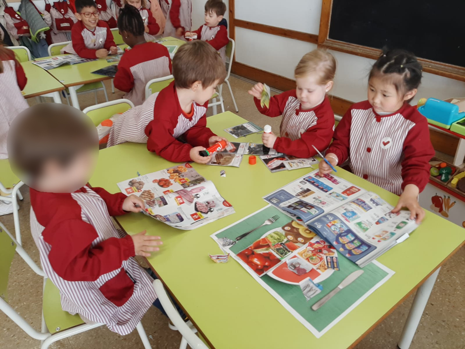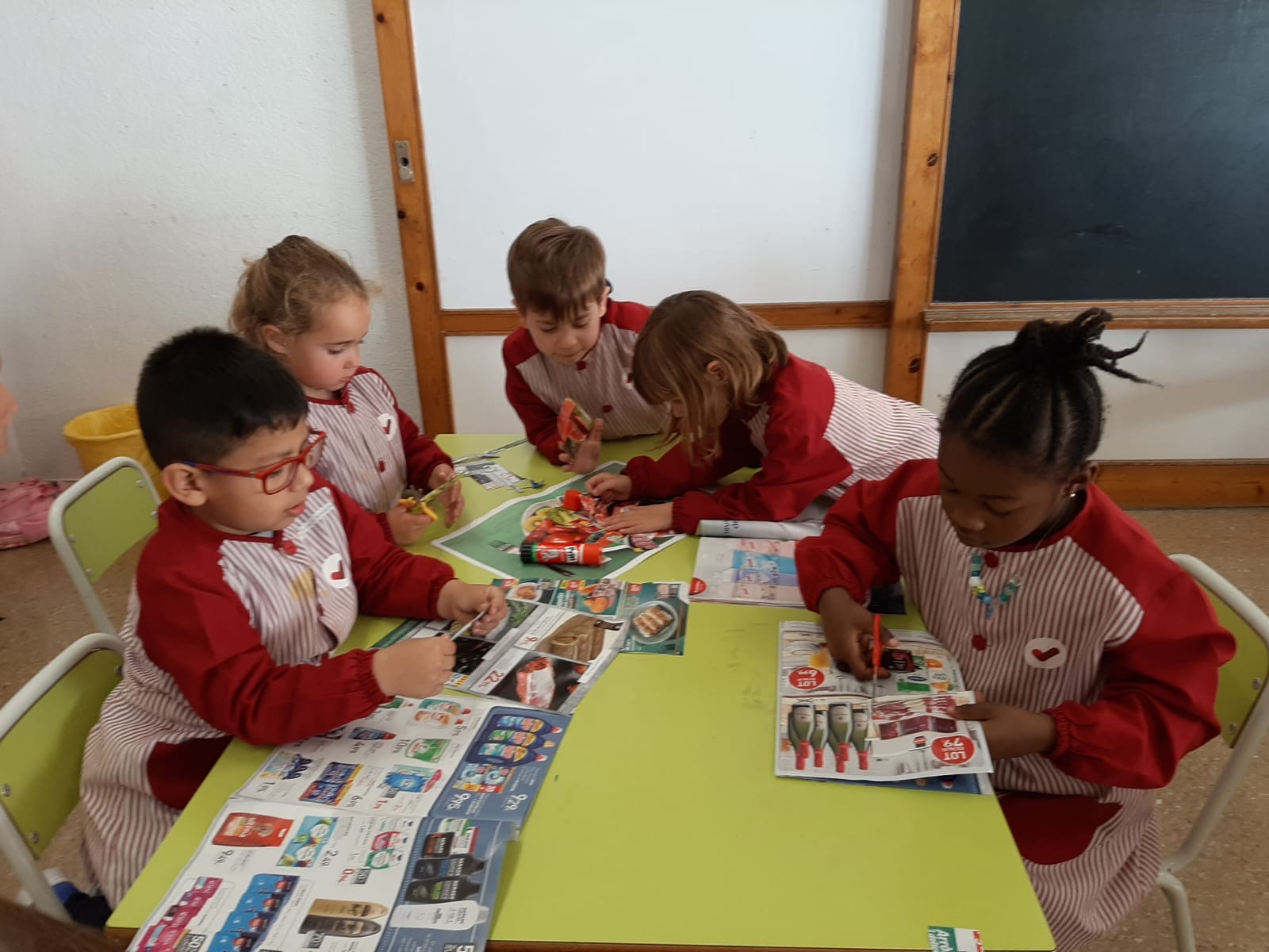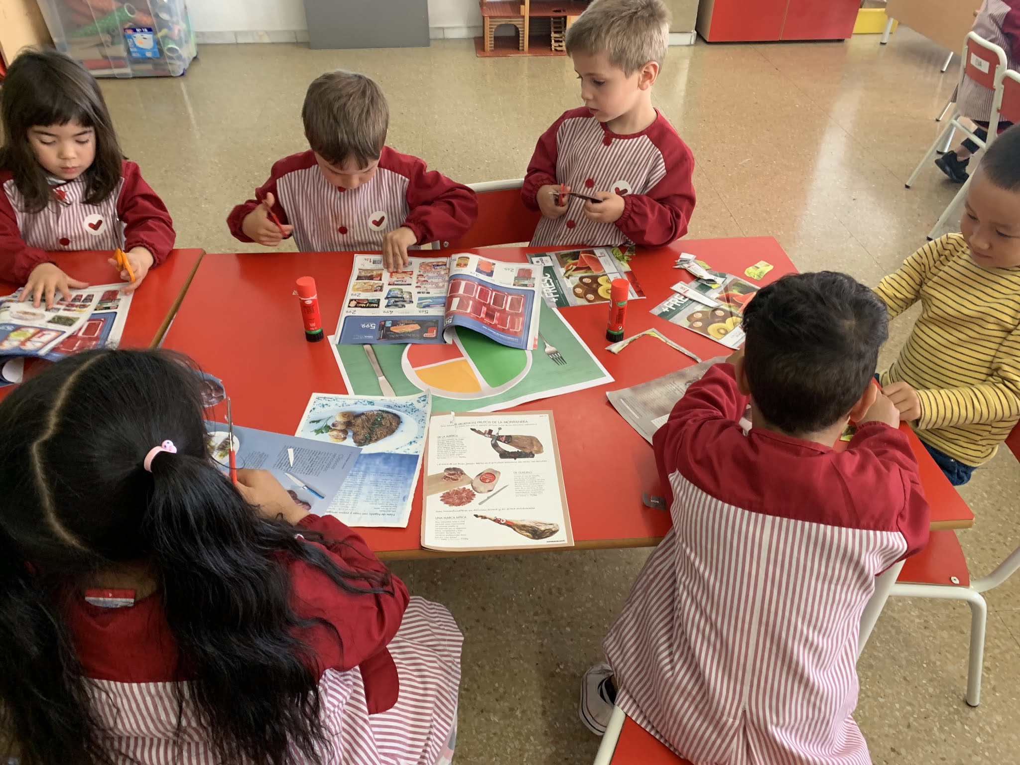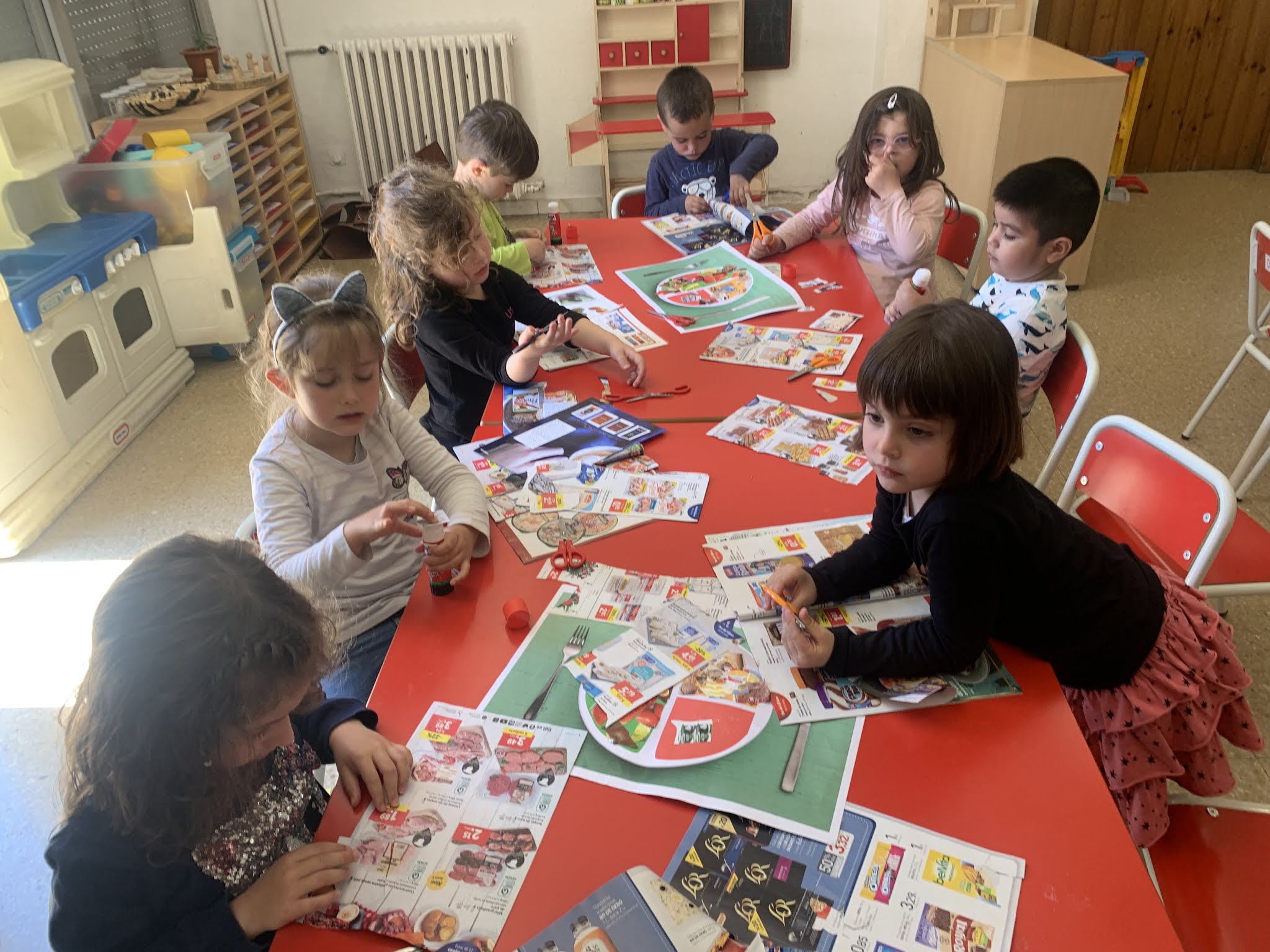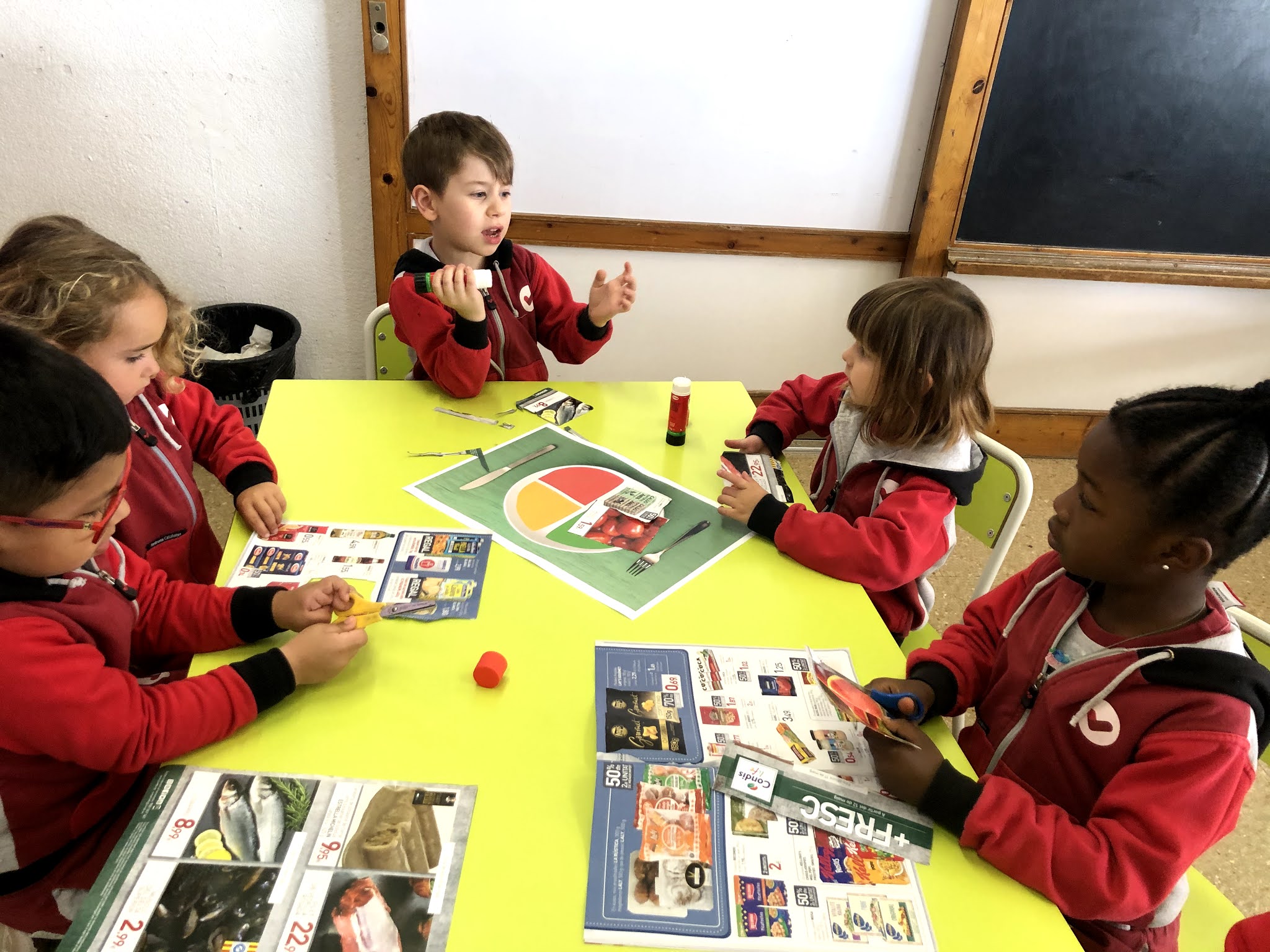 Per tal de treballar-ho, hem fet una activitat per grups. Després d’una conversa sobre els hàbits alimentaris i de jugar a la PDI a jocs sobre alimentació, cada grup tenia un plat dividit en els tres espais i hem portat revistes dels súpers i hem buscat menjar per a cada espai. L’hem retallat i enganxat on tocava. Ho voleu veure?