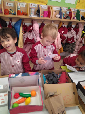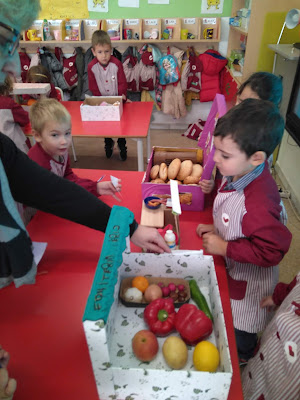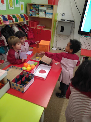 Ens ho passem genial jugant mentre aprenem vocabulari específic del mercat i interactuem posant-nos en els papers de compradors i venedors, amb diners i tot!!!