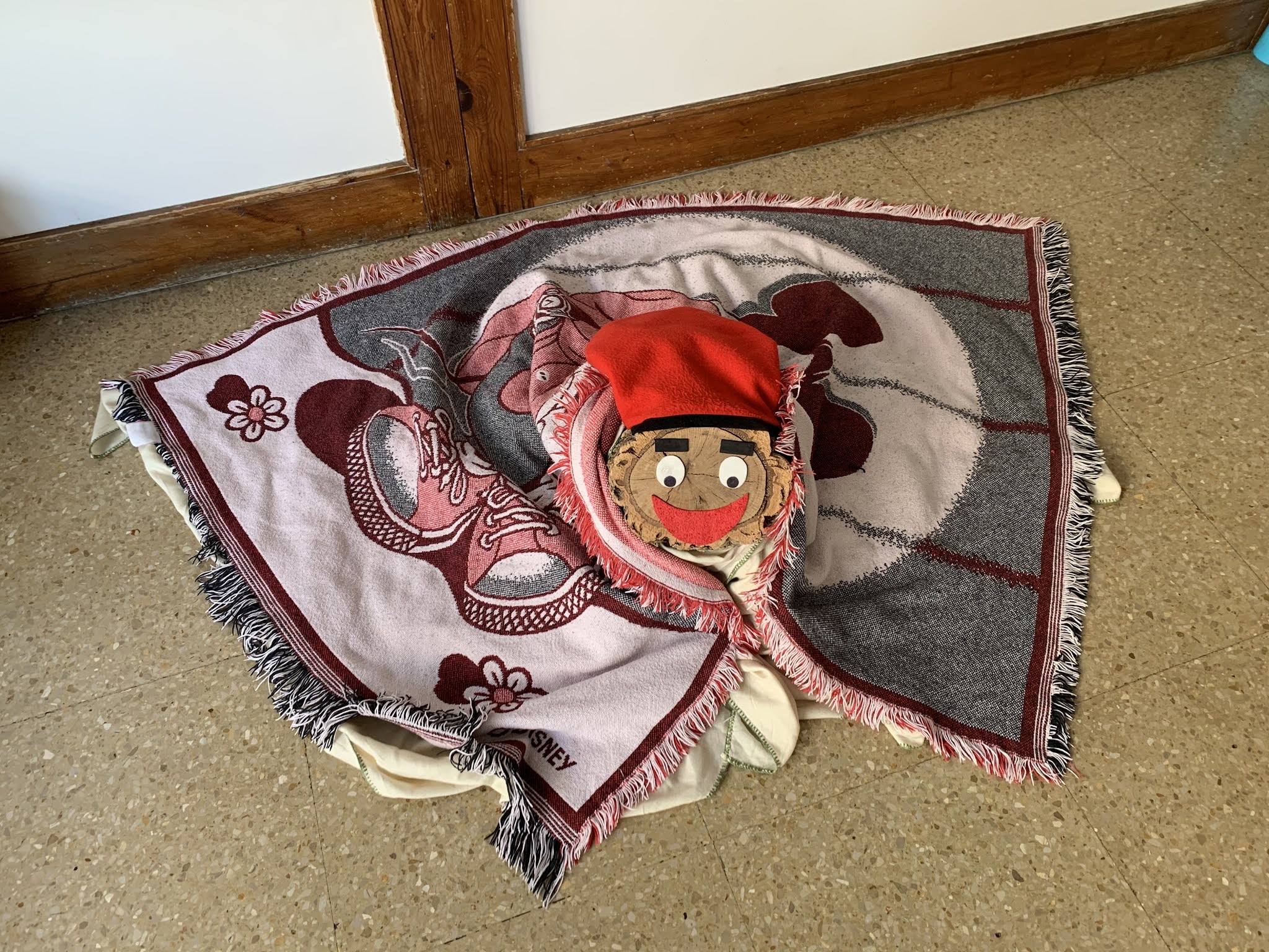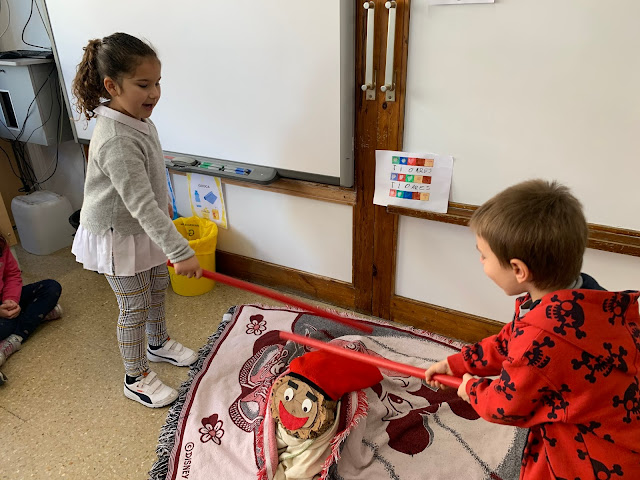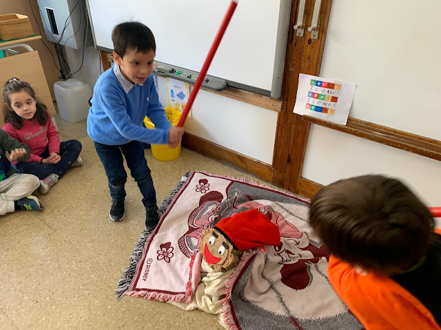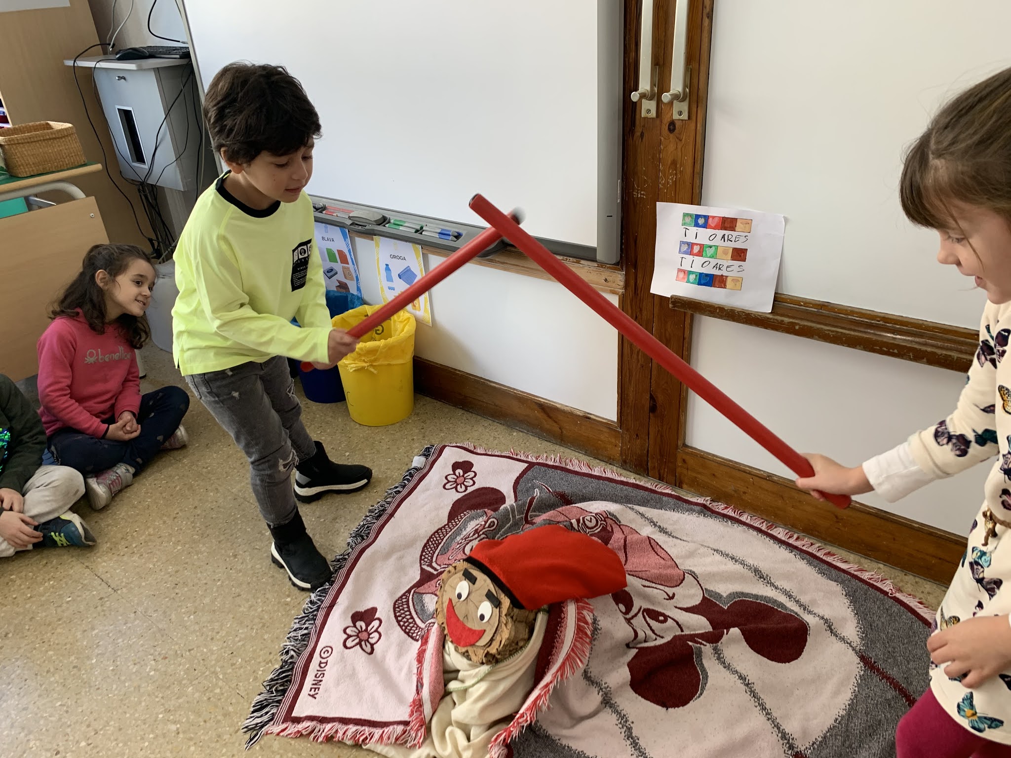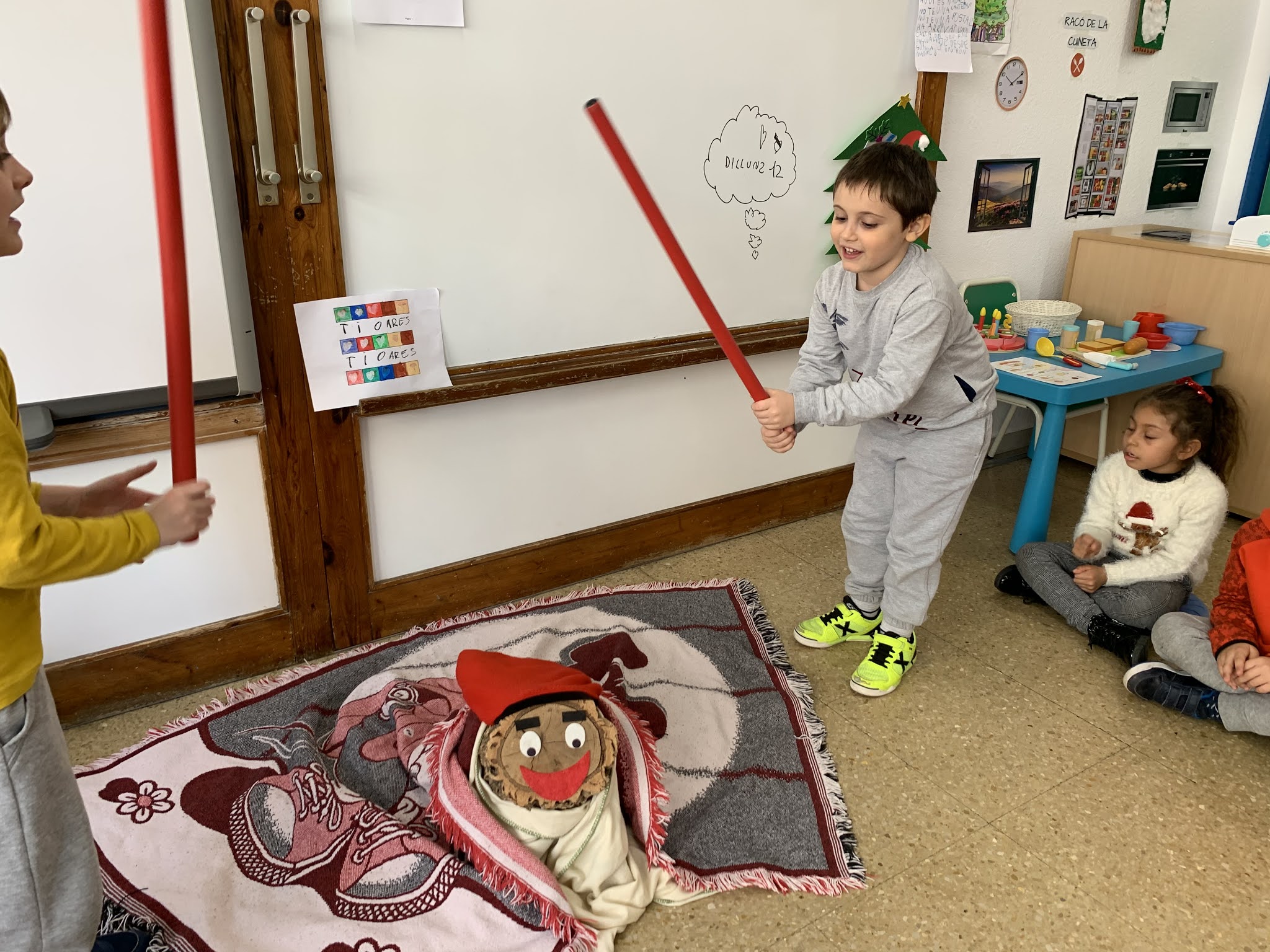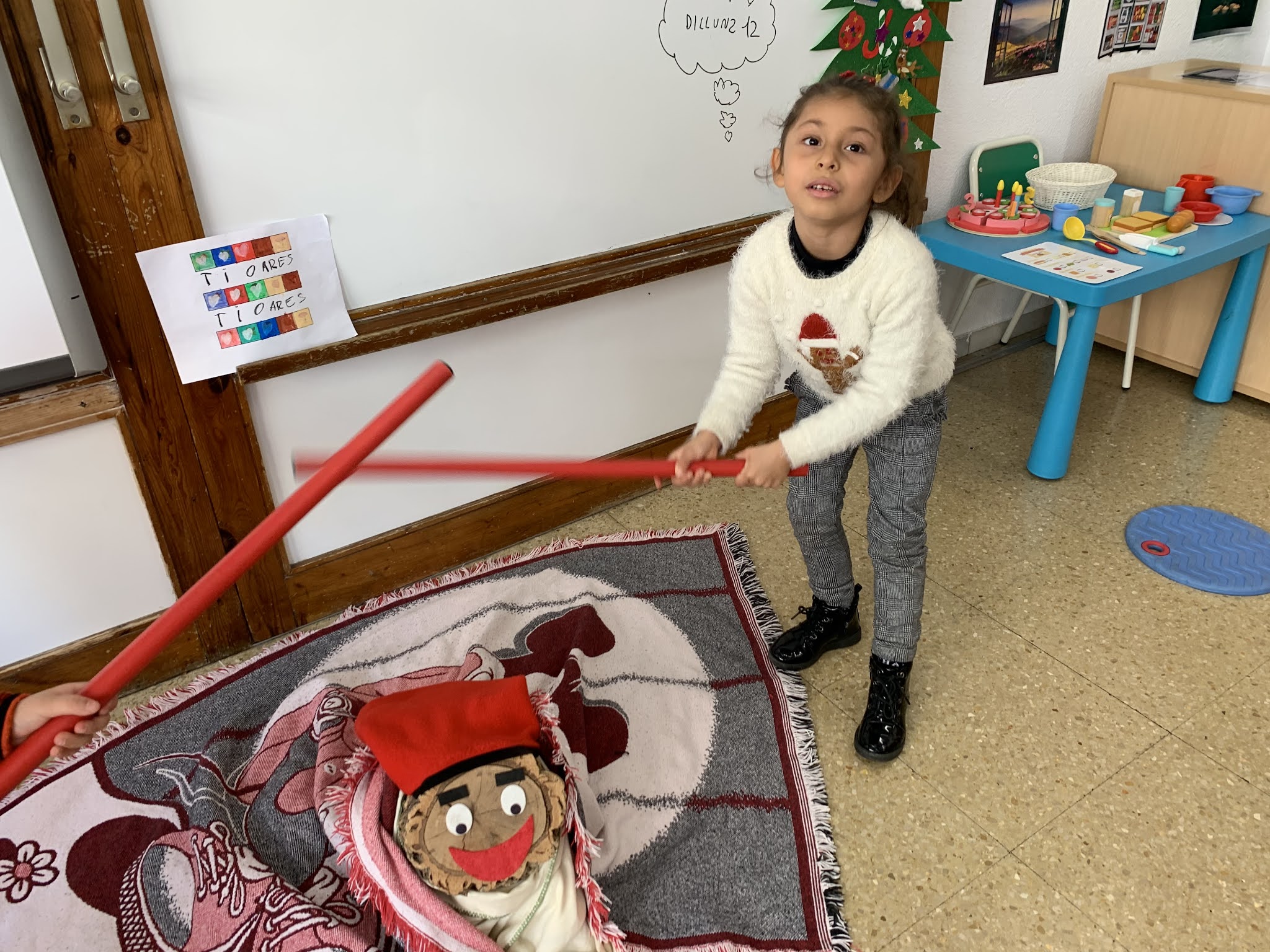 Per a fer-lo cagar l’hem anat picant amb el bastó de dos en dos tot cantant la cançó… “caga tió, avellanes i torró…” un cop hem picat tots i totes, hem mira’t si teníem alguna coseta i…. sorpresa!, teníem un munt de regalets i xocolatines!!!