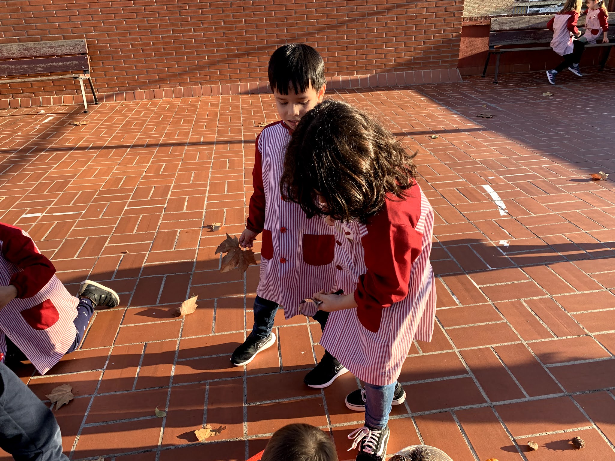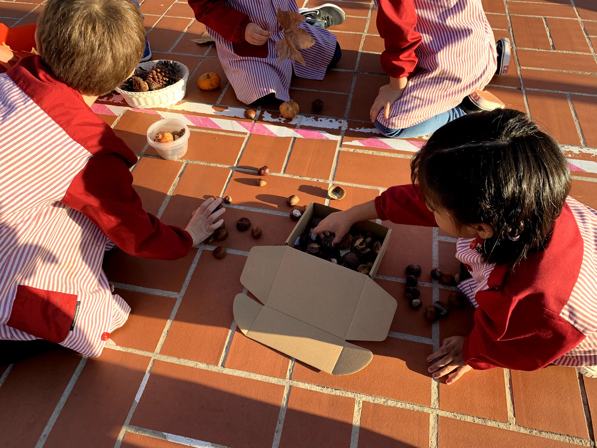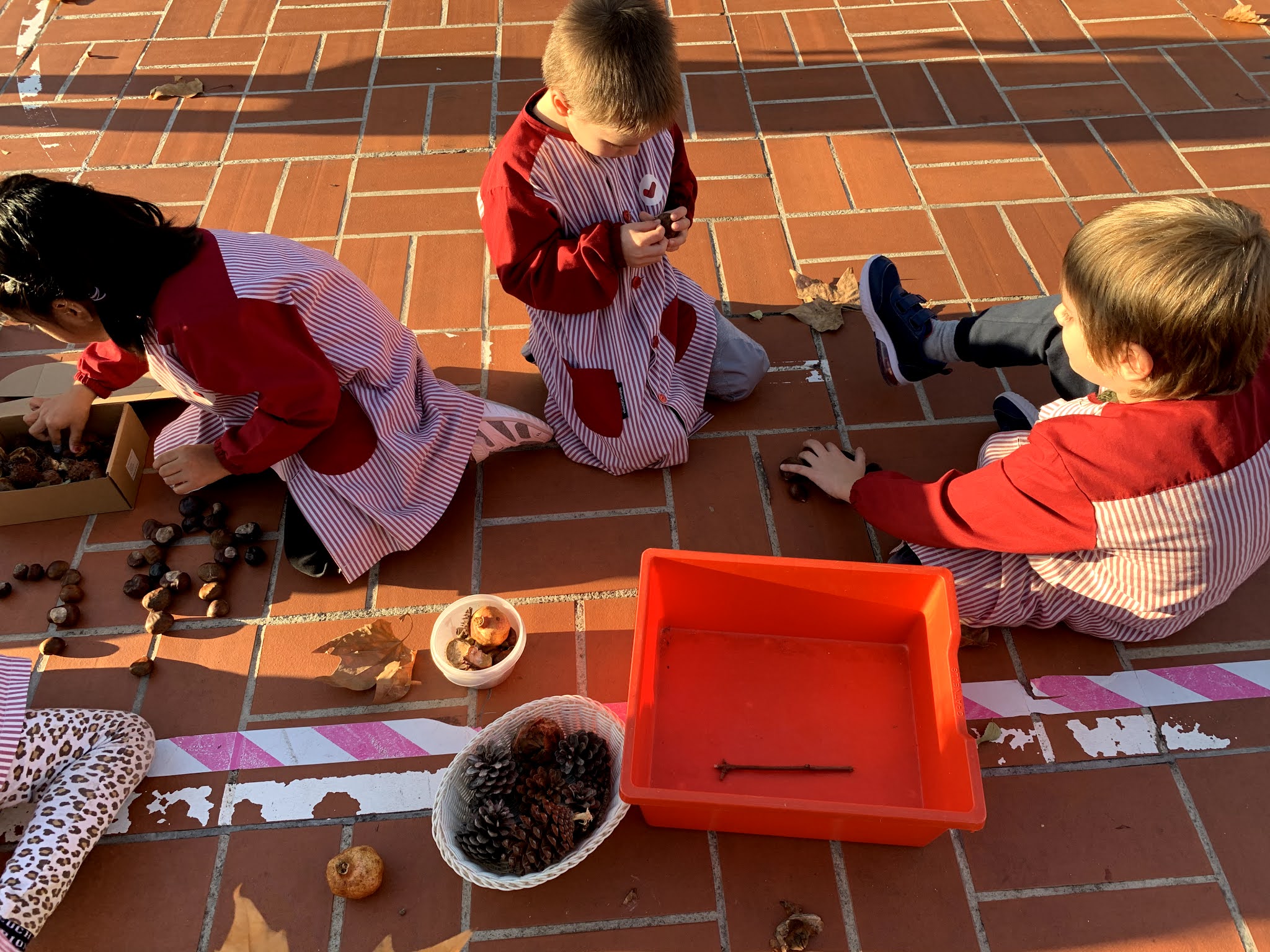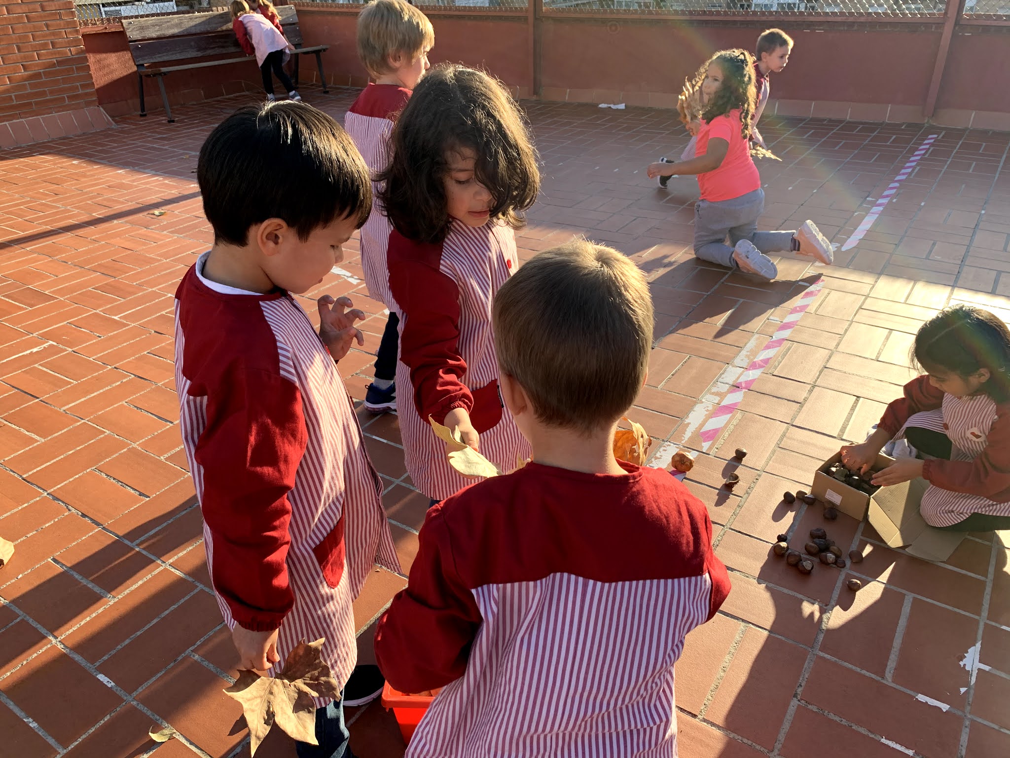 Els alumnes de les dues classes de P5 ens hem començat a acomiadar dels elements de la tardor que havíem anat recollint durant aquestes setmanes. Comença a fer fred i s’acosta un canvi d’estació que ens fa aprofitar uns últims dies experimentant amb les fulles, les pinyes, els aglans, les castanyes, els pellons…