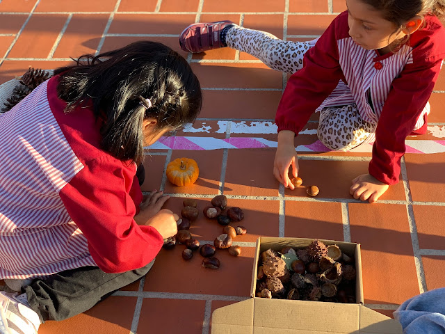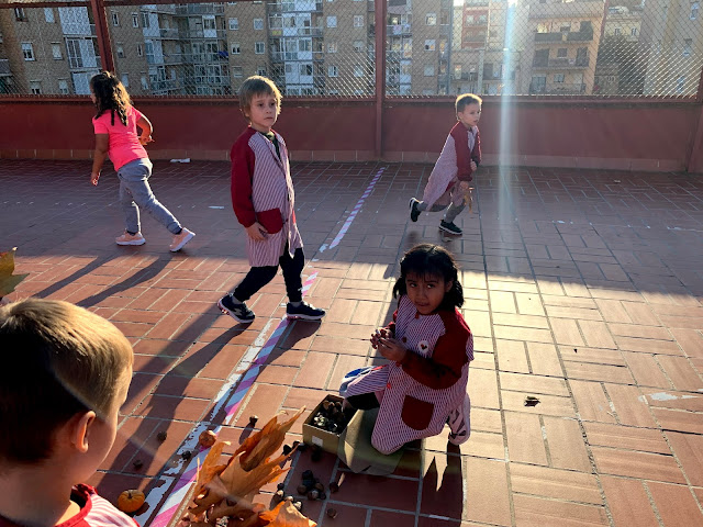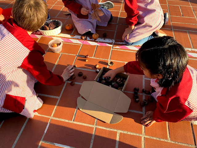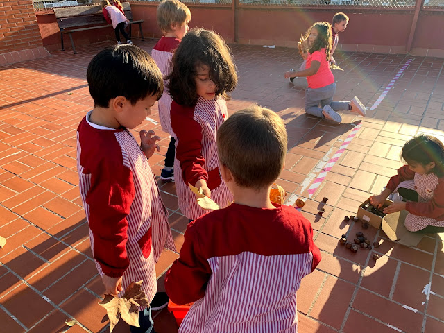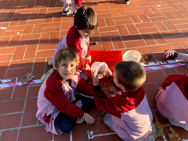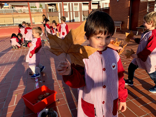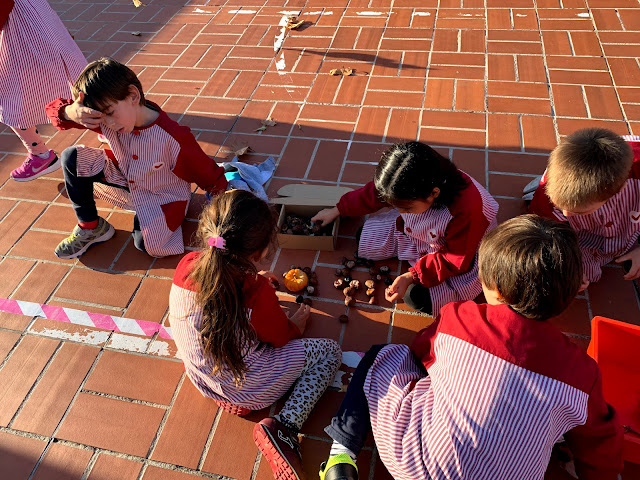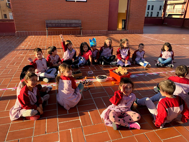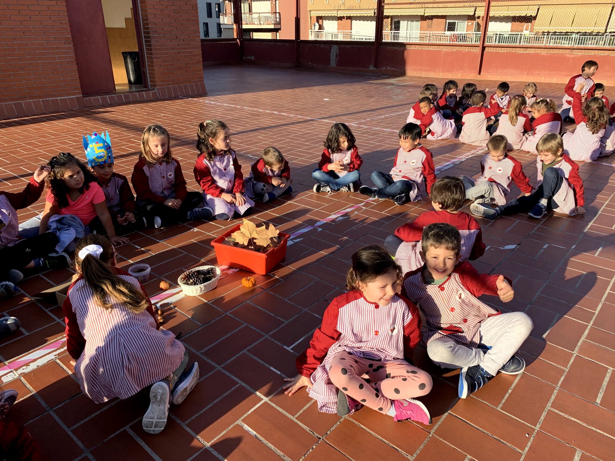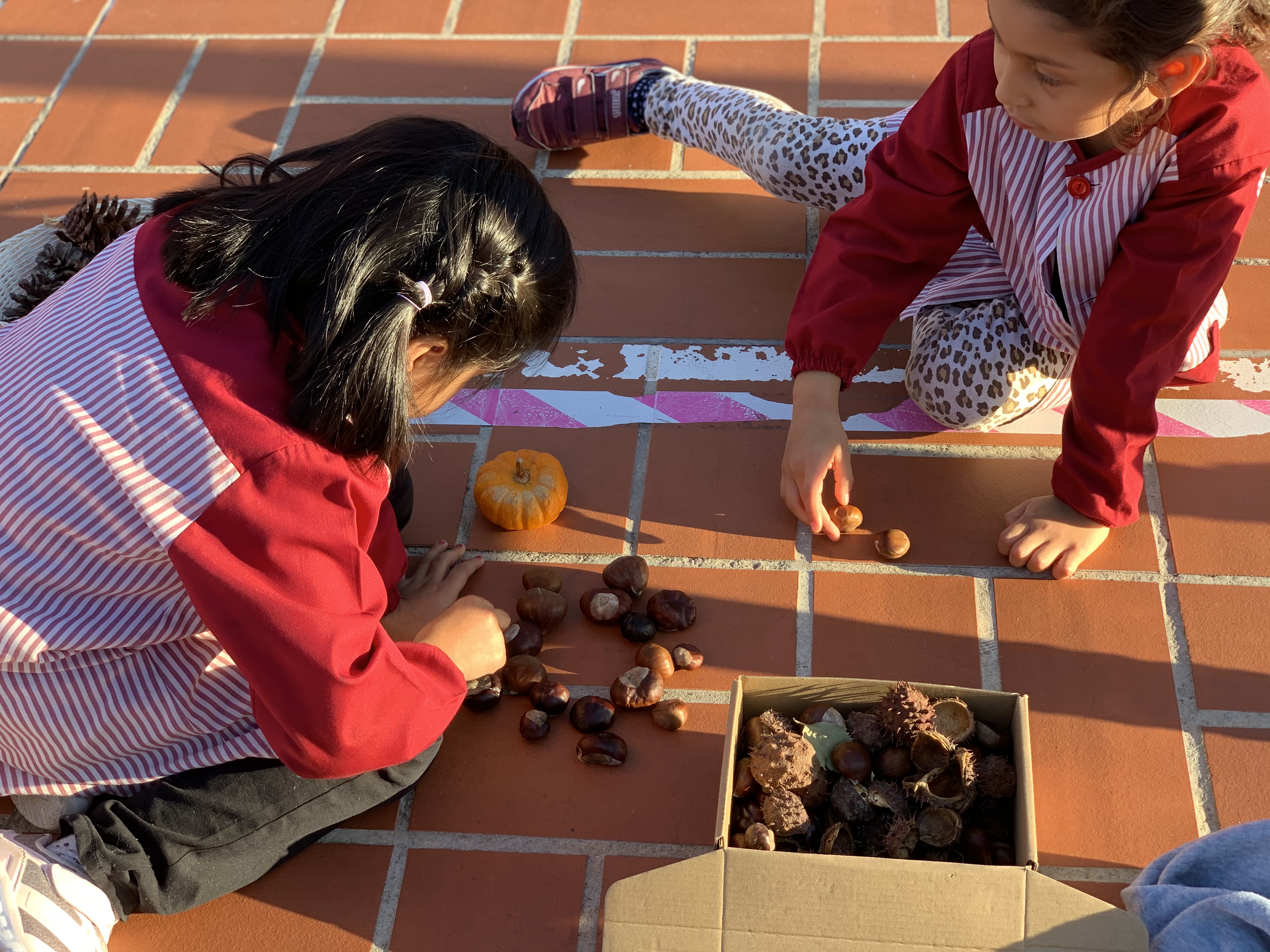 Els alumnes de les dues classes de P5 ens hem començat a acomiadar dels elements de la tardor que havíem anat recollint durant aquestes setmanes. Comença a fer fred i s’acosta un canvi d’estació que ens fa aprofitar uns últims dies experimentant amb les fulles, les pinyes, els aglans, les castanyes, els pellons…