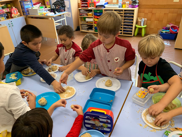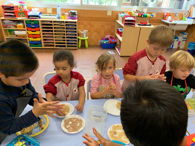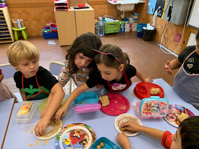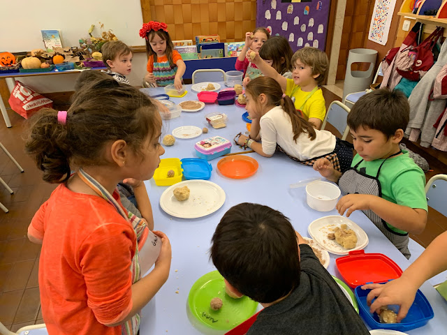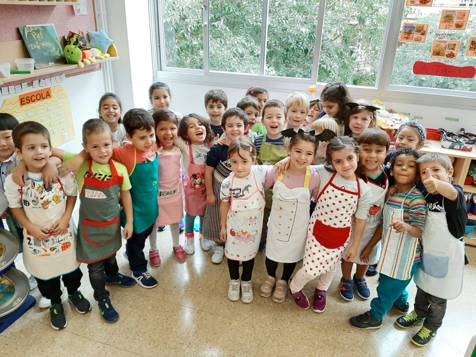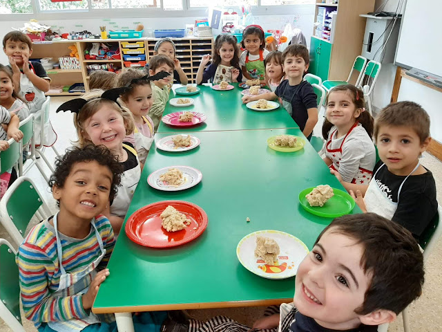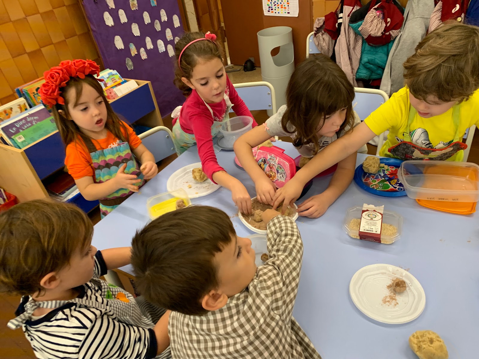 El dijous les nenes i nens de les estrelles i els fantasmes vam fer panellets. Ens vam posar el davantal i mans a la massa! Ametlla mòlta, galetes triturades i llet condensada. Una mica de xocolata i…..nyam nyam!