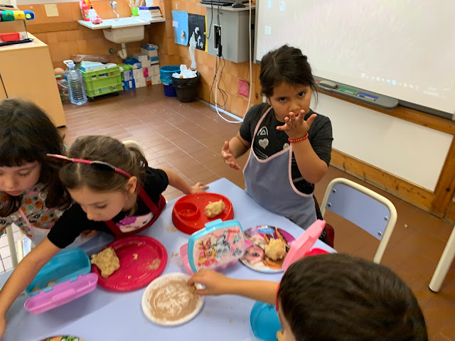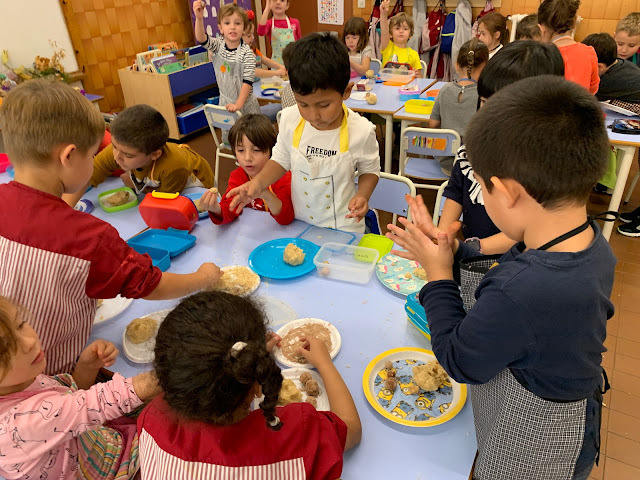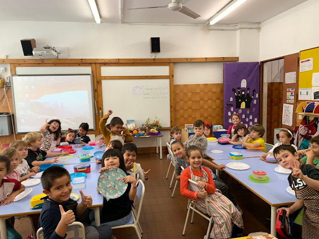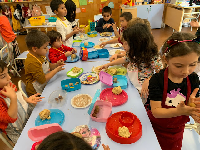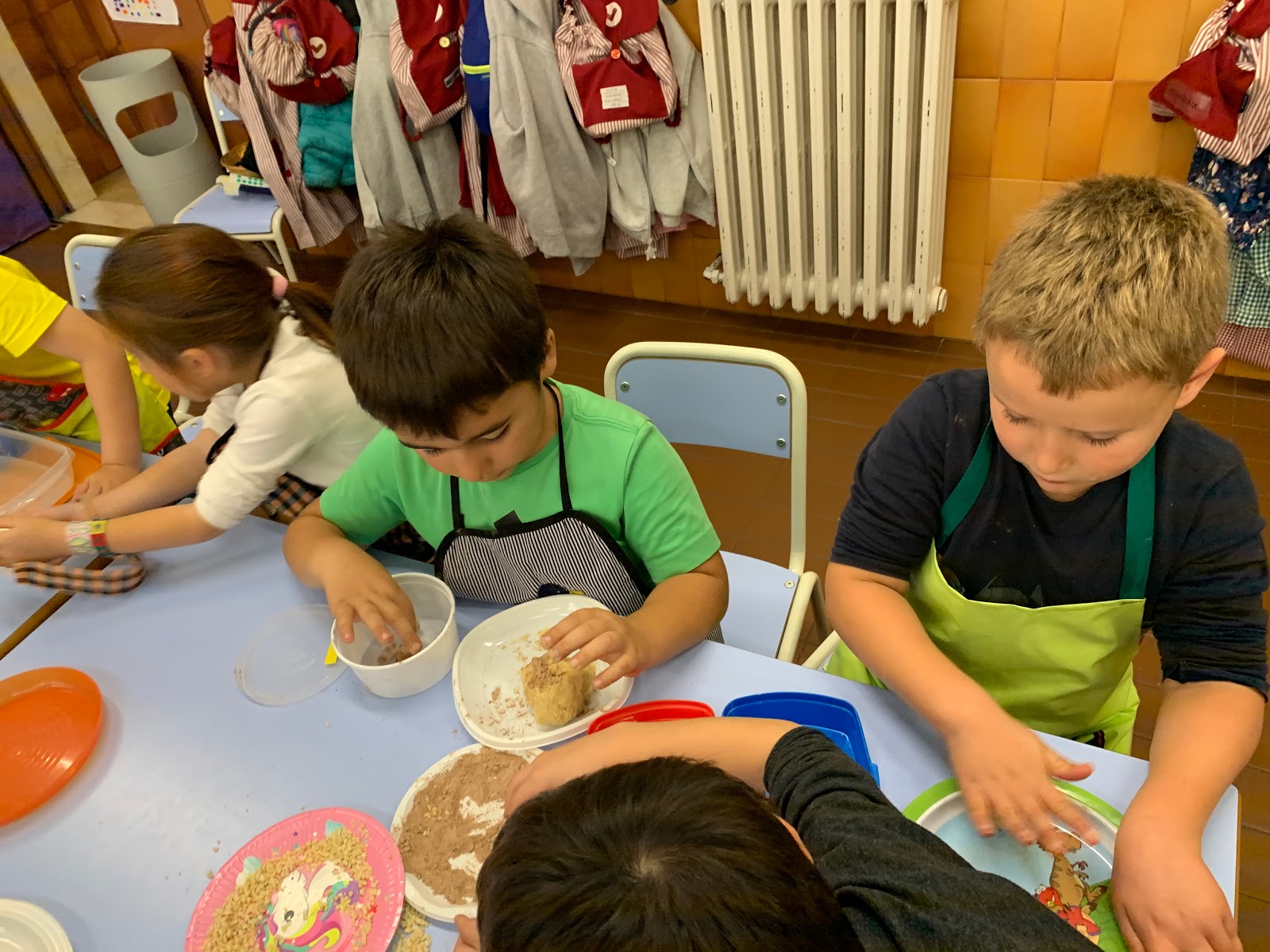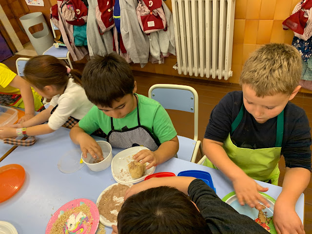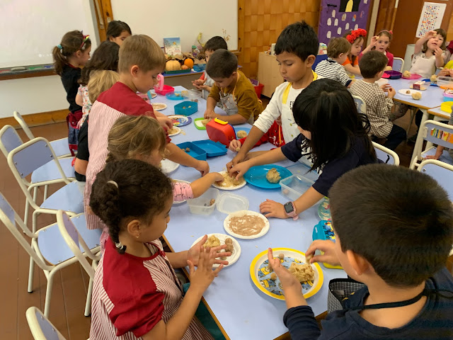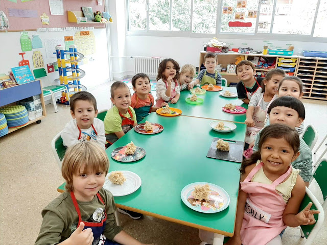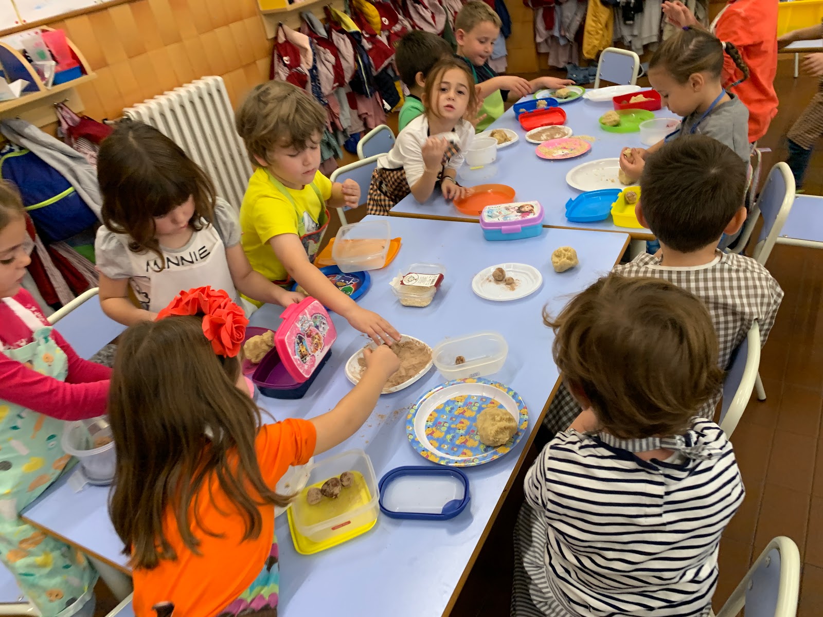 El dijous les nenes i nens de les estrelles i els fantasmes vam fer panellets. Ens vam posar el davantal i mans a la massa! Ametlla mòlta, galetes triturades i llet condensada. Una mica de xocolata i…..nyam nyam!