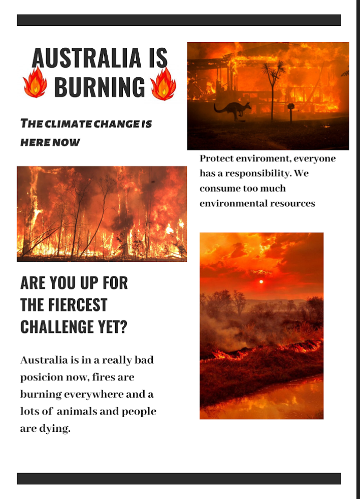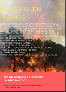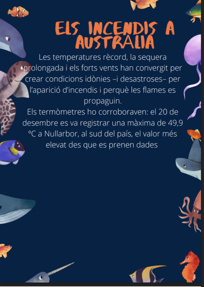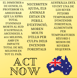 Des del Projecte Terra de 1r d’ESO, hem aturat el temari i ens hem centrat en el que està passant a Austràlia. Els alumnes han estat investigant les causes dels grans incendis que estan cremant per tot el territori. Han treballat en grups cooperatius i han creat alguns pòsters informatius anunciant el desastre ambiental. Aquí us els presentem: