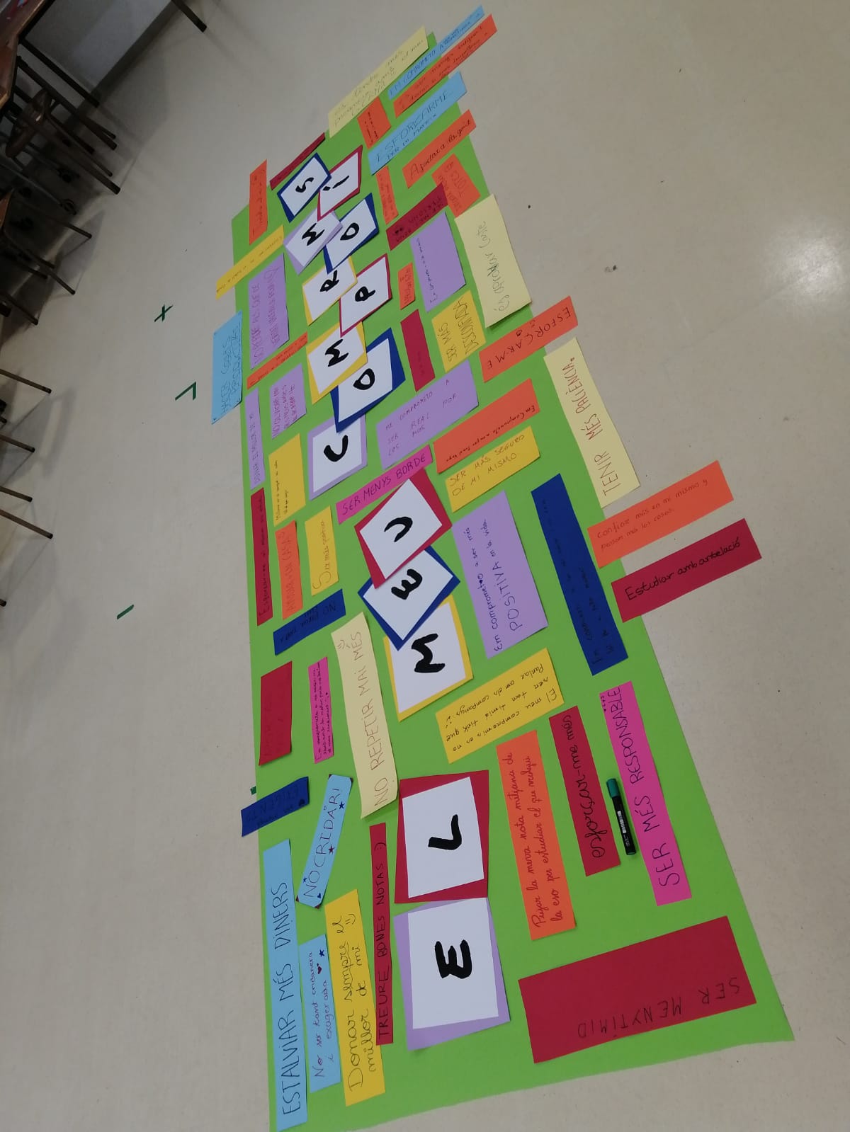 De seguida s’han posat a escriure el seu compromís en retalls de cartolines de colors, i han elaborat un mural xul·líssim amb uns compromisos molt agossarats només per gent molt valent.