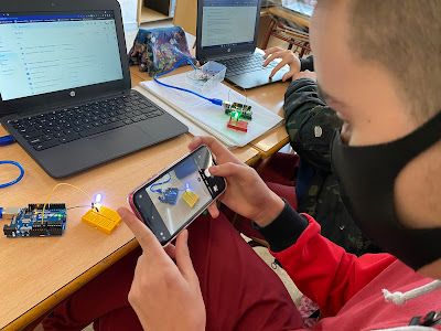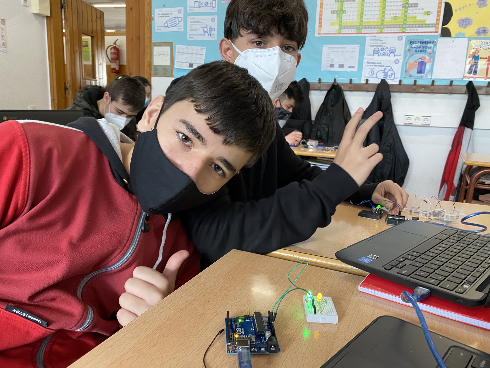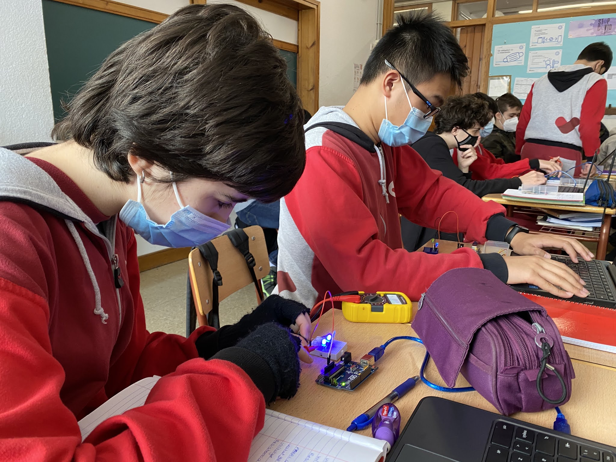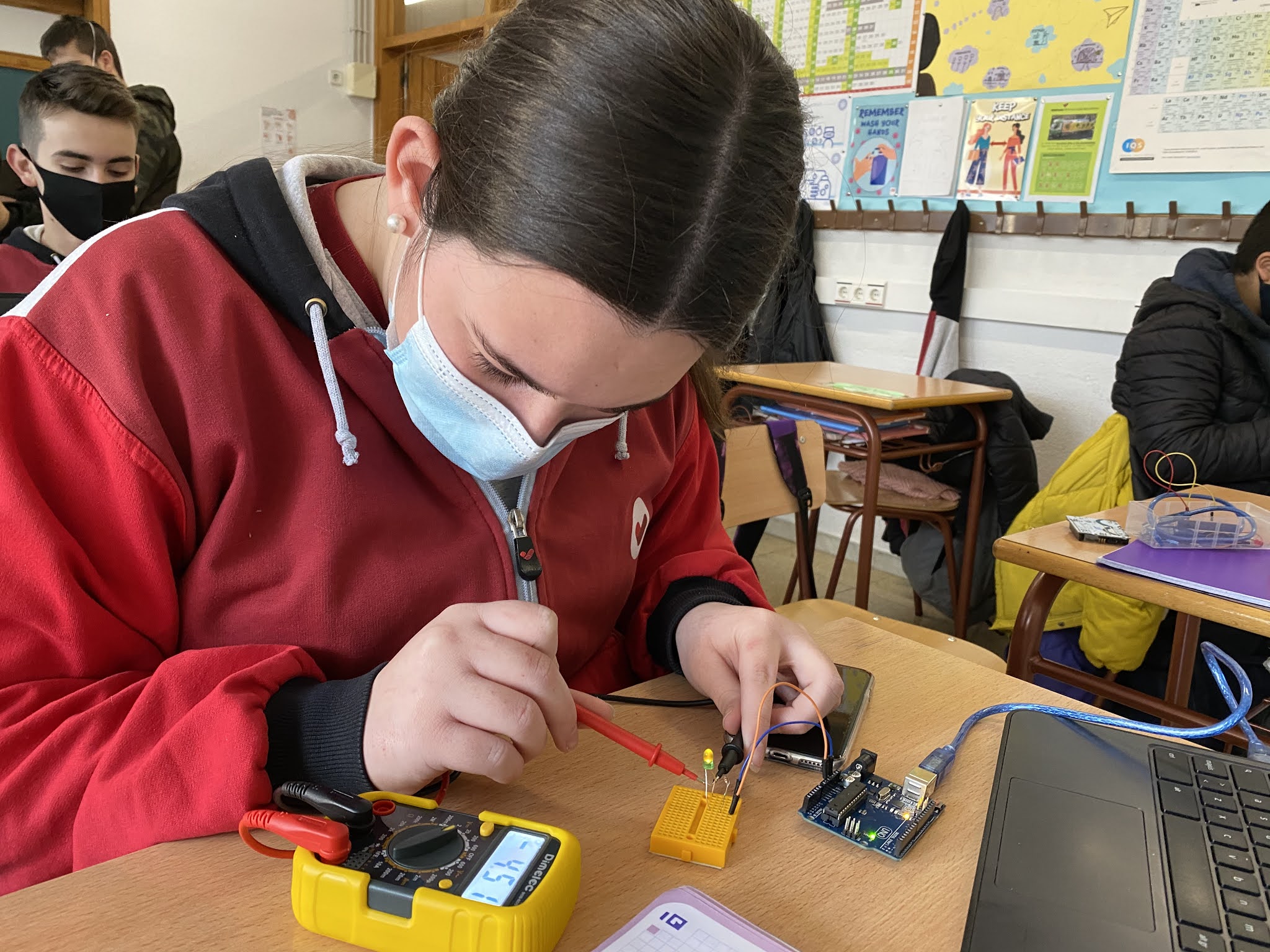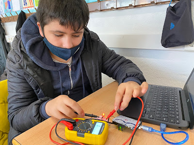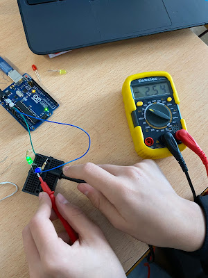 En aquesta pràctica els alumnes estan verificant que allò que van aprendre a nivell teòric sobre els circuits en sèrie i en paral·lel és cert. Han de posar uns leds o bé en sèrie o bé en paral·lel i verificar que els voltatges compleixen allò que hem estudiat en teoria. Per poder fer-ho fan servir un polímetre per mesurar els voltatges i les resistències i un arduino com a font d’alimentació. L’arduino és un dispositiu multitasca que més endavant estudiarem com programar-lo per tal que faci el que desitgem. En uns mesos, ho podreu veure aquí mateix.