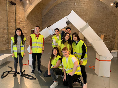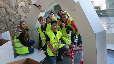 En la primera part hem anat a l’espai del Convent, vestits amb armilles grogues i dividits en dos grups, ens han convidat a construir diferents elements: una torre, un arc i una estructura refugi en la que hi capiguéssim tots…Hem participat activa i creativament!
