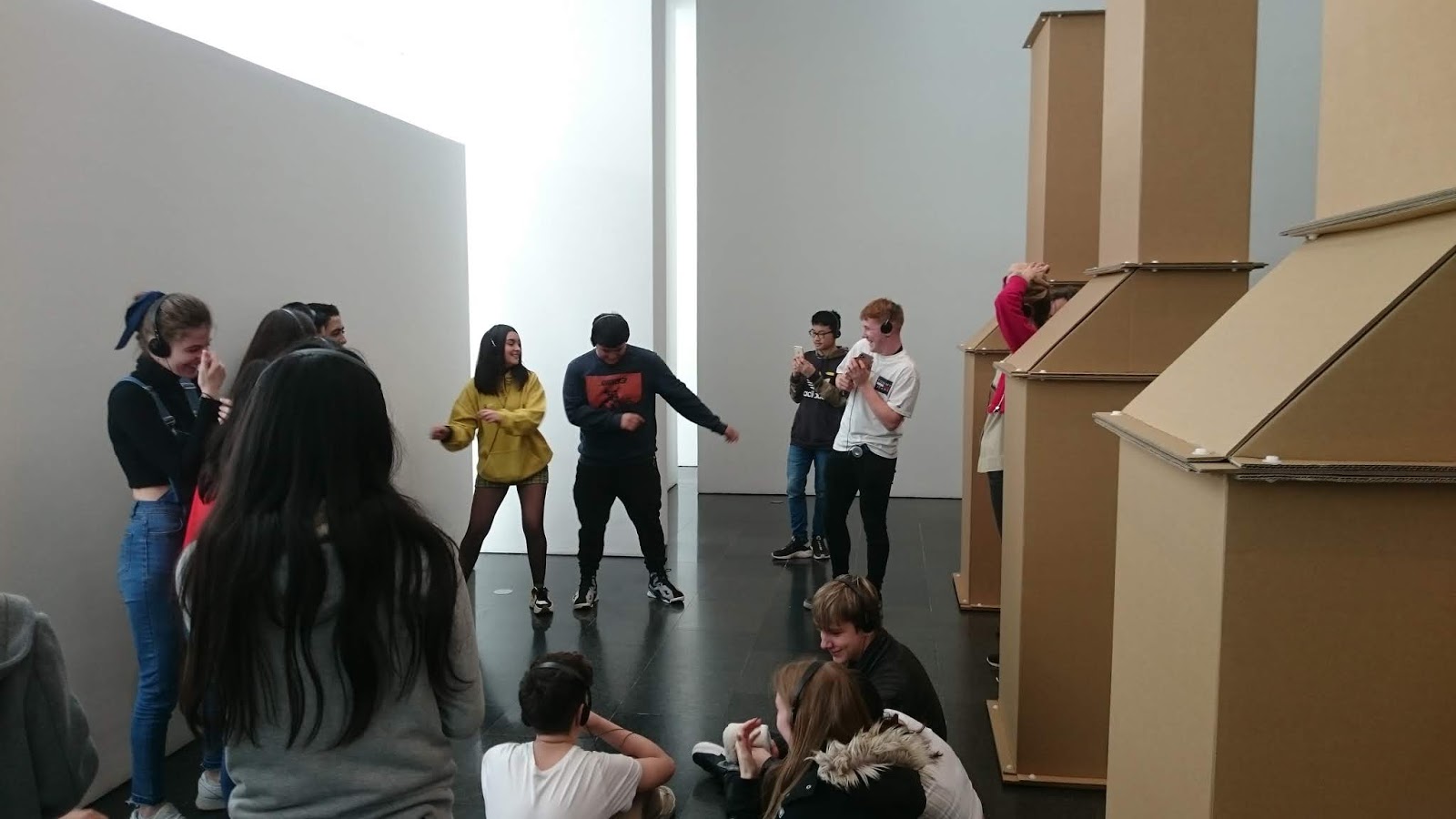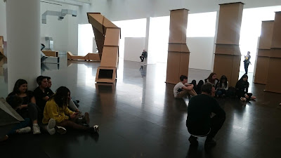 En la segona part, hem retornat al MACBA, per tal de conèixer l’obra de l’artista, des dels primers dibuixos i pintures, passant pels seus relleus d’alumini, fins les seves escultures modulars. El recorregut l’hem fet a través de la proposta sonora dels nostres guies, els quals ens han conduït a través de les diferents obres minimalistes i conceptuals .
